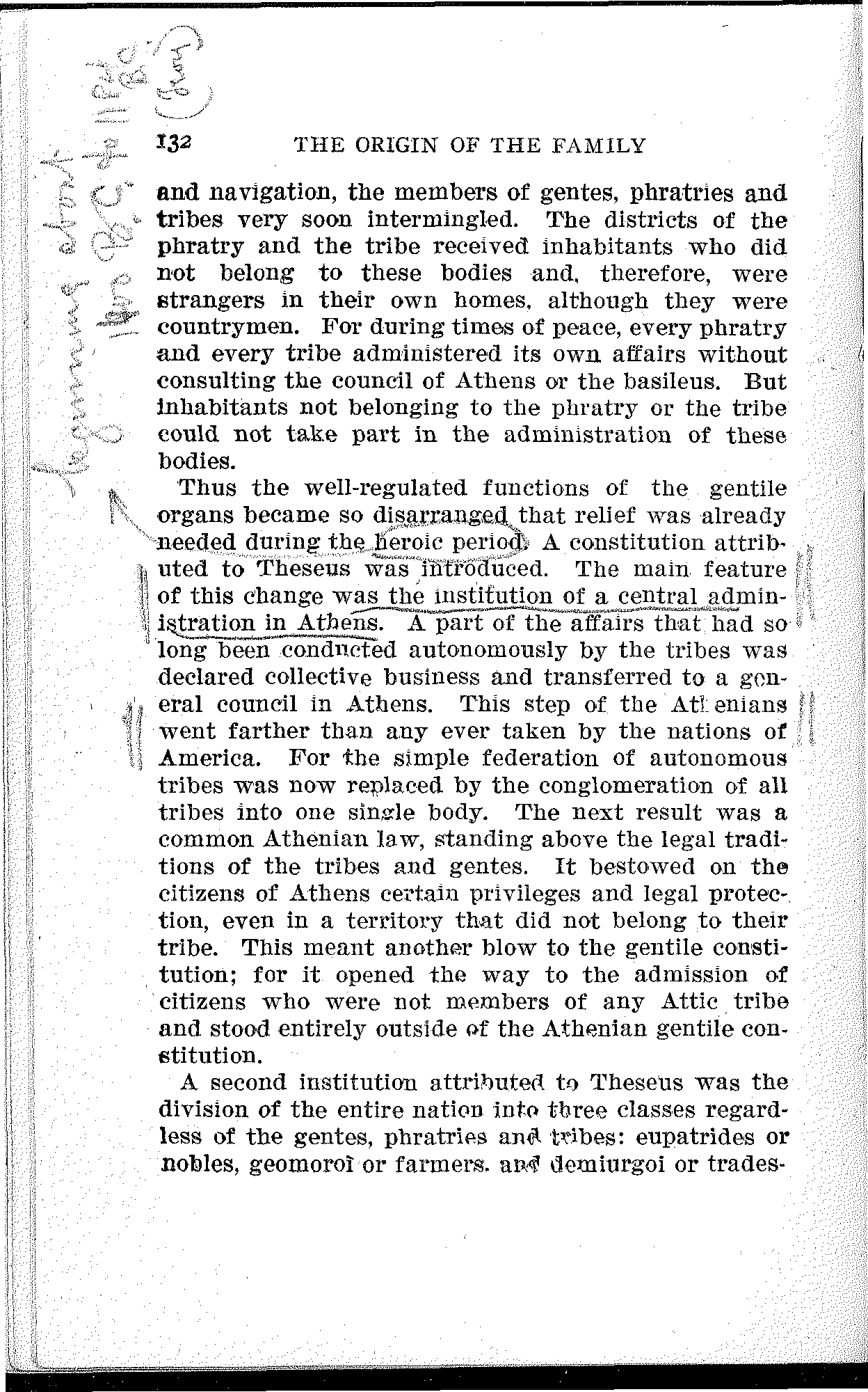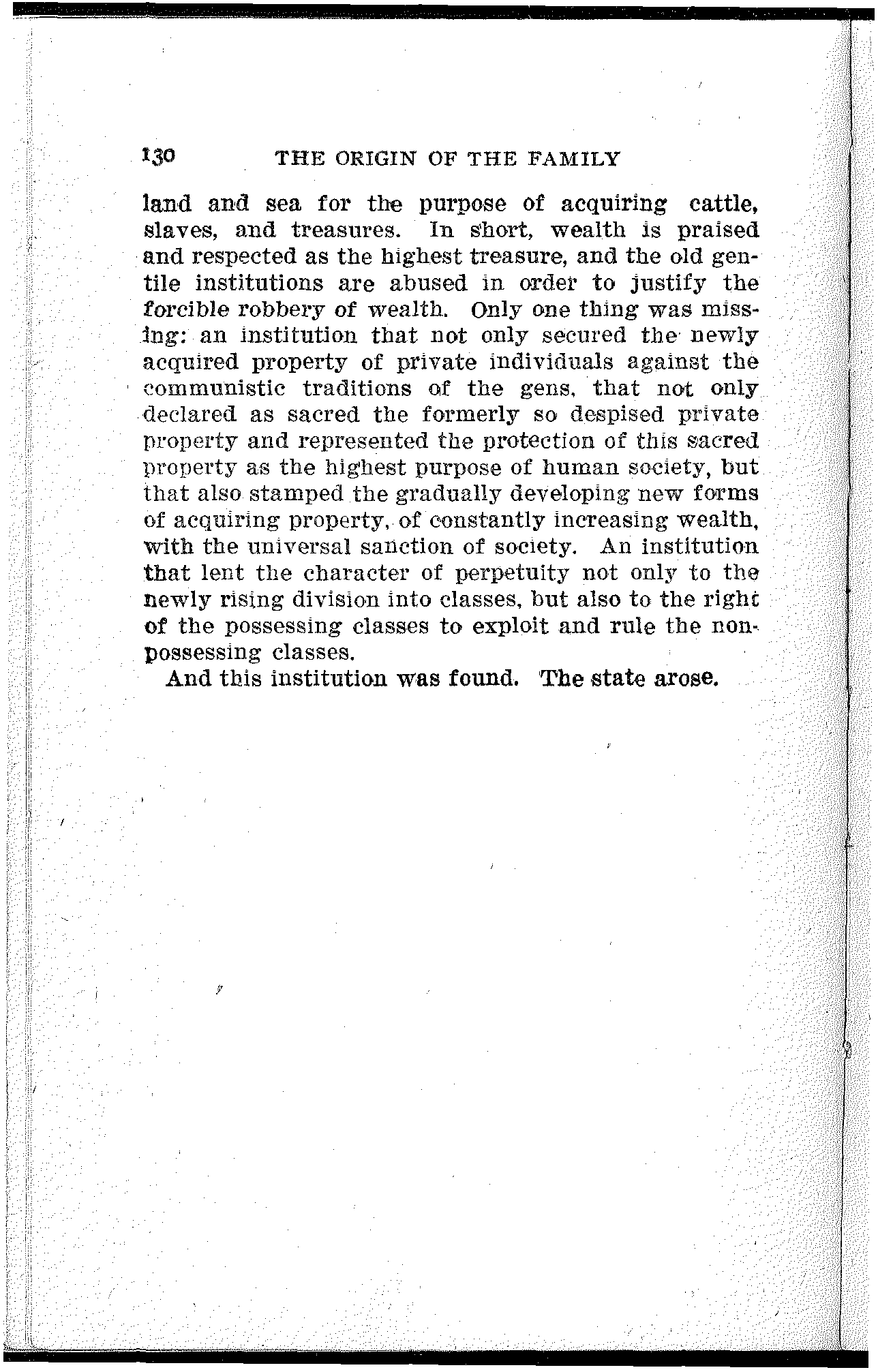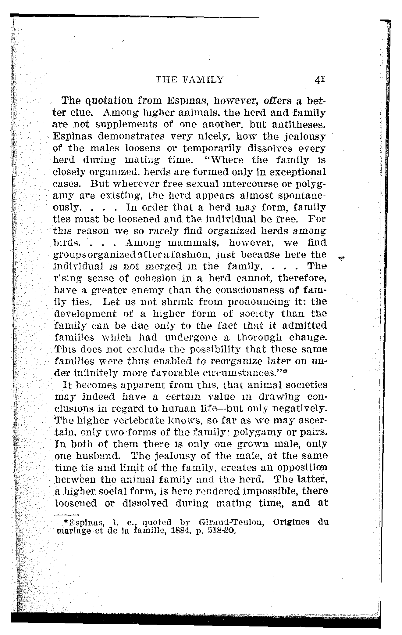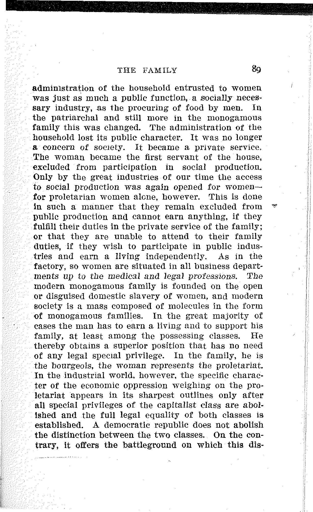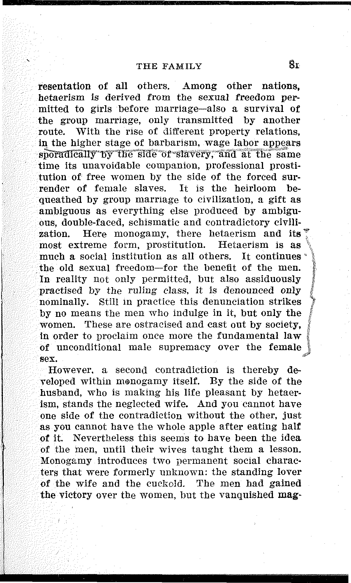 My work has been translated into different languages. First into Italian; L'origine della famiglia, della proprietá privata e dello stato, versione riveduta dall' autore, di Pasquale Martignetti; Benevento, 1885.[13] Then into Roumanian: Origina familei, proprietatei private si a statului, traducere de Ivan Nadejde, in the Jassy periodical "Contemporanul," September, 1885, to May, 1886. Furthermore into Danish: Familjens, Privatejendommens og Statens Oprindelse, Dansk, af Forfatteren gennemgaaet Udgave, besörget af Gerson Trier, Kjoebenhavn, 1888. A French translation by Henri Ravé, founded on the present German edition, is under the press.