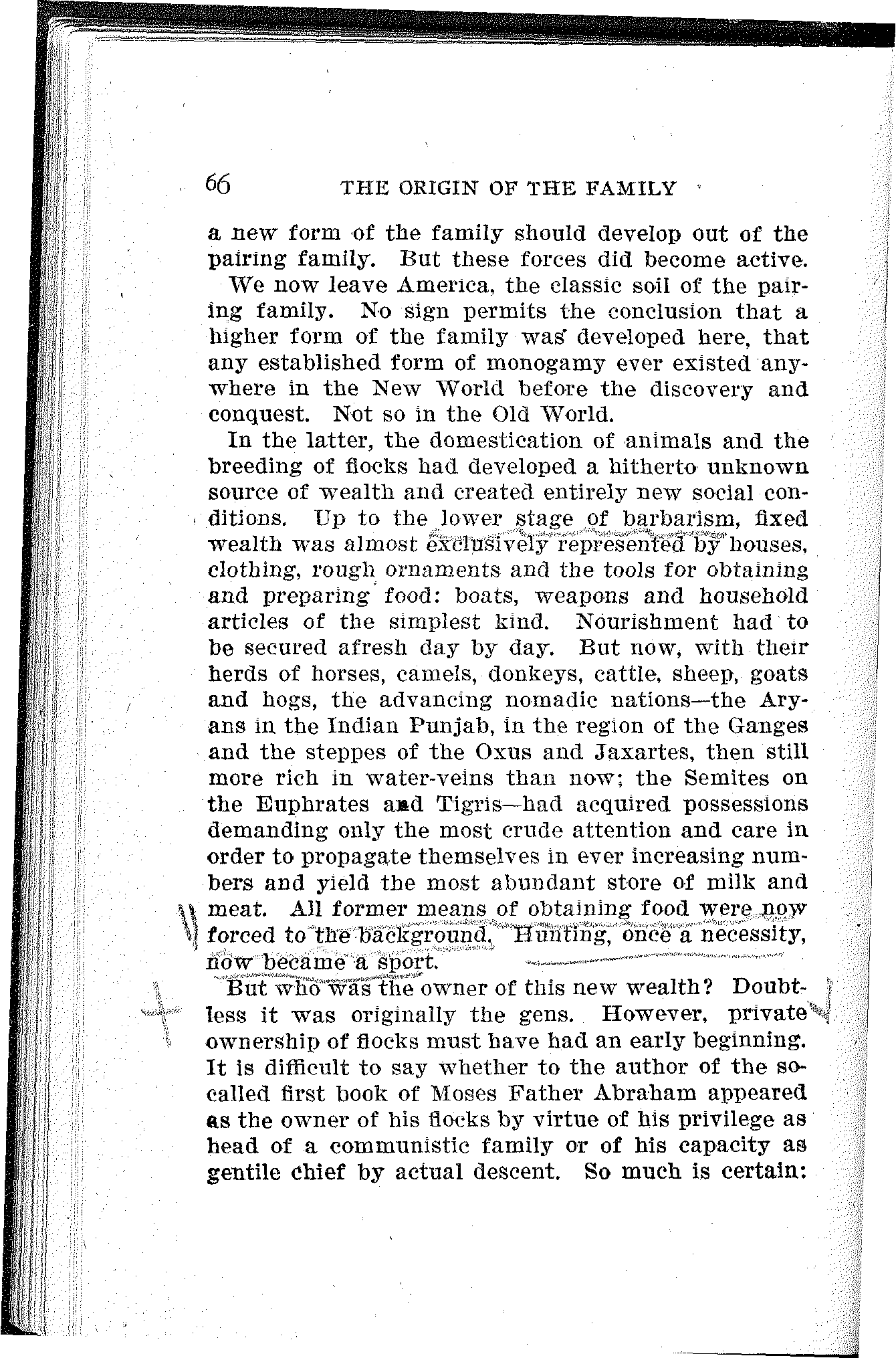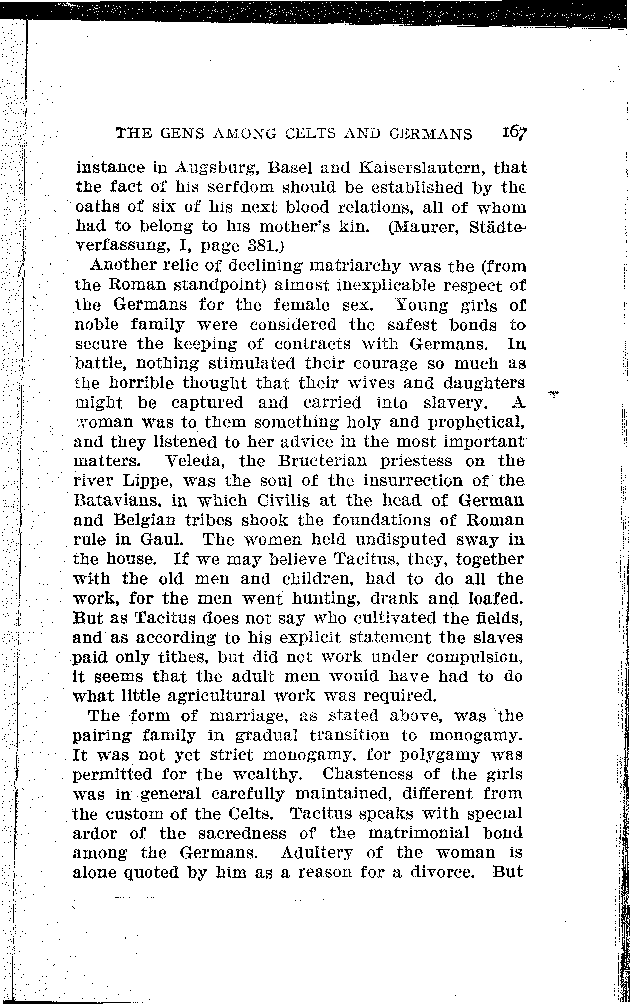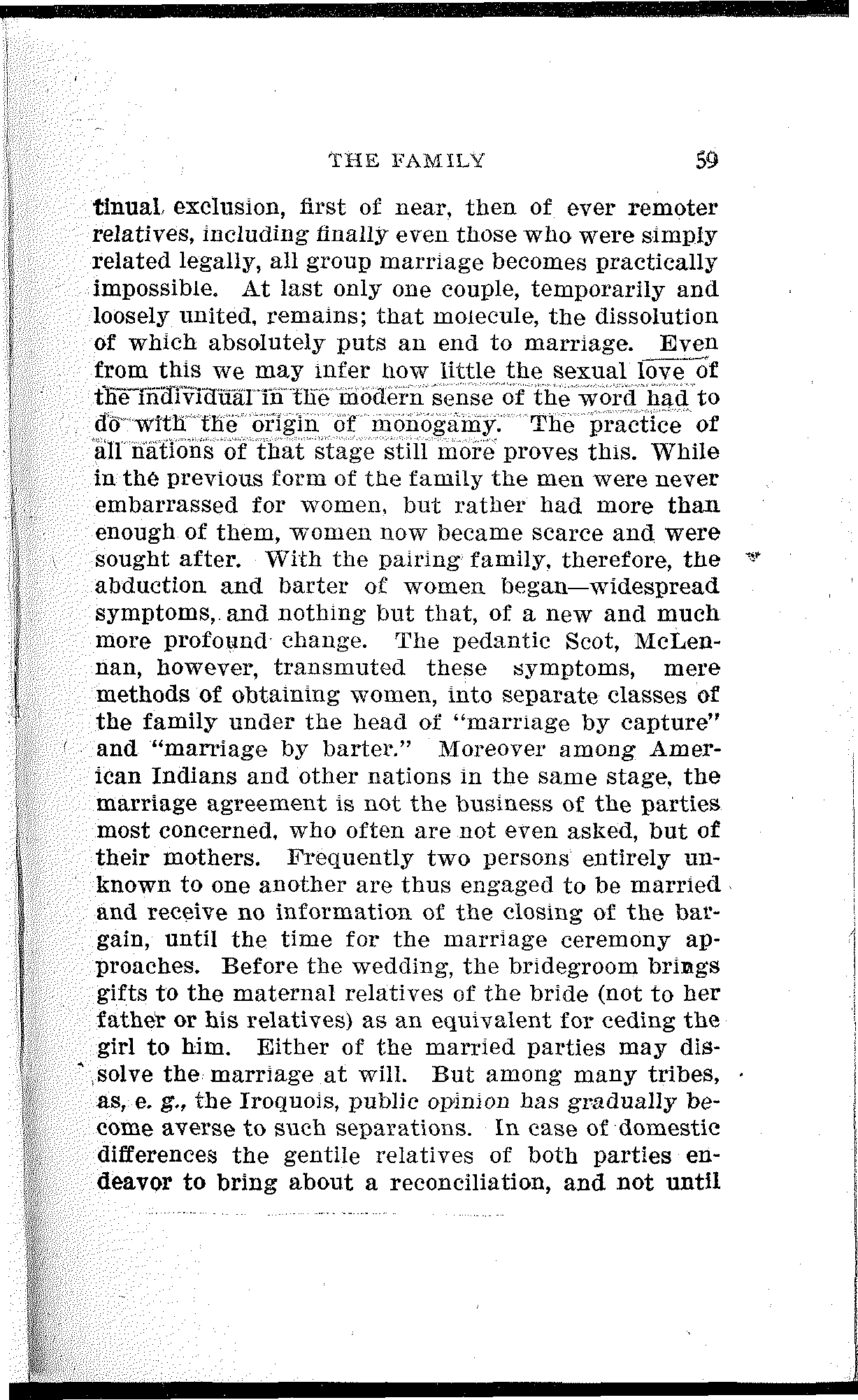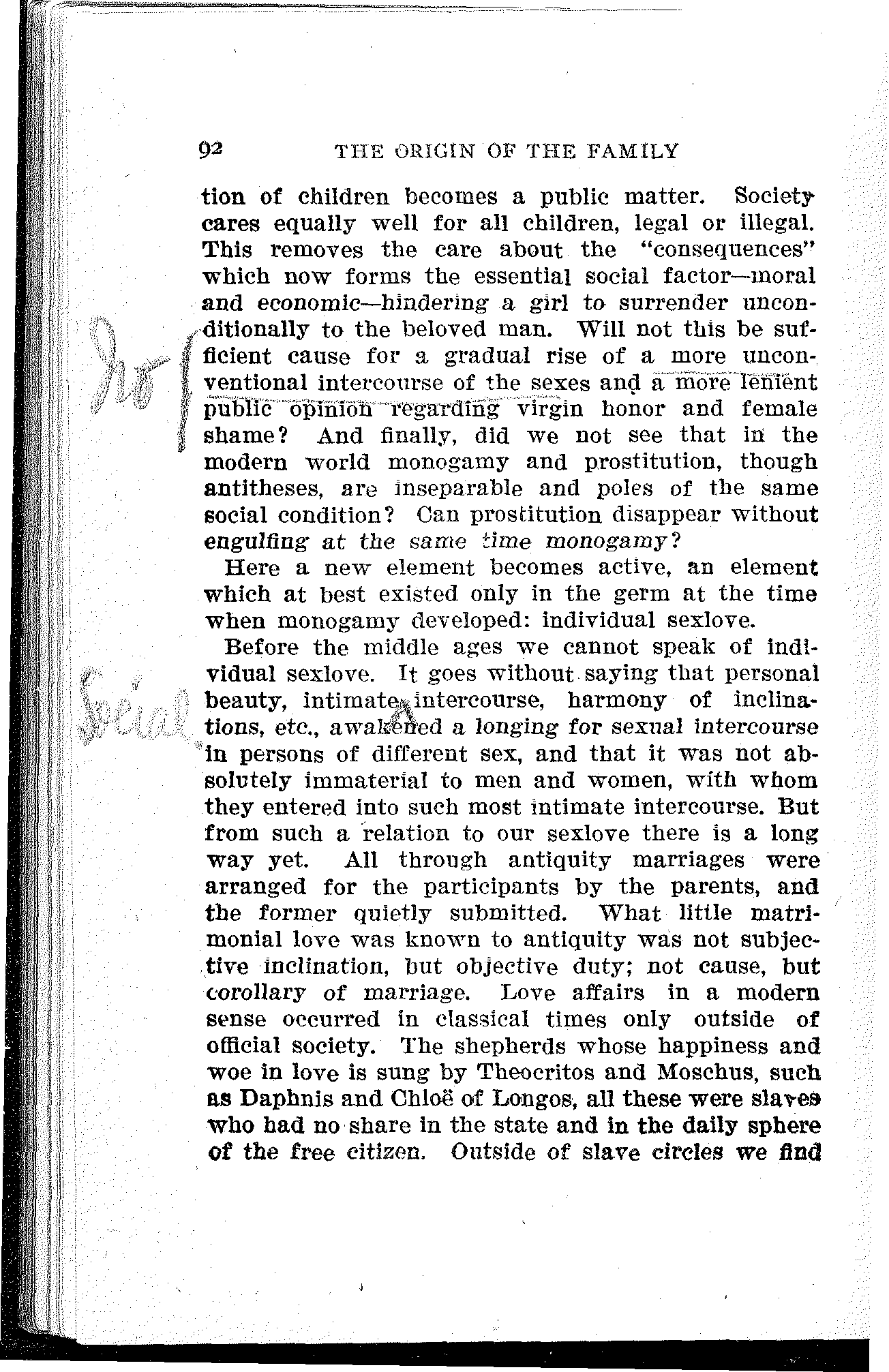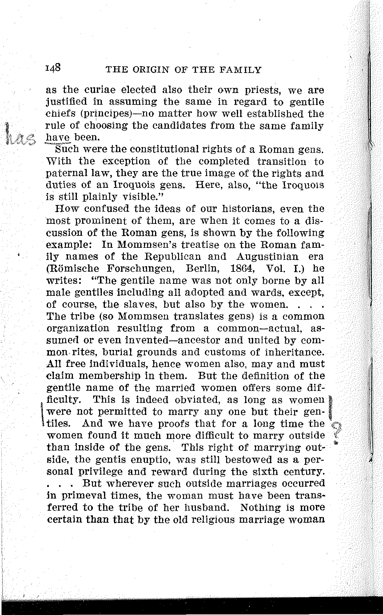 My work has been translated into different languages. First into Italian; L'origine della famiglia, della proprietá privata e dello stato, versione riveduta dall' autore, di Pasquale Martignetti; Benevento, 1885.[13] Then into Roumanian: Origina familei, proprietatei private si a statului, traducere de Ivan Nadejde, in the Jassy periodical "Contemporanul," September, 1885, to May, 1886. Furthermore into Danish: Familjens, Privatejendommens og Statens Oprindelse, Dansk, af Forfatteren gennemgaaet Udgave, besörget af Gerson Trier, Kjoebenhavn, 1888. A French translation by Henri Ravé, founded on the present German edition, is under the press.
