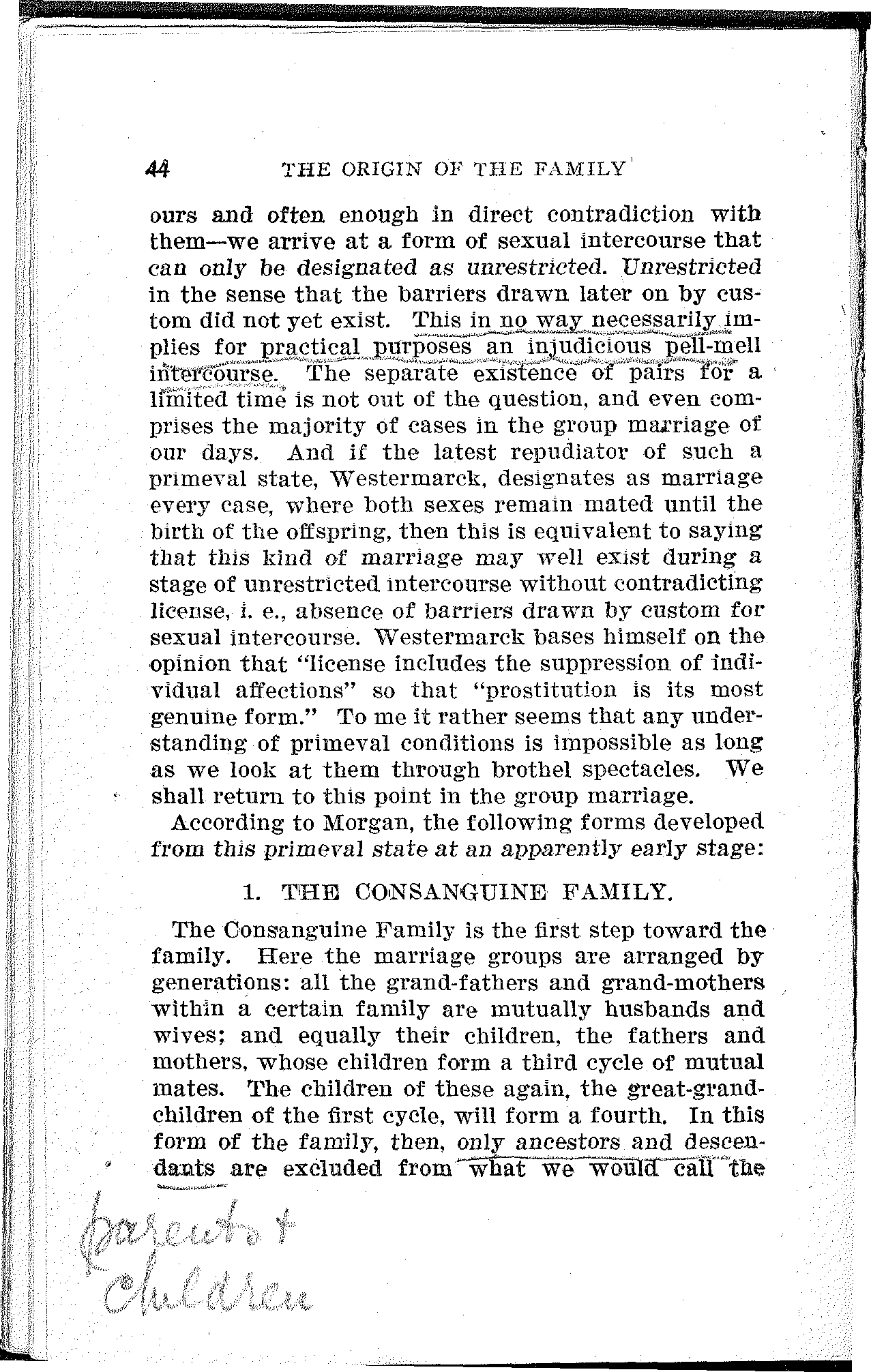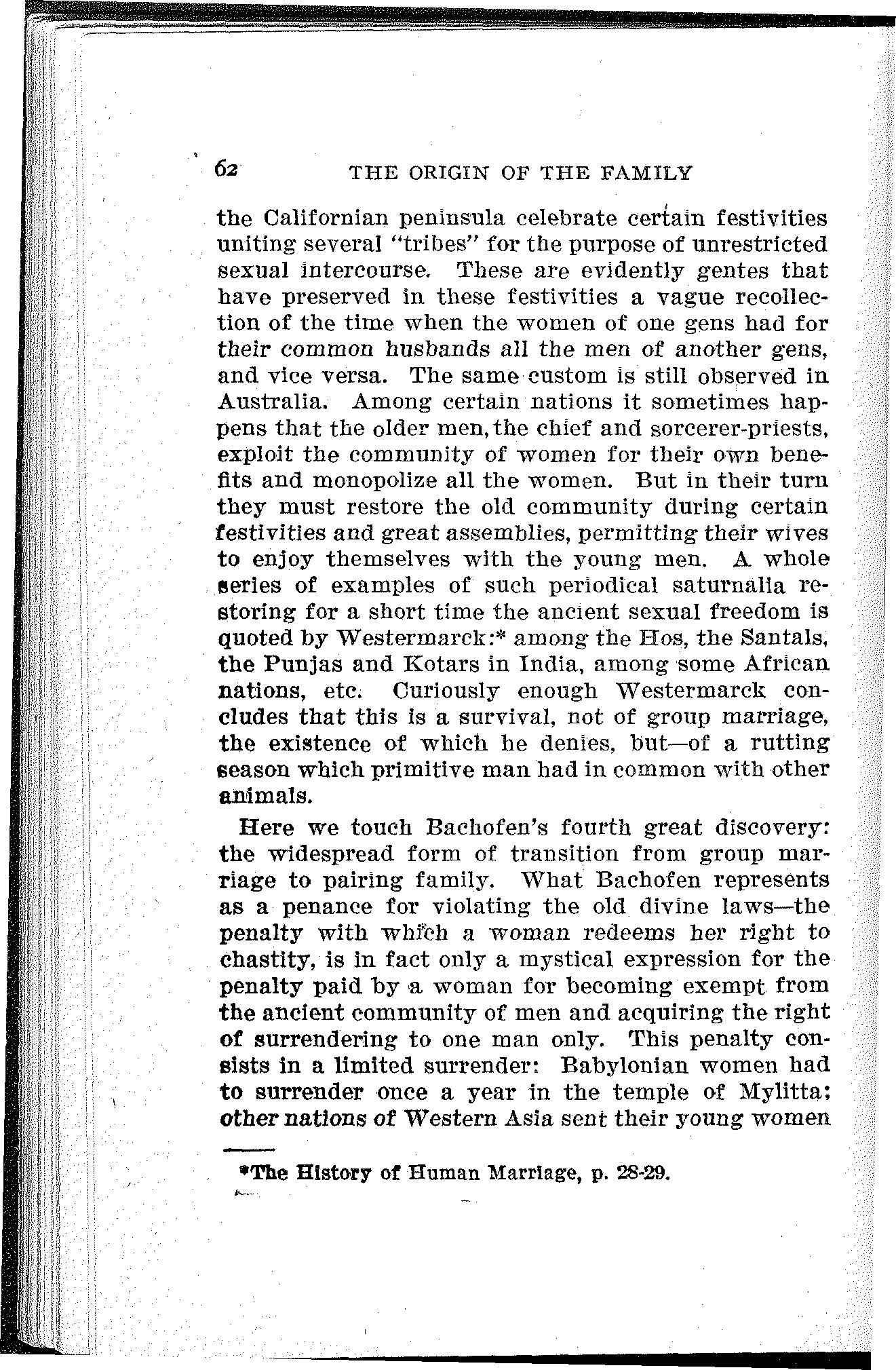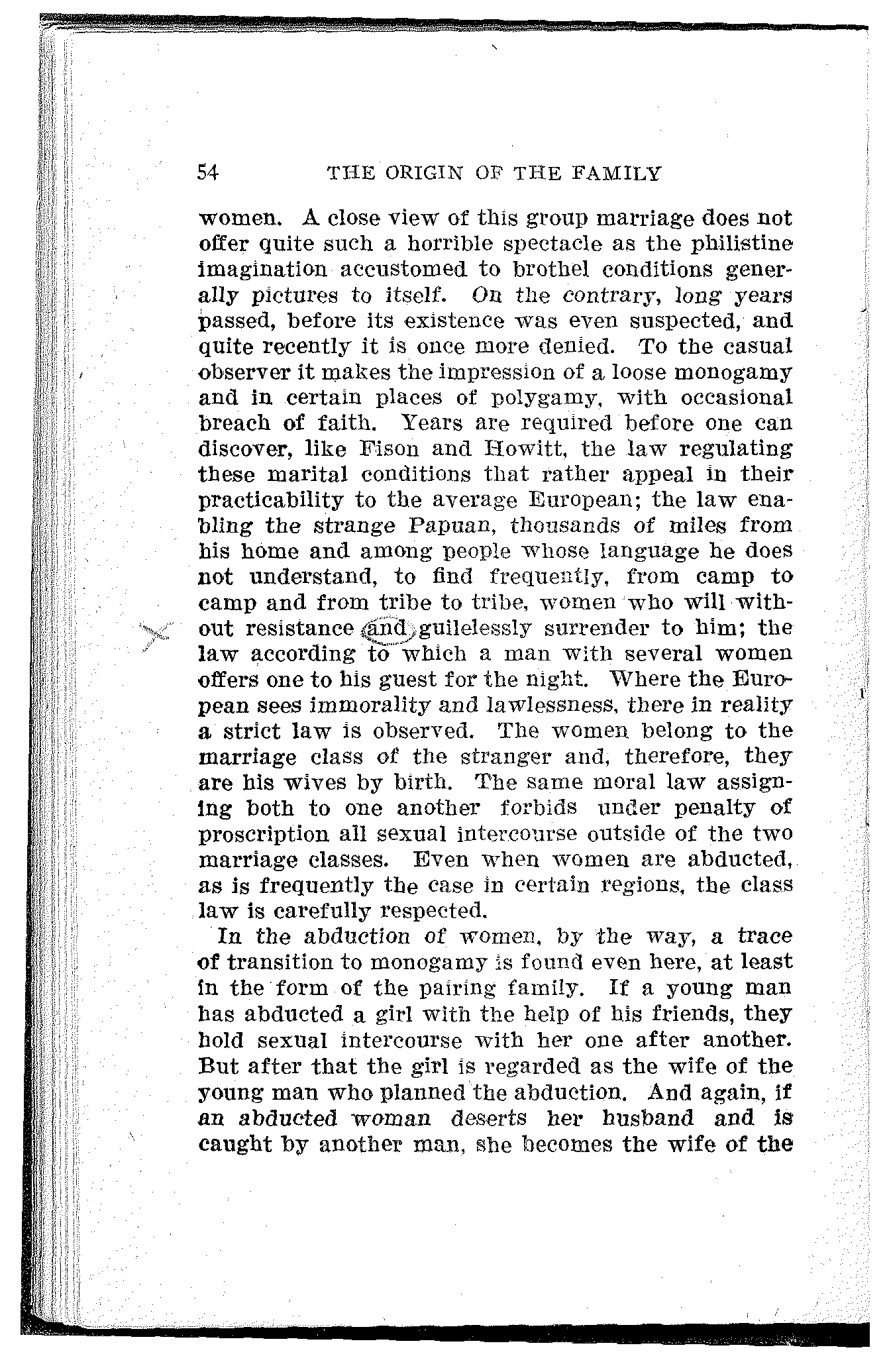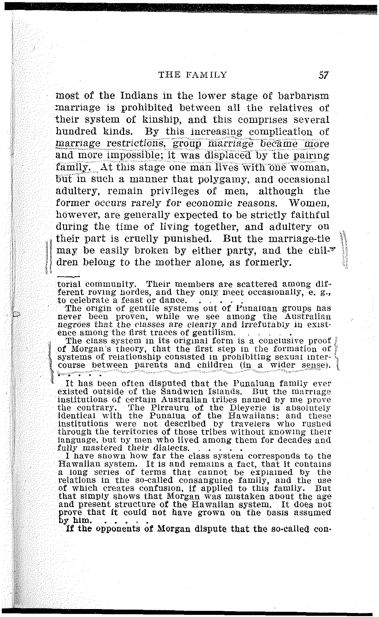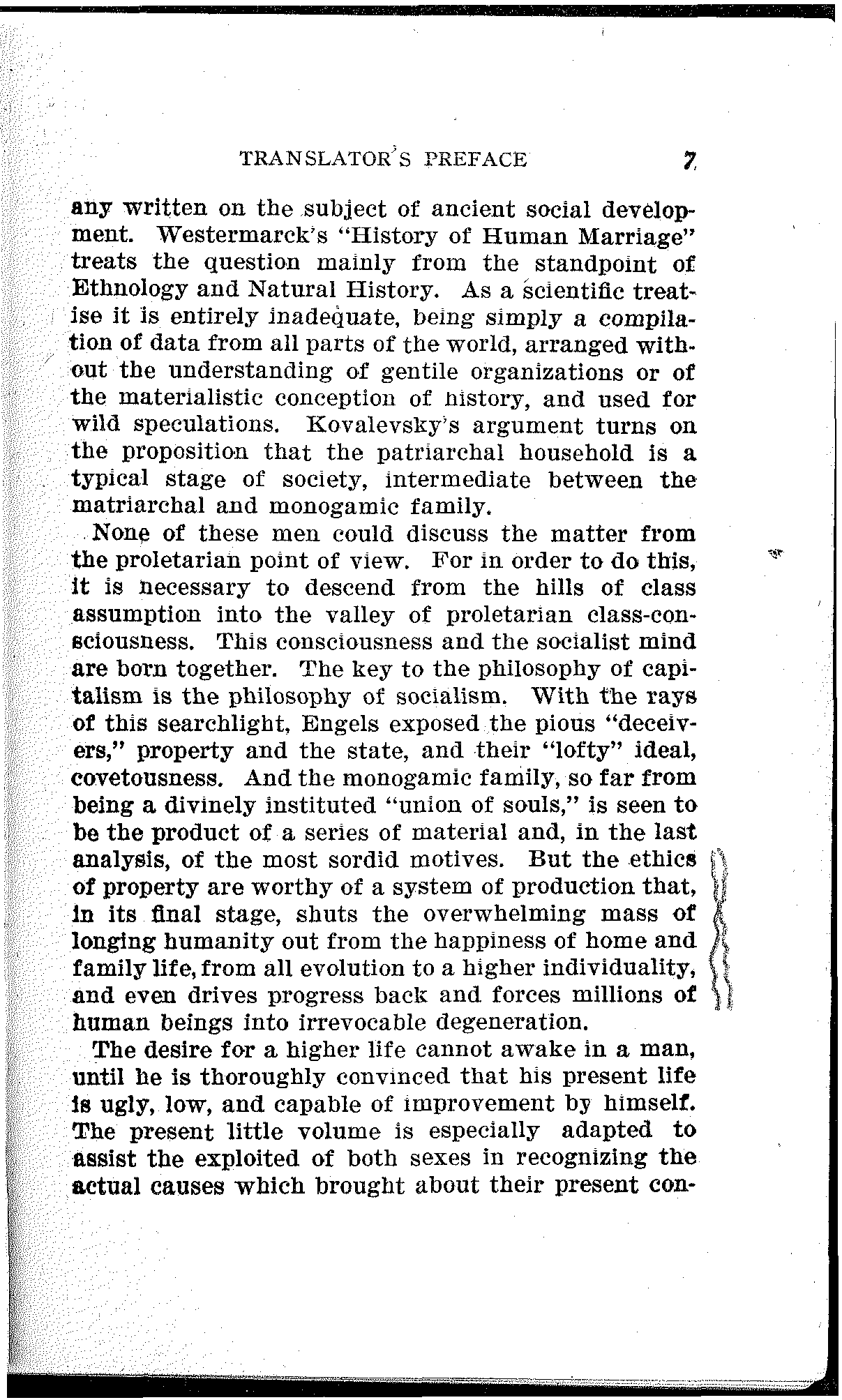 Yet Morgan held that "several thousand years have passed away without the overthrow of the privileged classes, excepting in the United States." But in the days of the trusts, of government by injunction, of sets of 400 with all the arrogance and exclusiveness of European nobility, of aristocratic branches of the Daughters of the Revolution, and other gifts of capitalist development, the modern American workingman will hardly share Morgan's optimistic view that there are no privileged classes in the United States. It must be admitted, however, that to this day Morgan's work is the most fundamental and exhaustive of[7] any written on the subject of ancient social development. Westermarck's "History of Human Marriage" treats the question mainly from the standpoint of Ethnology and Natural History. As a scientific treatise it is entirely inadequate, being simply a compilation of data from all parts of the world, arranged without the understanding of gentile organizations or of the materialistic conception of history, and used for wild speculations. Kovalevsky's argument turns on the proposition that the patriarchal household is a typical stage of society, intermediate between the matriarchal and monogamic family.