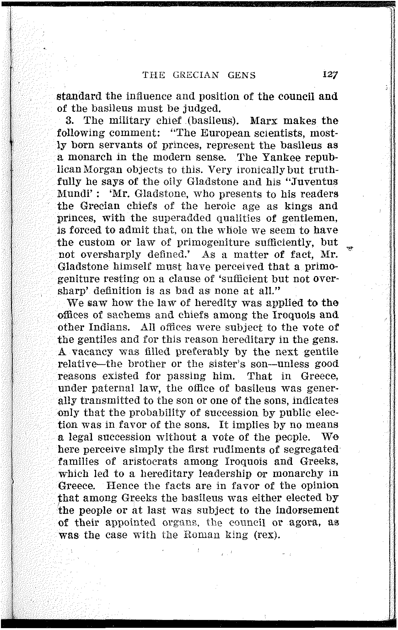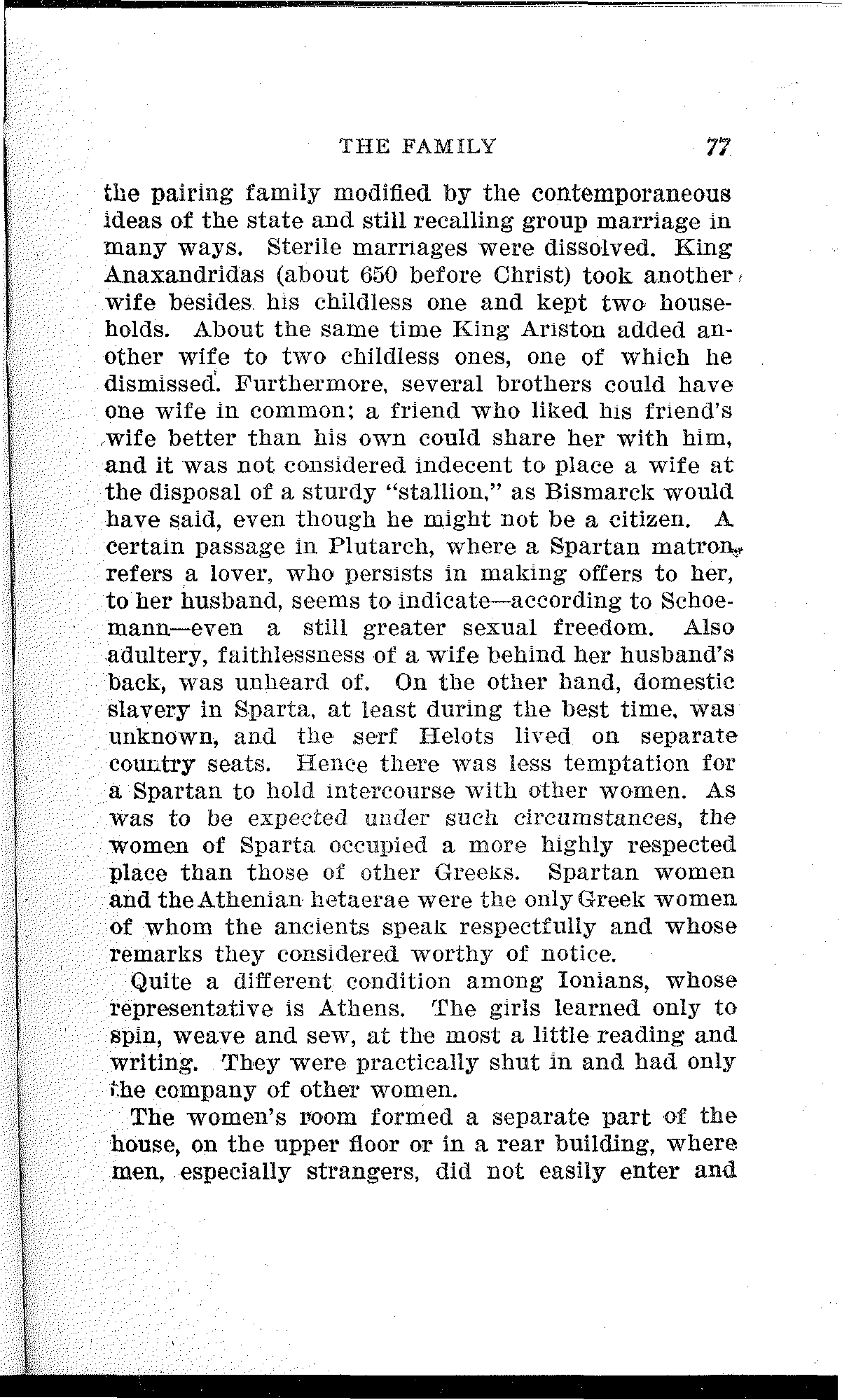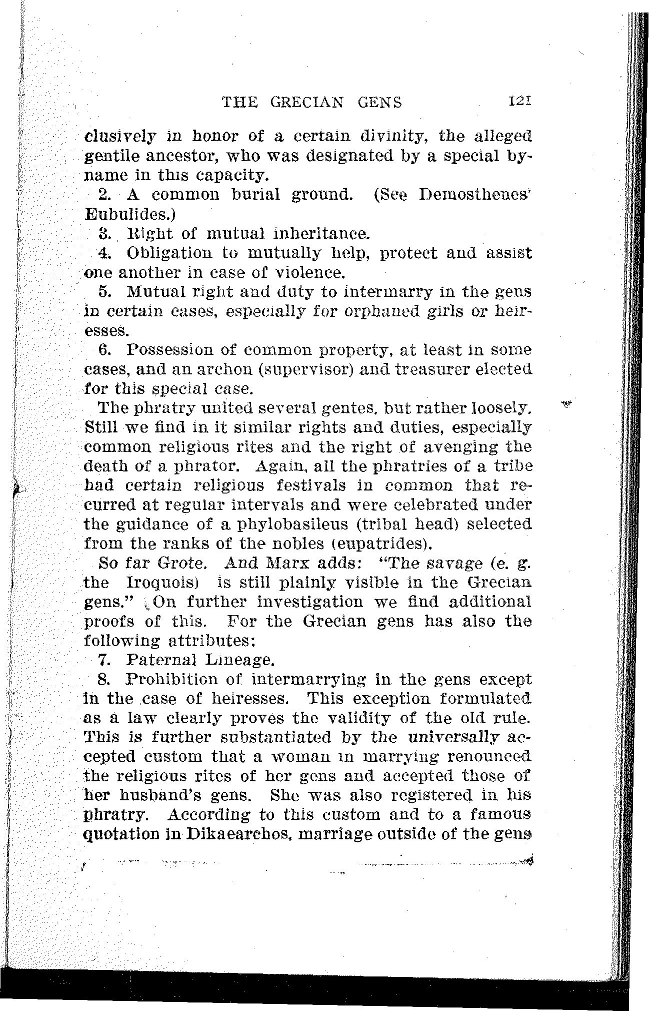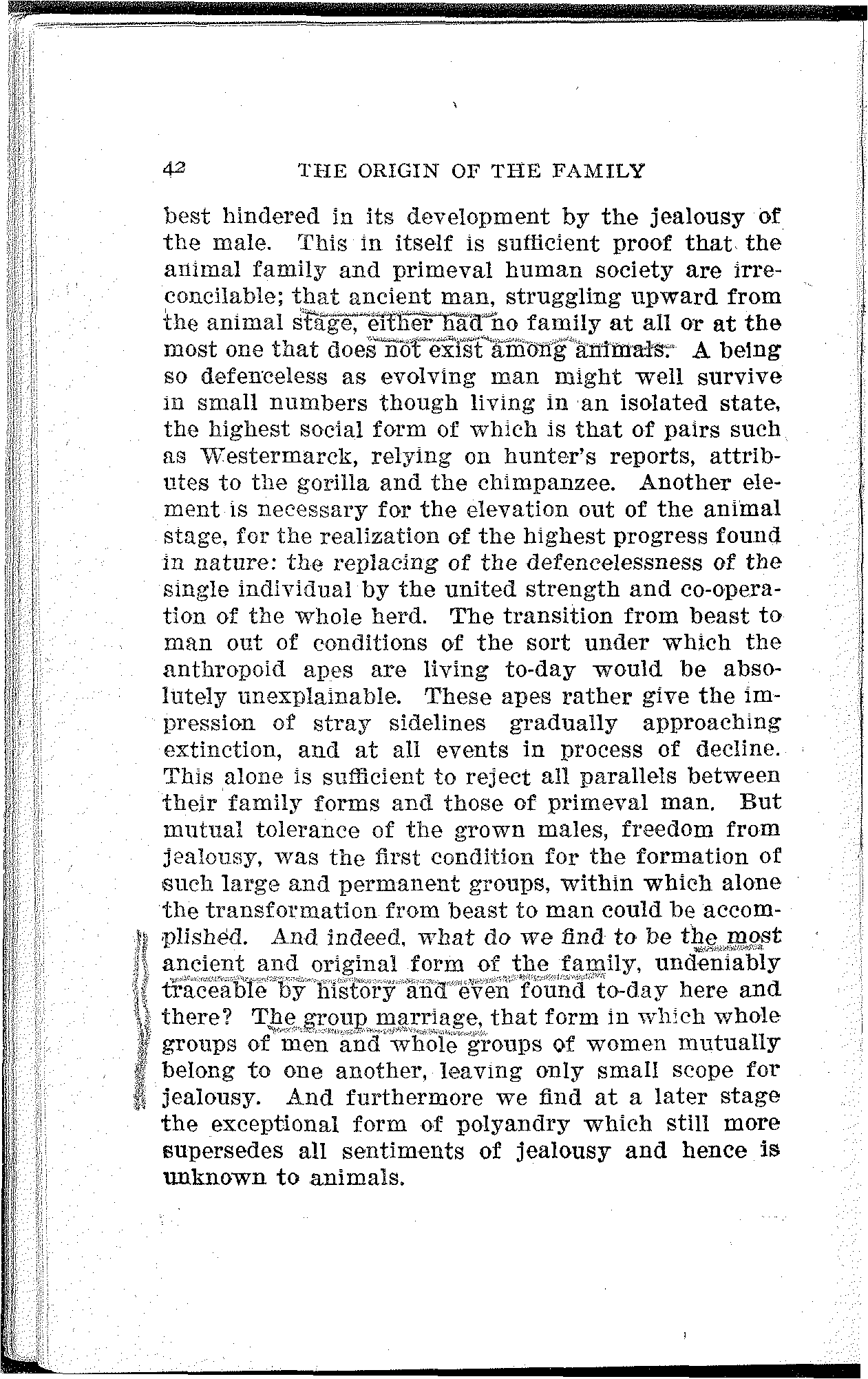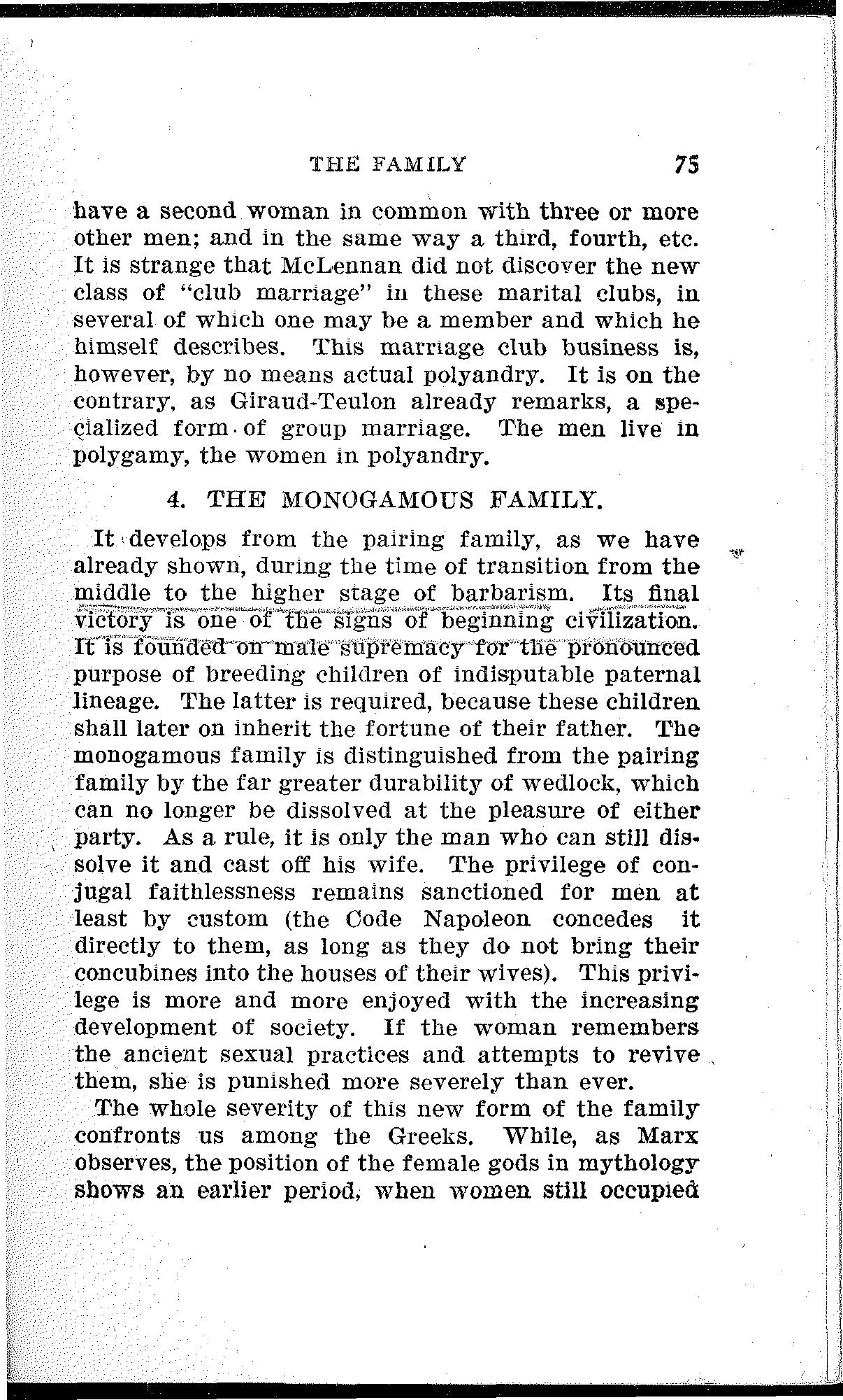 Yet Morgan held that "several thousand years have passed away without the overthrow of the privileged classes, excepting in the United States." But in the days of the trusts, of government by injunction, of sets of 400 with all the arrogance and exclusiveness of European nobility, of aristocratic branches of the Daughters of the Revolution, and other gifts of capitalist development, the modern American workingman will hardly share Morgan's optimistic view that there are no privileged classes in the United States. It must be admitted, however, that to this day Morgan's work is the most fundamental and exhaustive of[7] any written on the subject of ancient social development. Westermarck's "History of Human Marriage" treats the question mainly from the standpoint of Ethnology and Natural History. As a scientific treatise it is entirely inadequate, being simply a compilation of data from all parts of the world, arranged without the understanding of gentile organizations or of the materialistic conception of history, and used for wild speculations. Kovalevsky's argument turns on the proposition that the patriarchal household is a typical stage of society, intermediate between the matriarchal and monogamic family.