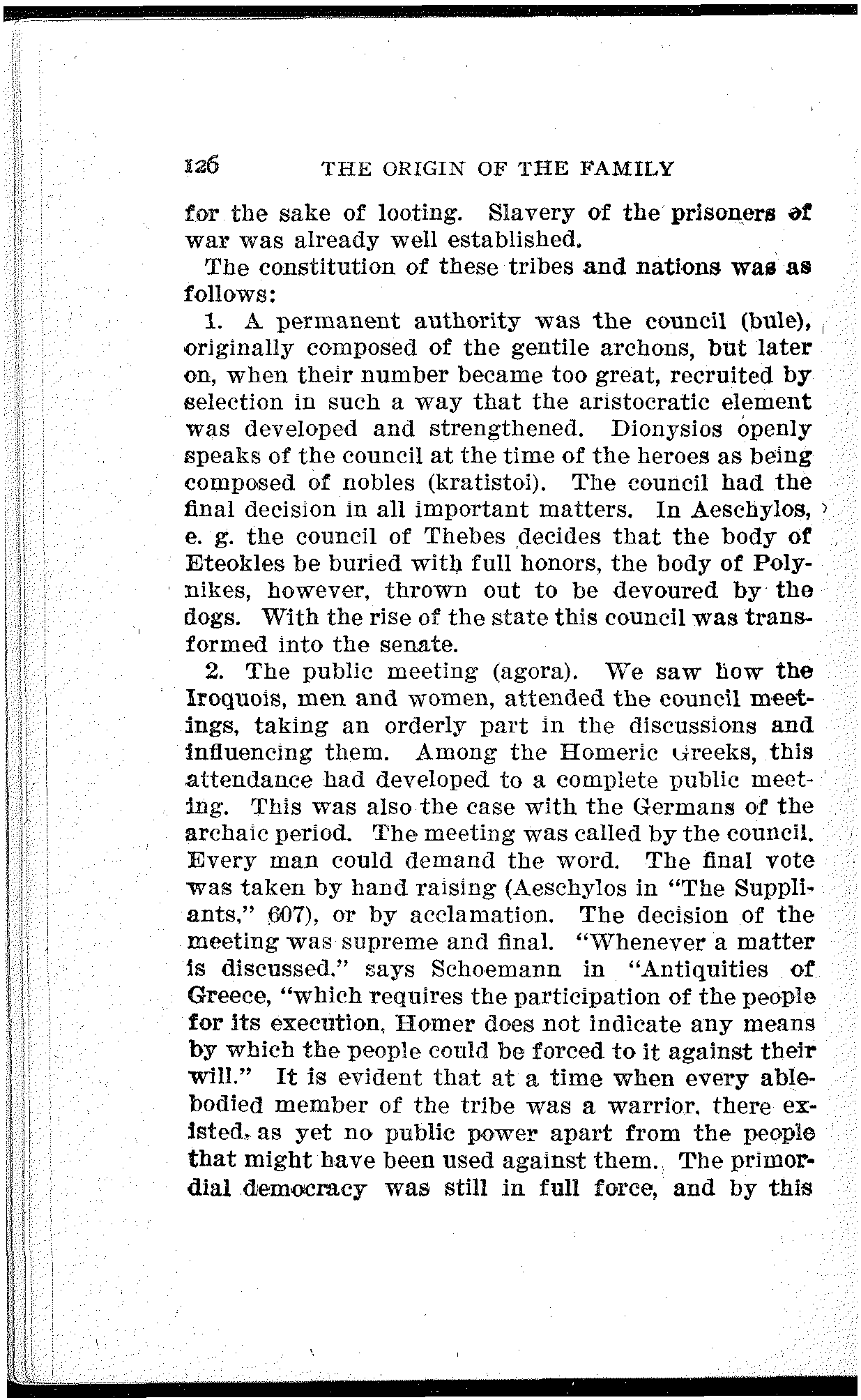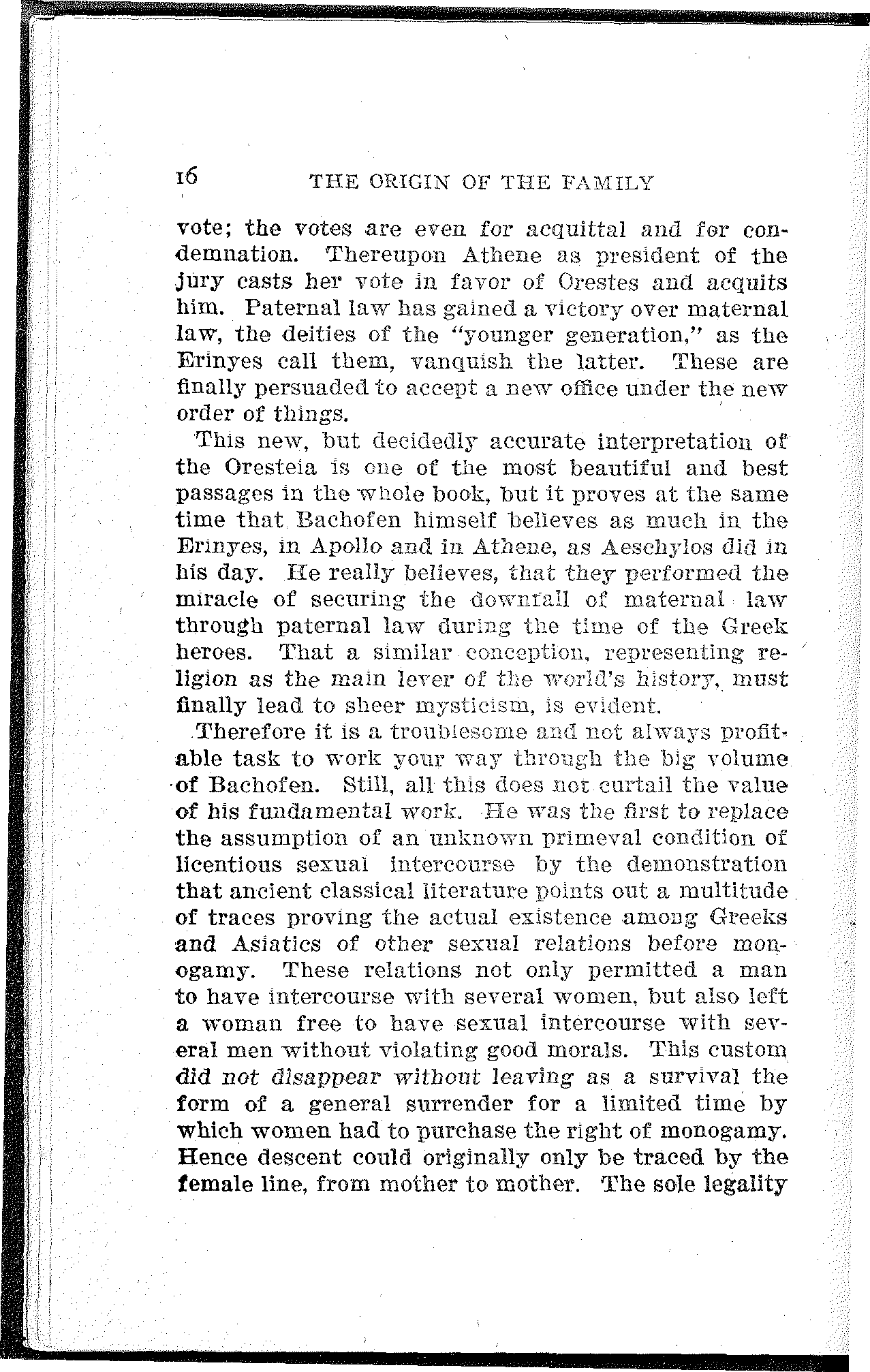 Bachofen finds the proofs of these propositions in numerous quotations from ancient classics, collected with unusual diligence. The transition from "hetaerism" to monogamy and from maternal to paternal law is accomplished according to him—especially by the Greeks—through the evolution of religious ideas. New gods, the representatives of the new ideas, are added to the traditional group of gods, the representatives of old ideas; the latter are forced to the background more and more by the former. [15]According to Bachofen, therefore, it is not the development of the actual conditions of life that has effected the historical changes in the relative social positions of man and wife, but the religious reflection of these conditions in the minds of men. Hence Bachofen represents the Oresteia of Aeschylos as the dramatic description of the fight between the vanishing maternal and the paternal law, rising and victorious during the time of the heroes.
