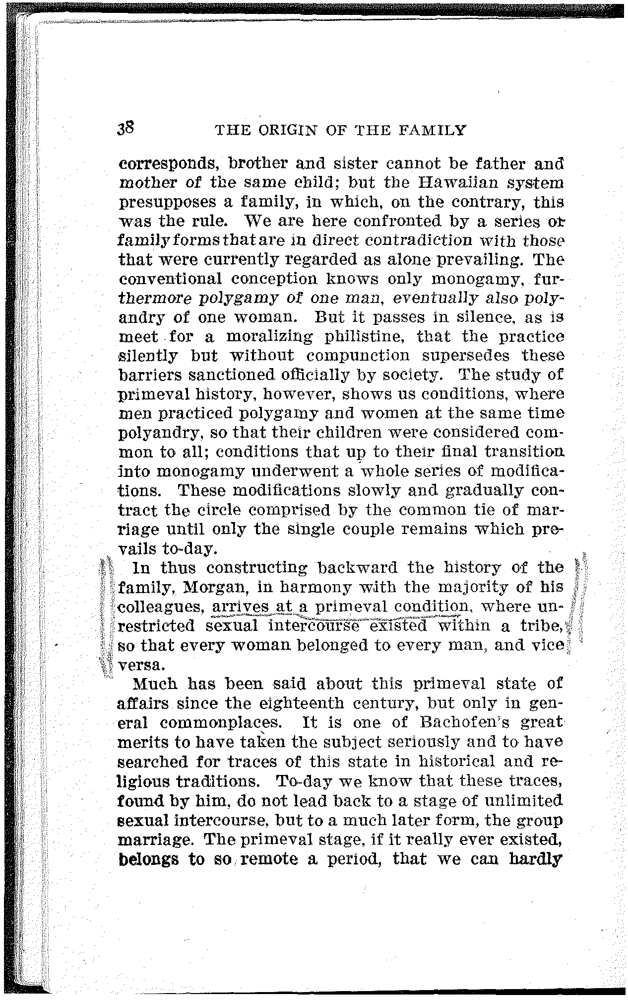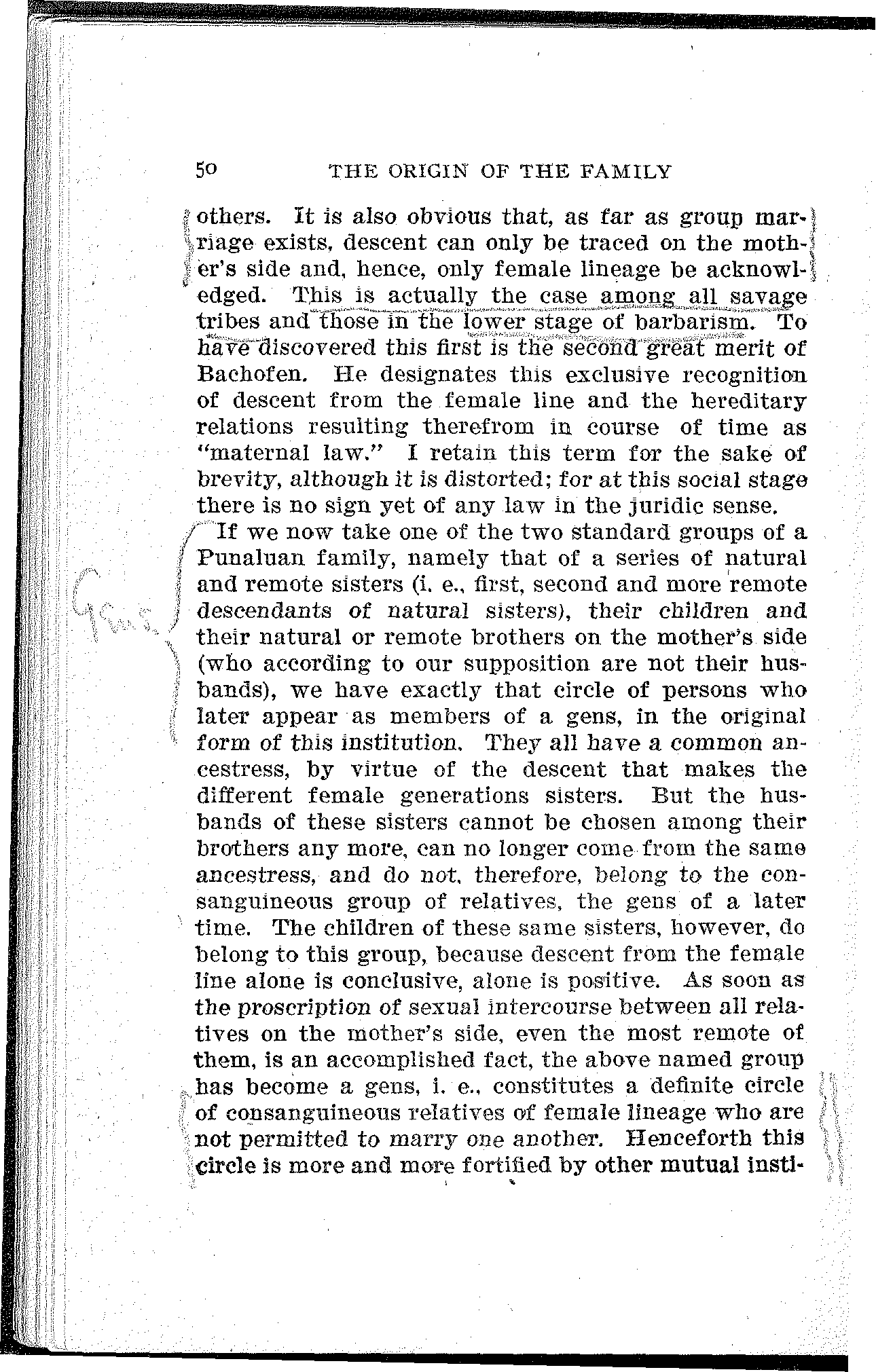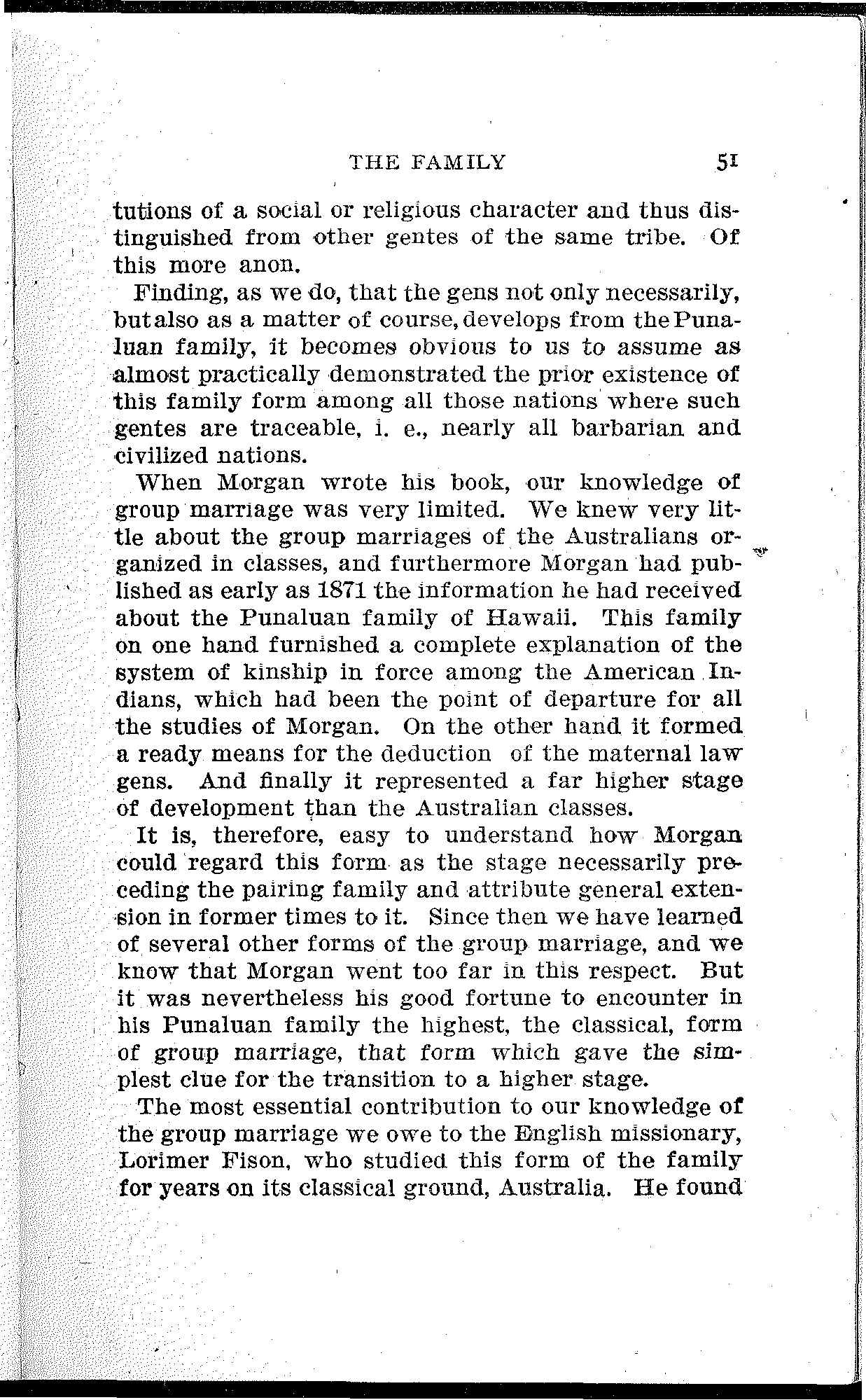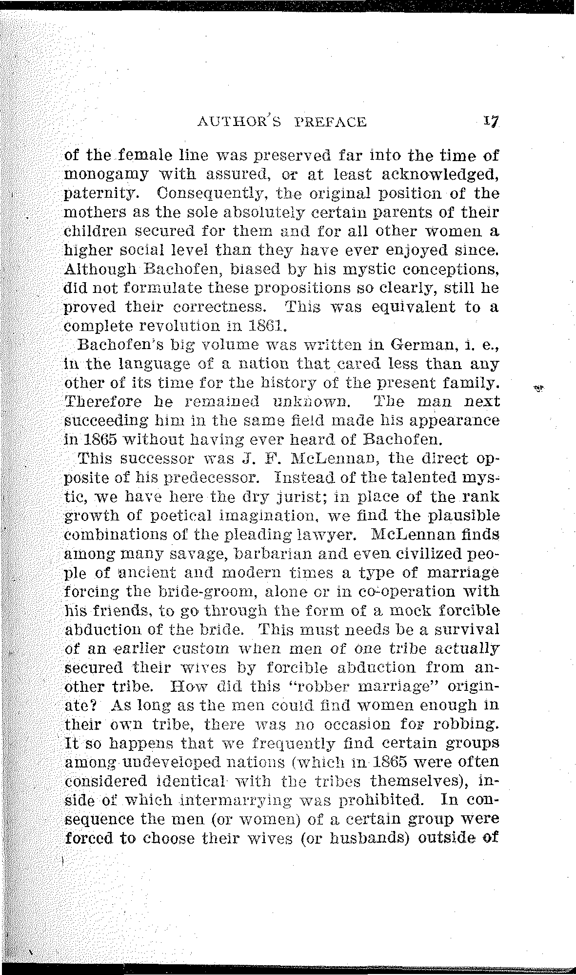 Bachofen's big volume was written In German, i. e., in the language of a nation that cared less than any other of its time for the history of the present family. Therefore he remained unknown. The man next succeeding him in the same field made his appearance in 1865 without having ever heard of Bachofen.