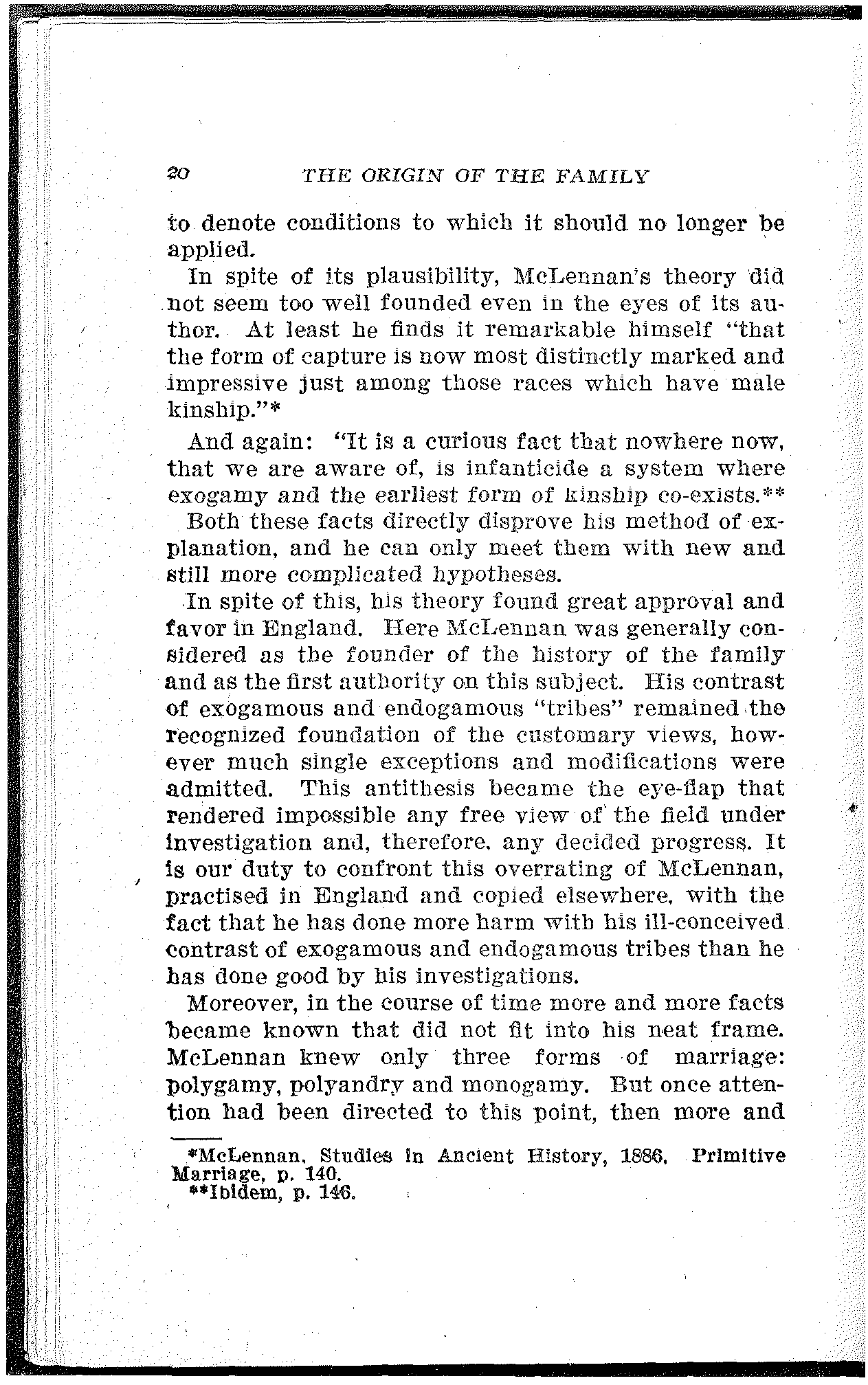 In spite of this, his theory found great approval and favor in England. Here McLennan was generally considered as the founder of the history of the family and as the first authority on this subject. His contrast of exogamous and endogamous "tribes" remained the recognized foundation of the customary views, however much single exceptions and modifications were admitted. This antithesis became the eye-flap that rendered impossible any free view of the field under investigation and, therefore, any decided progress. It is our duty to confront this overrating of McLennan, practised in England and copied elsewhere, with the fact that he has done more harm with his ill-conceived contrast of exogamous and endogamous tribes than he has done good by his investigations.