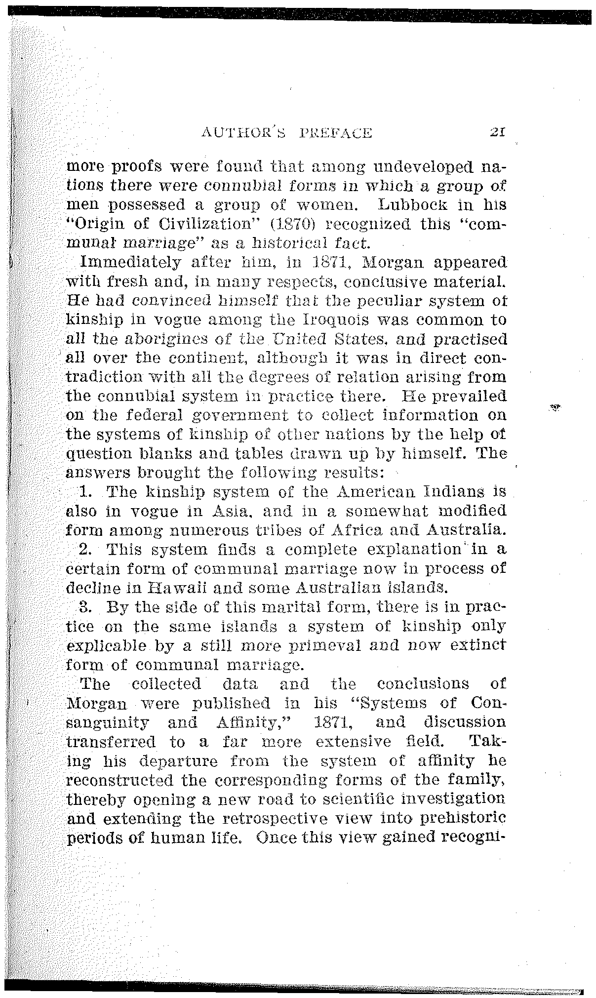 It is not necessary to dwell in this preface on the other forms of progress which primeval history owes to Morgan. Reference to them will be found in the course of my work. During the fourteen years that have elapsed since the publication of his main work, the material contributing to the history of primeval society has been considerably enriched. Anthropologists, travelers and professional historians were joined by comparative jurists who added new matter and opened up new points of view. Here and there, some special hypothesis of Morgan has been shaken or even become obsolete. But in no instance has the new material led to a weakening of his leading propositions. The order he established in primeval history still holds good in its main outlines to this day. We may even say that this order receives recognition in the exact degree, in which the authorship of this great progress is concealed.