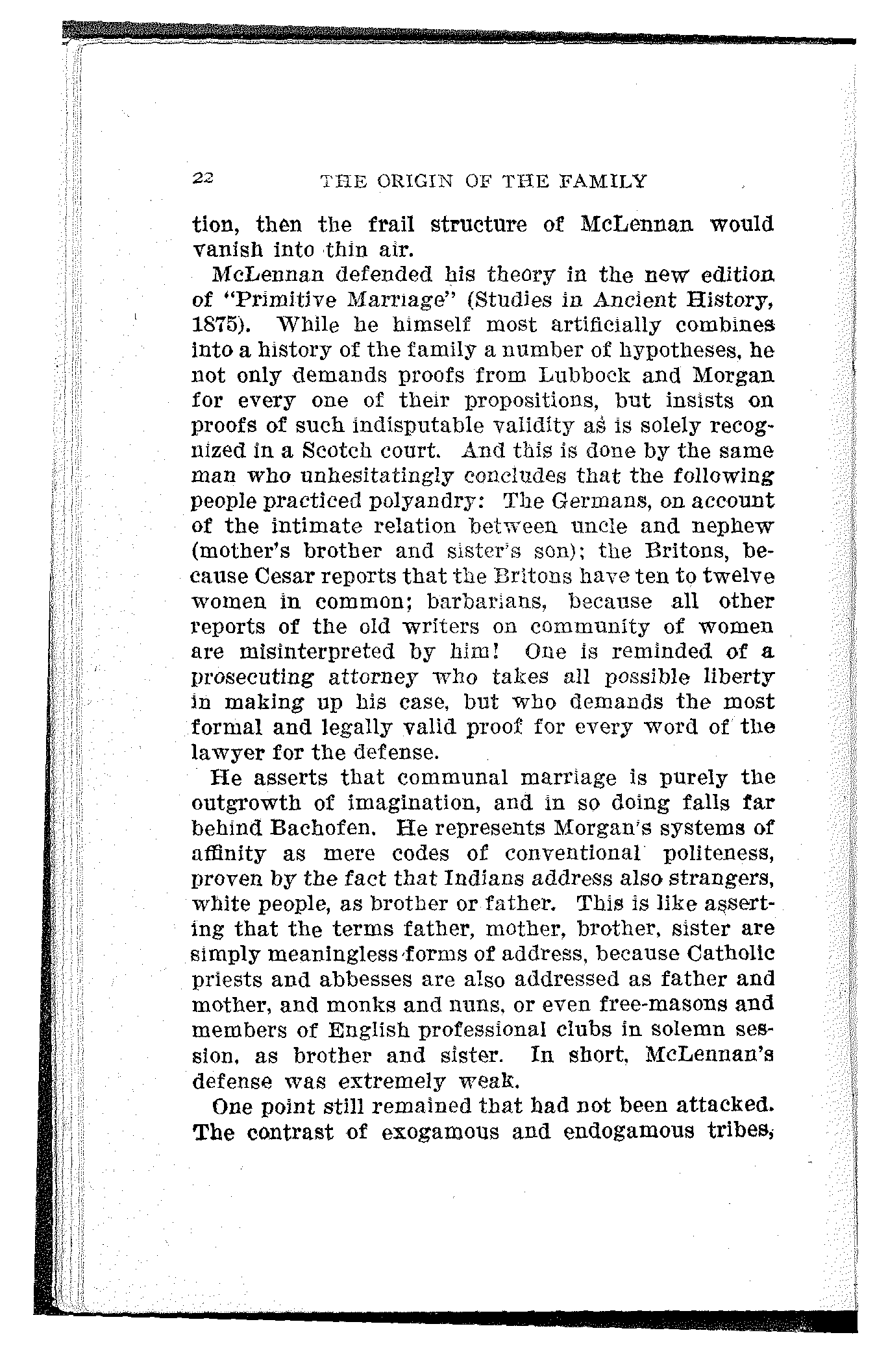 McLennan defended his theory in the new edition of "Primitive Marriage" (Studies in Ancient History, 1875). While he himself most artificially combines into a history of the family a number of hypotheses, he not only demands proofs from Lubbock and Morgan for every one of their propositions, but insists on proofs of such indisputable validity as is solely recognized in a Scotch court. And this is done by the same man who unhesitatingly concludes that the following people practiced polyandry: The Germans, on account of the intimate relation between uncle and nephew (mother's brother and sister's son); the Britons, because Cesar reports that the Britons have ten to twelve women in common; barbarians, because all other reports of the old writers on community of women are misinterpreted by him! One is reminded of a prosecuting attorney who takes all possible liberty in making up his case, but who demands the most formal and legally valid proof for every word of the lawyer for the defense.