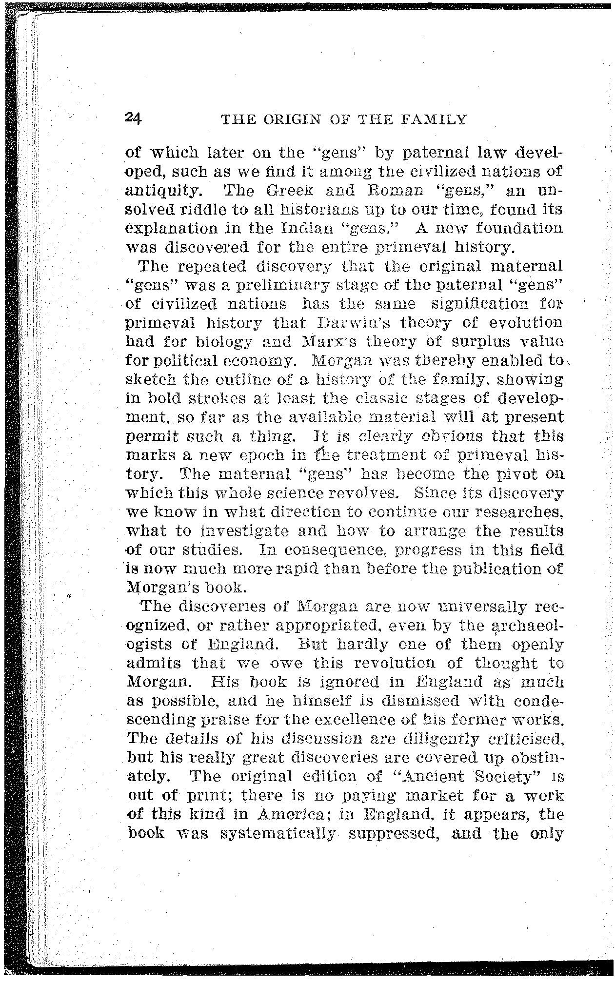 The discoveries of Morgan are now universally recognized, or rather appropriated, even by the archaeologists of England. But hardly one of them openly admits that we owe this revolution of thought to Morgan. His book is ignored in England as much as possible, and he himself is dismissed with condescending praise for the excellence of his former works. The details of his discussion are diligently criticised, but his really great discoveries are covered up obstinately. The original edition of "Ancient Society" is out of print; there is no paying market for a work of this kind in America; in England, it appears, the book was systematically suppressed, and the only[25] edition of this epochal work still circulating in the market is—the German translation.