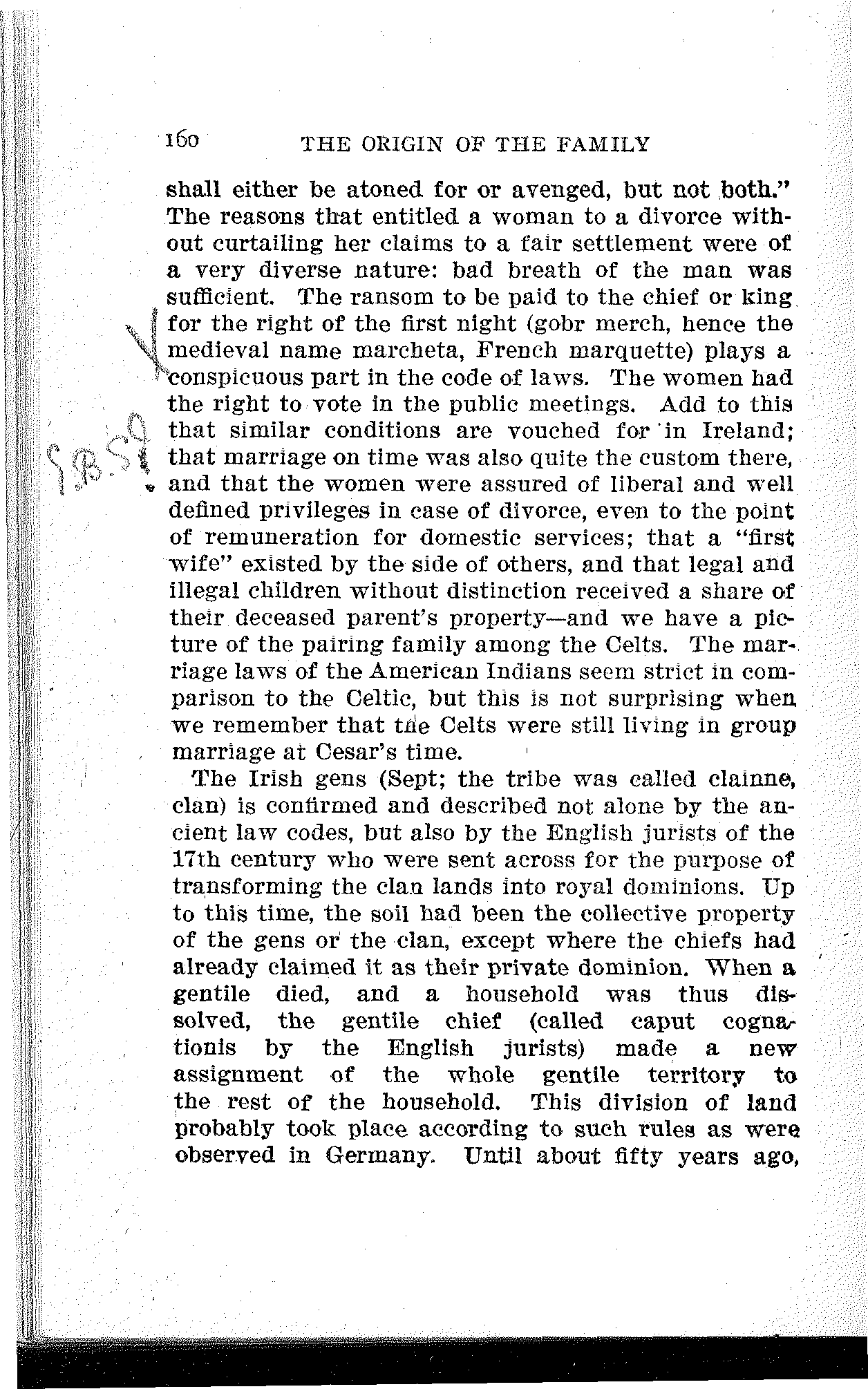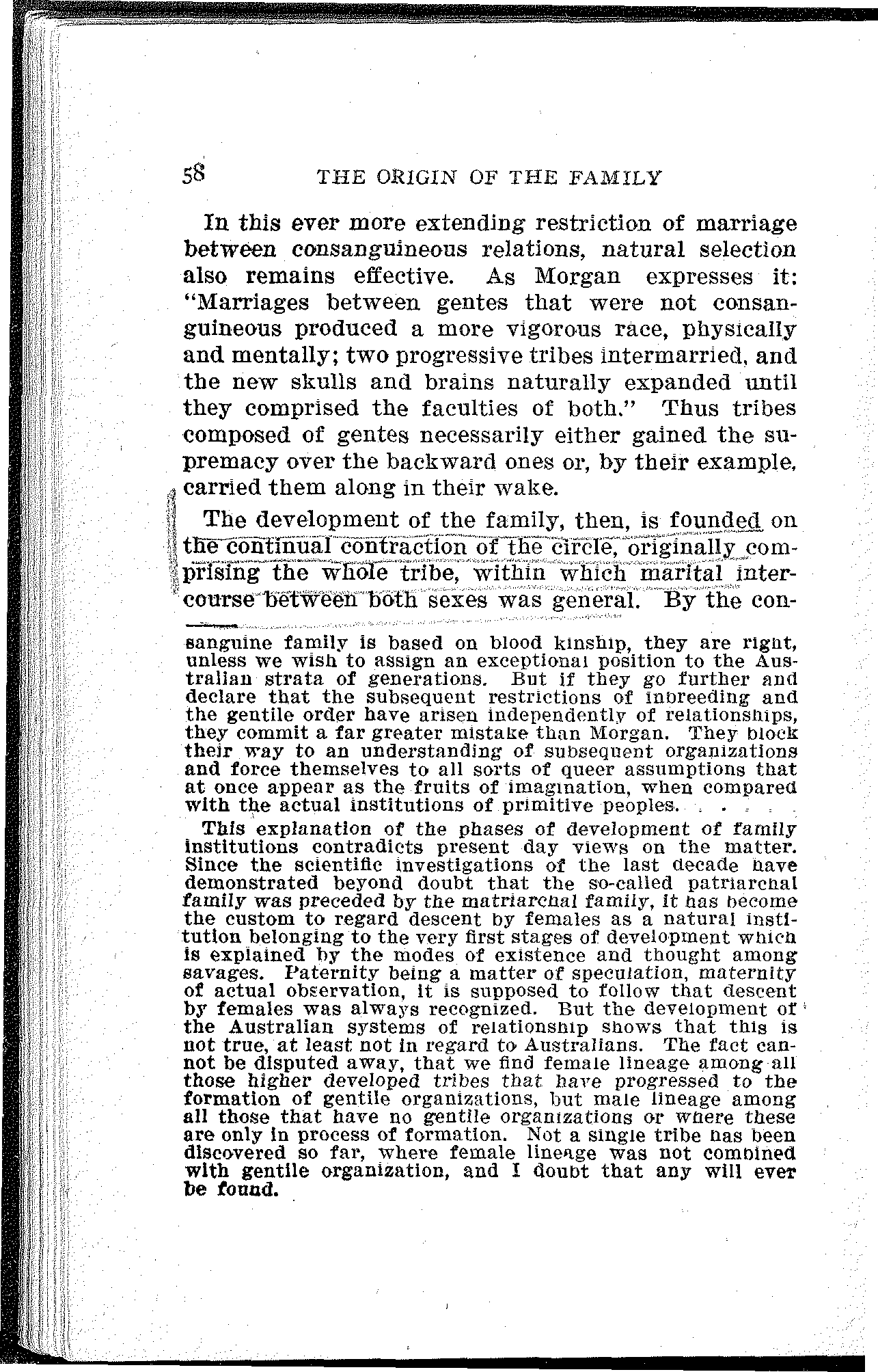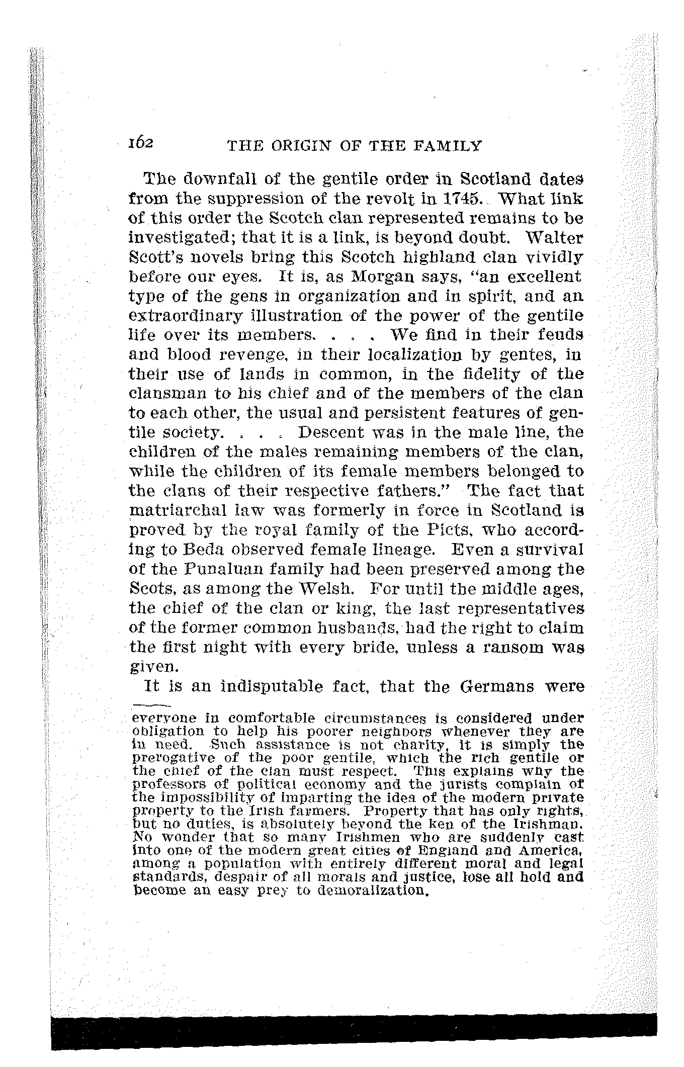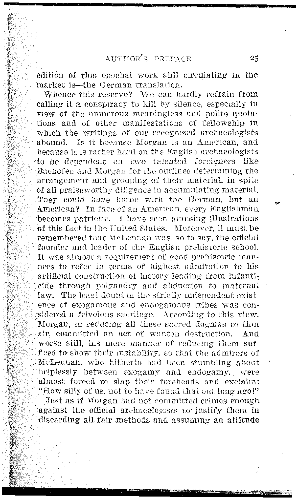 Whence this reserve? We can hardly refrain from calling it a conspiracy to kill by silence, especially in view of the numerous meaningless and polite quotations and of other manifestations of fellowship in which the writings of our recognized archaeologists abound. Is it because Morgan is an American, and because it is rather hard on the English archaeologists to be dependent on two talented foreigners like Bachofen and Morgan for the outlines determining the arrangement and grouping of their material, in spite of all praiseworthy diligence in accumulating material. They could have borne with the German, but an American? In face of an American, every Englishman becomes patriotic. I have seen amusing illustrations of this fact in the United States. Moreover, it must be remembered that McLennan was, so to say, the official founder and leader of the English prehistoric school. It was almost a requirement of good prehistoric manners to refer in terms of highest admiration to his artificial construction of history leading from infanticide through polyandry and abduction to maternal law. The least doubt in the strictly independent existence of exogamous and endogamous tribes was considered a frivolous sacrilege. According to this view, Morgan, in reducing all these sacred dogmas to thin air, committed an act of wanton destruction. And worse still, his mere manner of reducing them sufficed to show their instability, so that the admirers of McLennan, who hitherto had been stumbling about helplessly between exogamy and endogamy, were almost forced to slap their foreheads and exclaim: "How silly of us, not to have found that out long ago!"