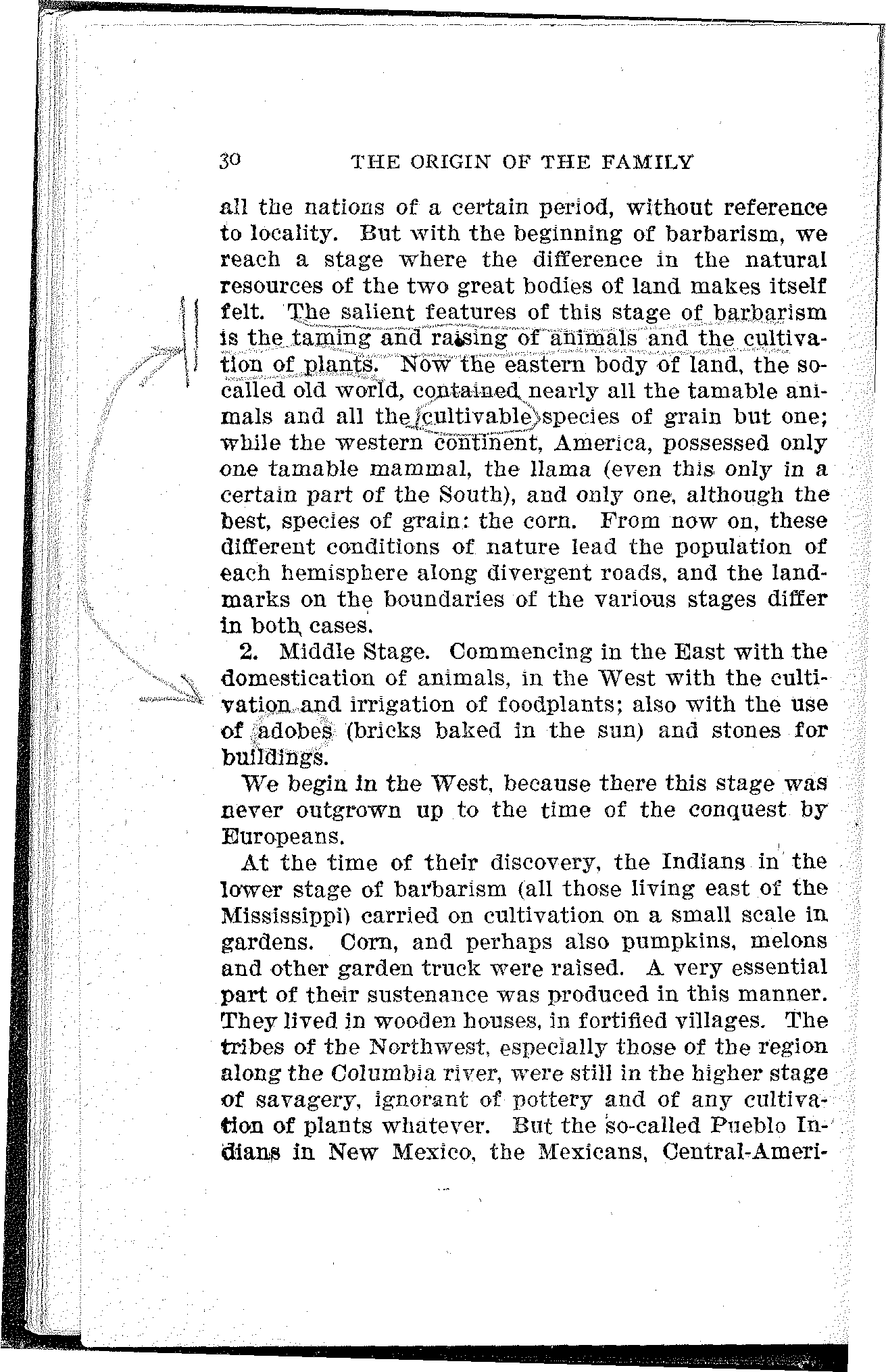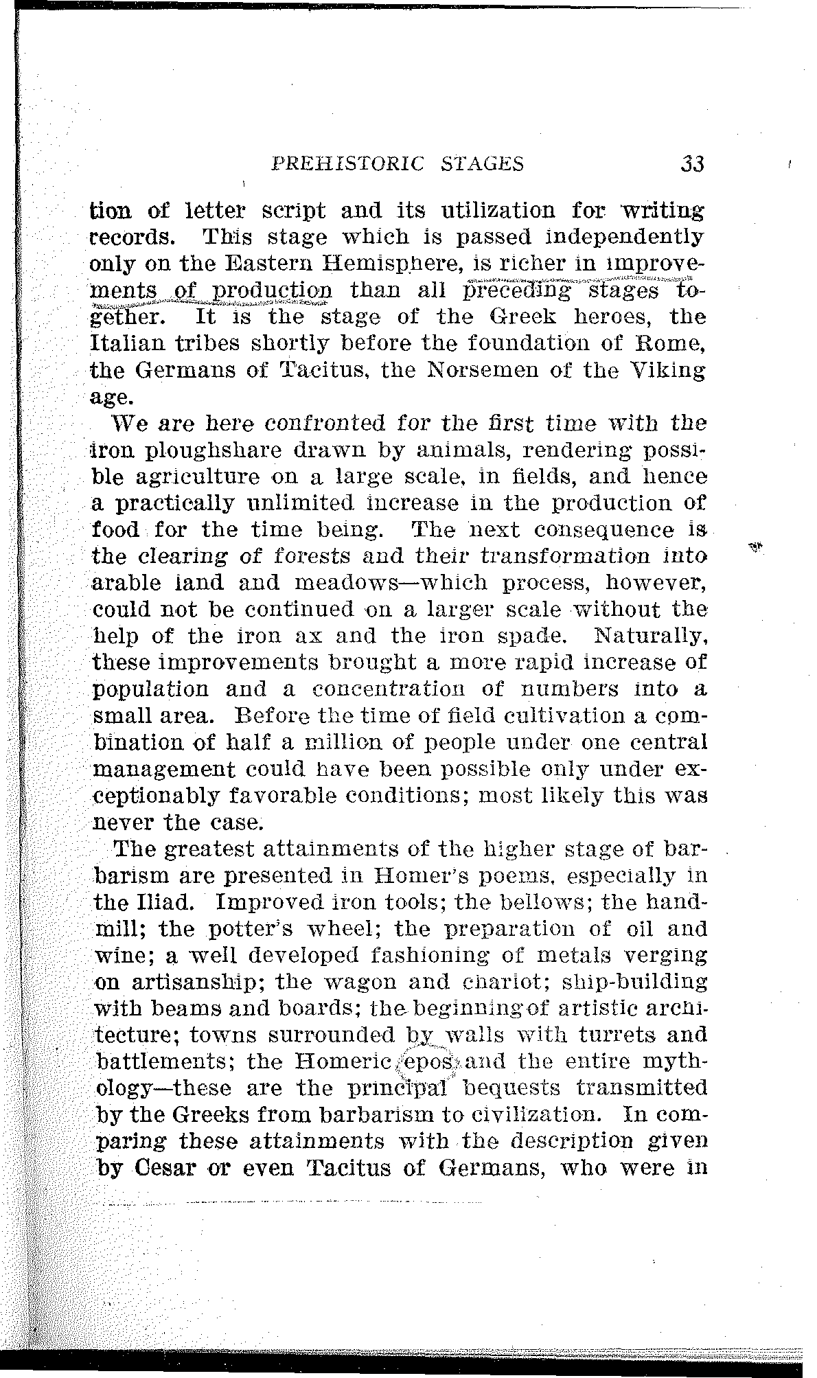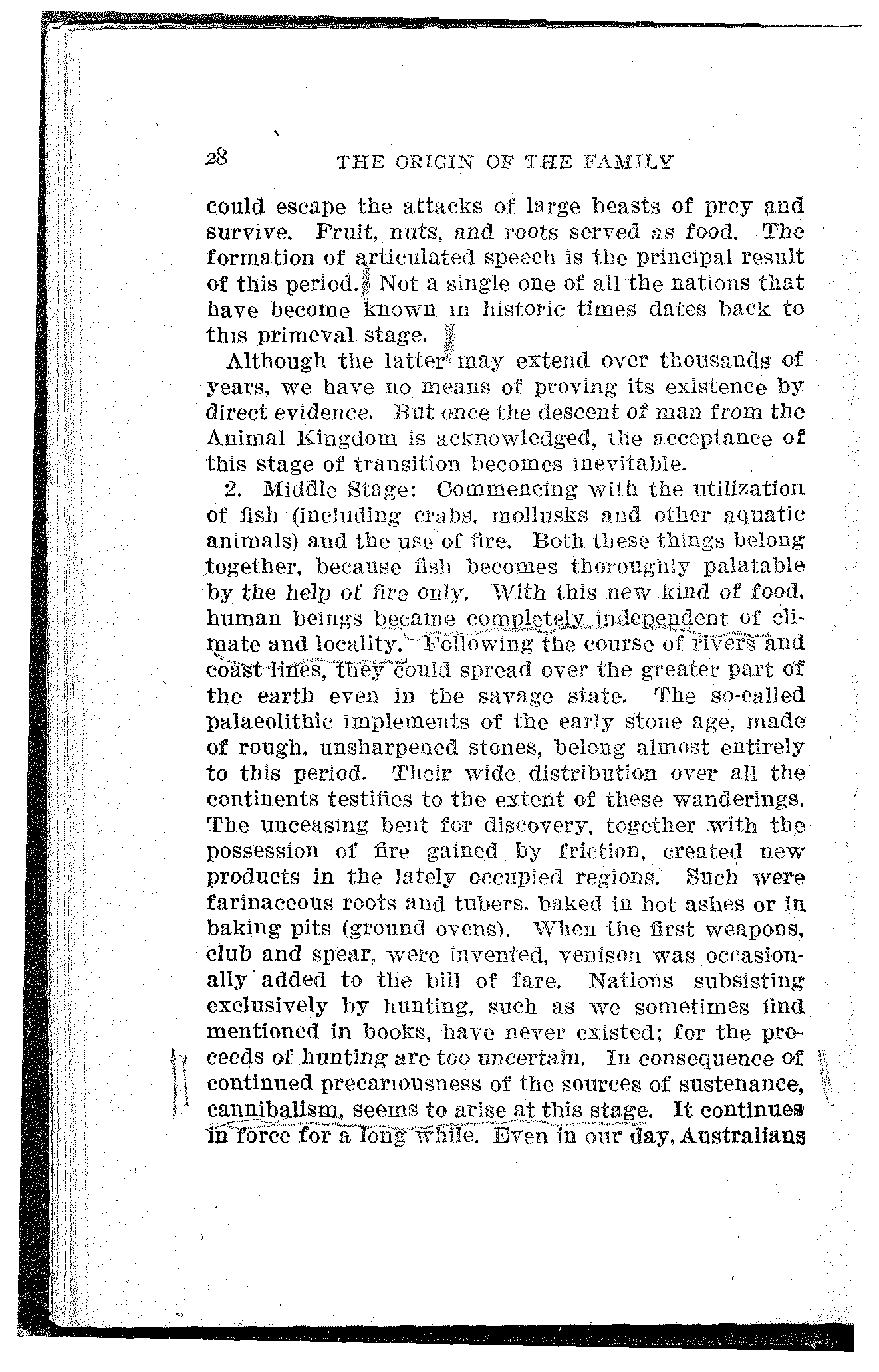 2. Middle Stage: Commencing with the utilization of fish (including crabs, mollusks and other aquatic animals) and the use of fire. Both these things belong together, because fish becomes thoroughly palatable by the help of fire only. With this new kind of food, human beings became completely independent of climate and locality. Following the course of rivers and coastlines, they could spread over the greater part of the earth even in the savage state. The so-called palaeolithic implements of the early stone age, made of rough, unsharpened stones, belong almost entirely to this period. Their wide distribution over all the continents testifies to the extent of these wanderings. The unceasing bent for discovery, together with the possession of fire gained by friction, created new products in the lately occupied regions. Such were farinaceous roots and tubers, baked in hot ashes or in baking pits (ground ovens). When the first weapons, club and spear, were invented, venison was occasionally added to the bill of fare. Nations subsisting exclusively by hunting, such as we sometimes find mentioned in books, have never existed; for the proceeds of hunting are too uncertain. In consequence of continued precariousness of the sources of sustenance, cannibalism seems to arise at this stage. It continues in force for a long while. Even in our day, Australians[29] and Polynesians still remain in this middle stage of savagery.