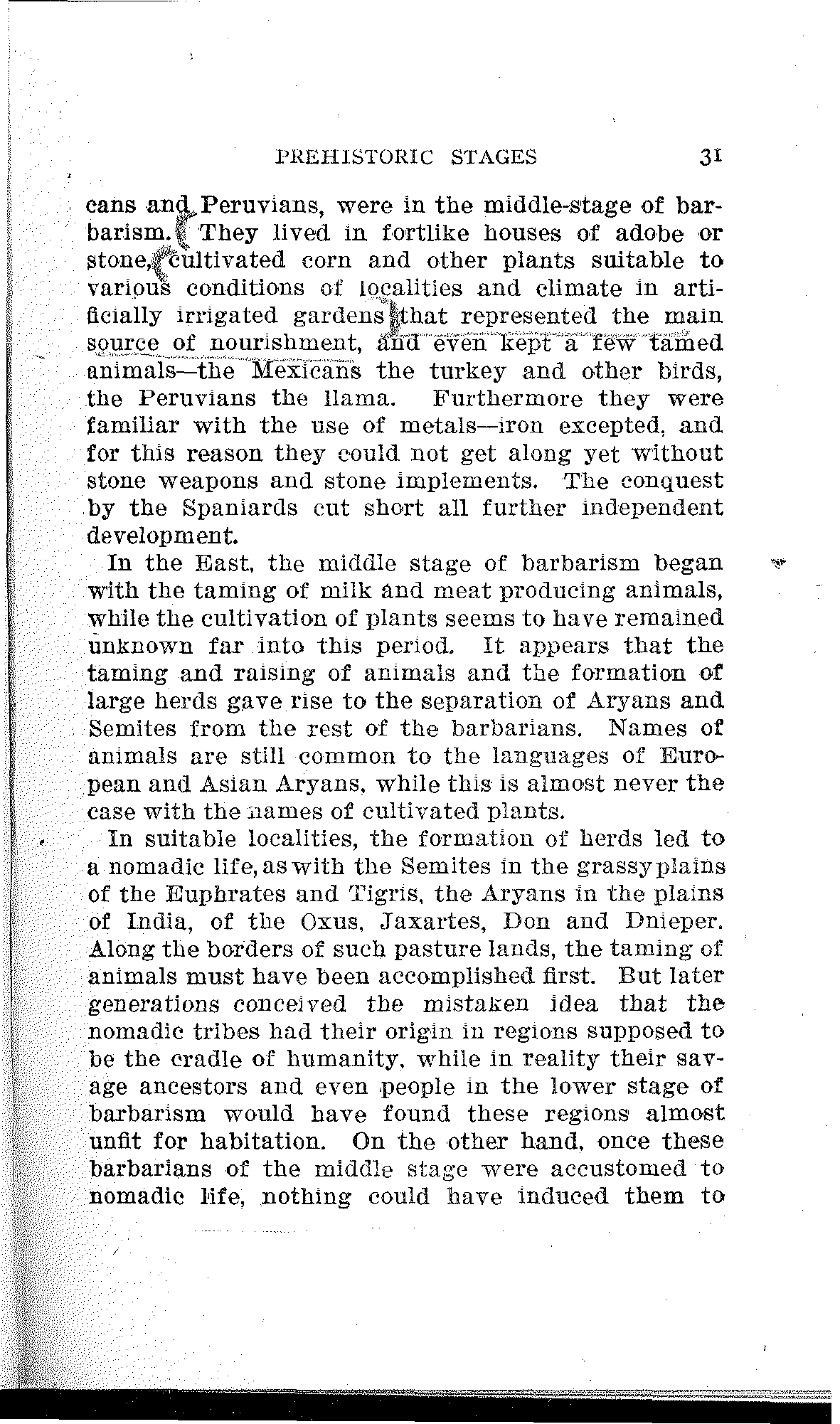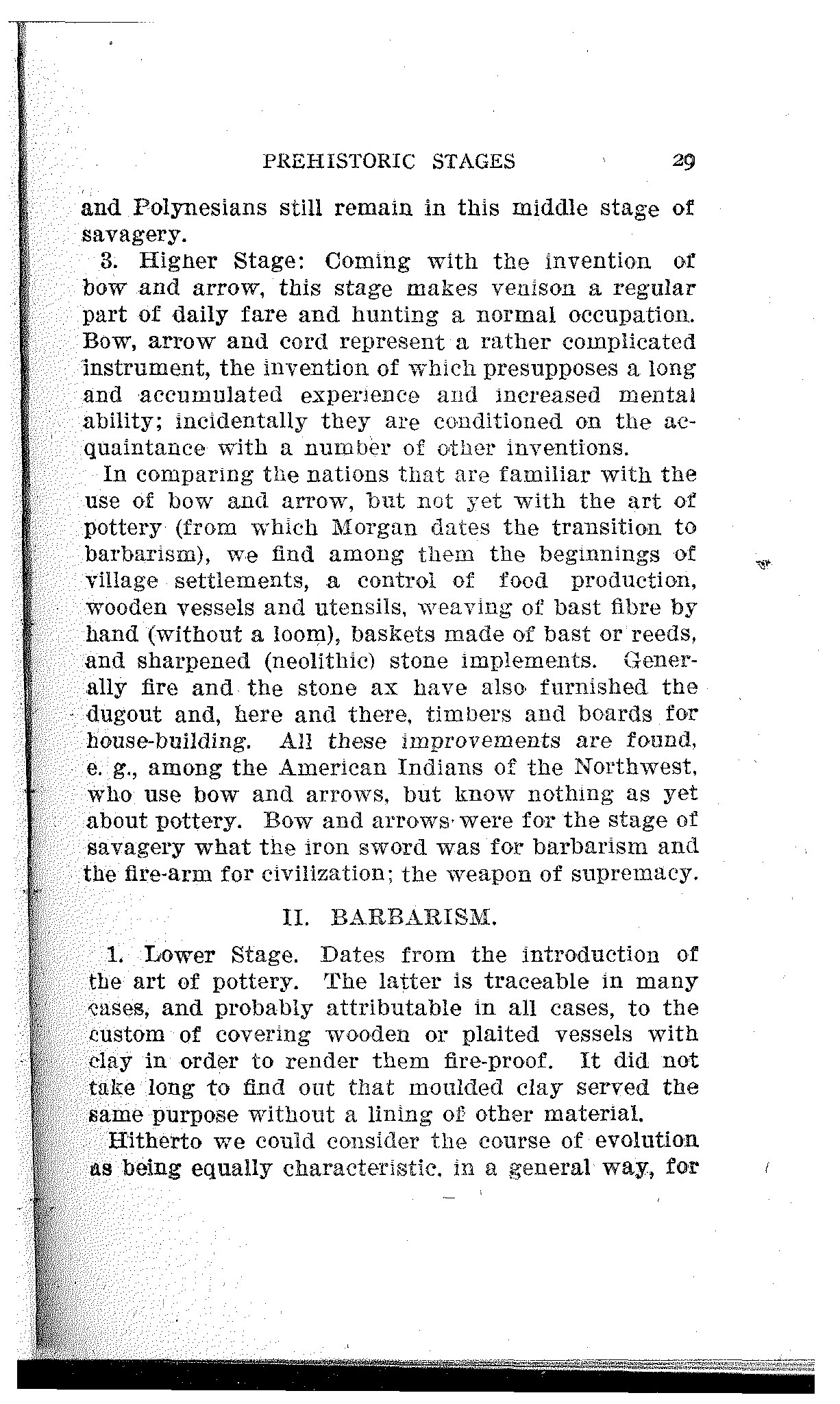 1. Lower Stage. Infancy of the human race. Human beings still dwelt in their original habitation, in tropical or subtropical forests. They lived at least part of the time in trees, for only in this way they[28] could escape the attacks of large beasts of prey and survive. Fruit, nuts, and roots served as food. The formation of articulated speech is the principal result of this period. Not a single one of all the nations that have become known in historic times dates back to this primeval stage.