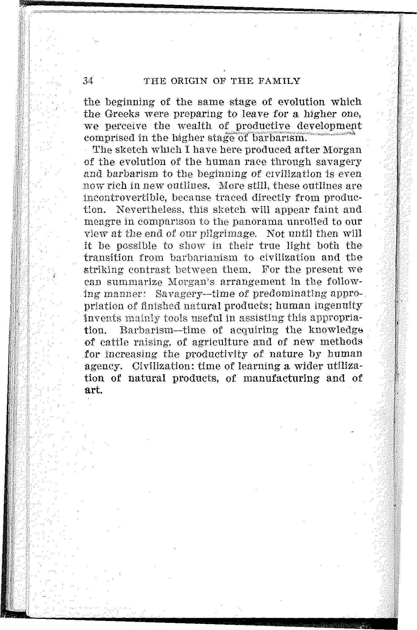 Of the three main epochs—savagery, barbarism and civilization—naturally only the first two and the transition to the third required his attention. He subdivided each of these into a lower, middle and higher stage, according to the progress in the production of the means of sustenance. His reason for doing so is that the degree of human supremacy over nature is conditioned on the ability to produce the necessities of life. For of all living beings, man alone has acquired an almost unlimited control over food production. All great epochs of human progress, according to Morgan, coincide more or less directly with times of greater abundance in the means that sustain life. The evolution of the family proceeds in the same measure without, however, offering equally convenient marks for sub-division.