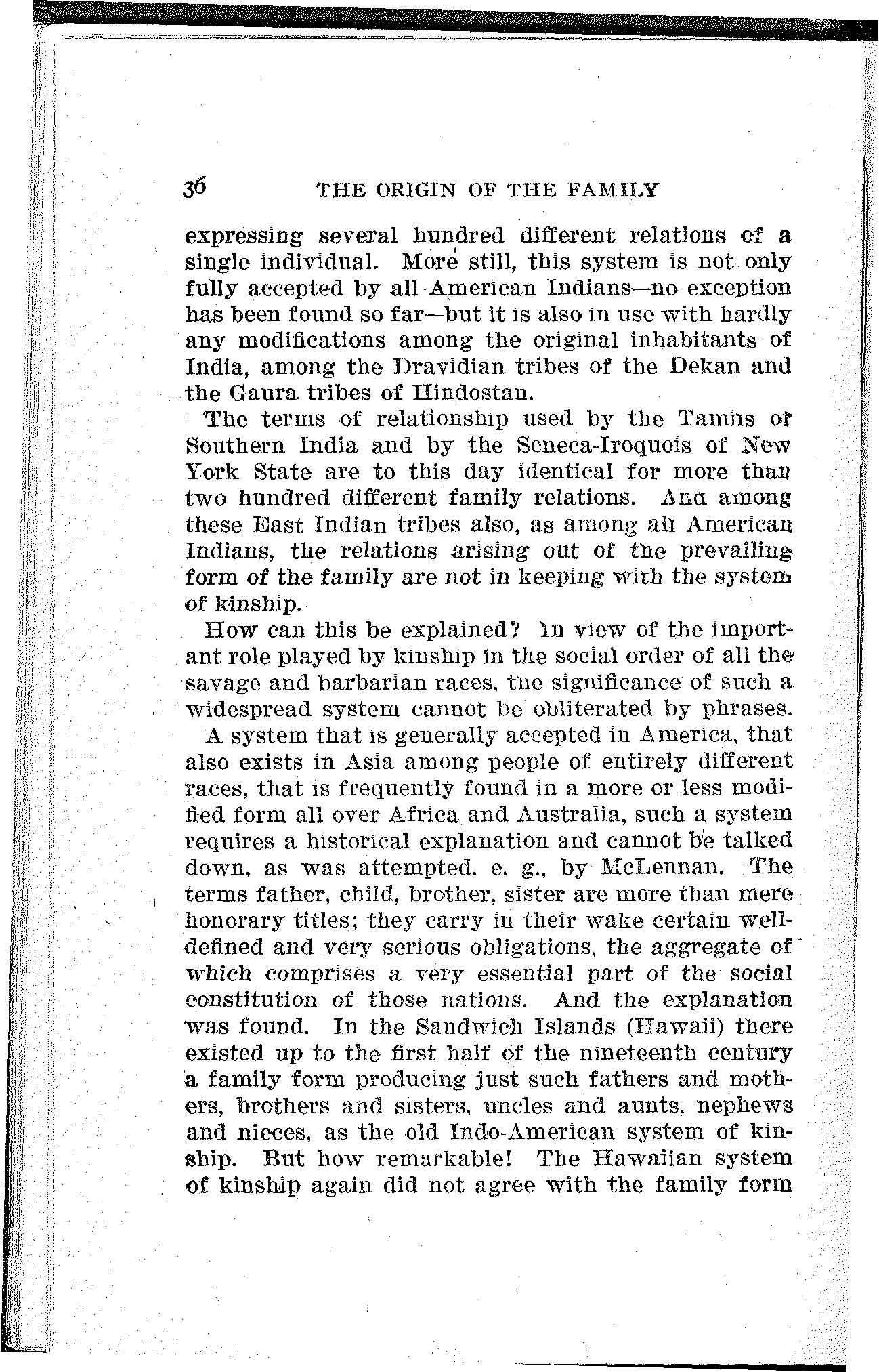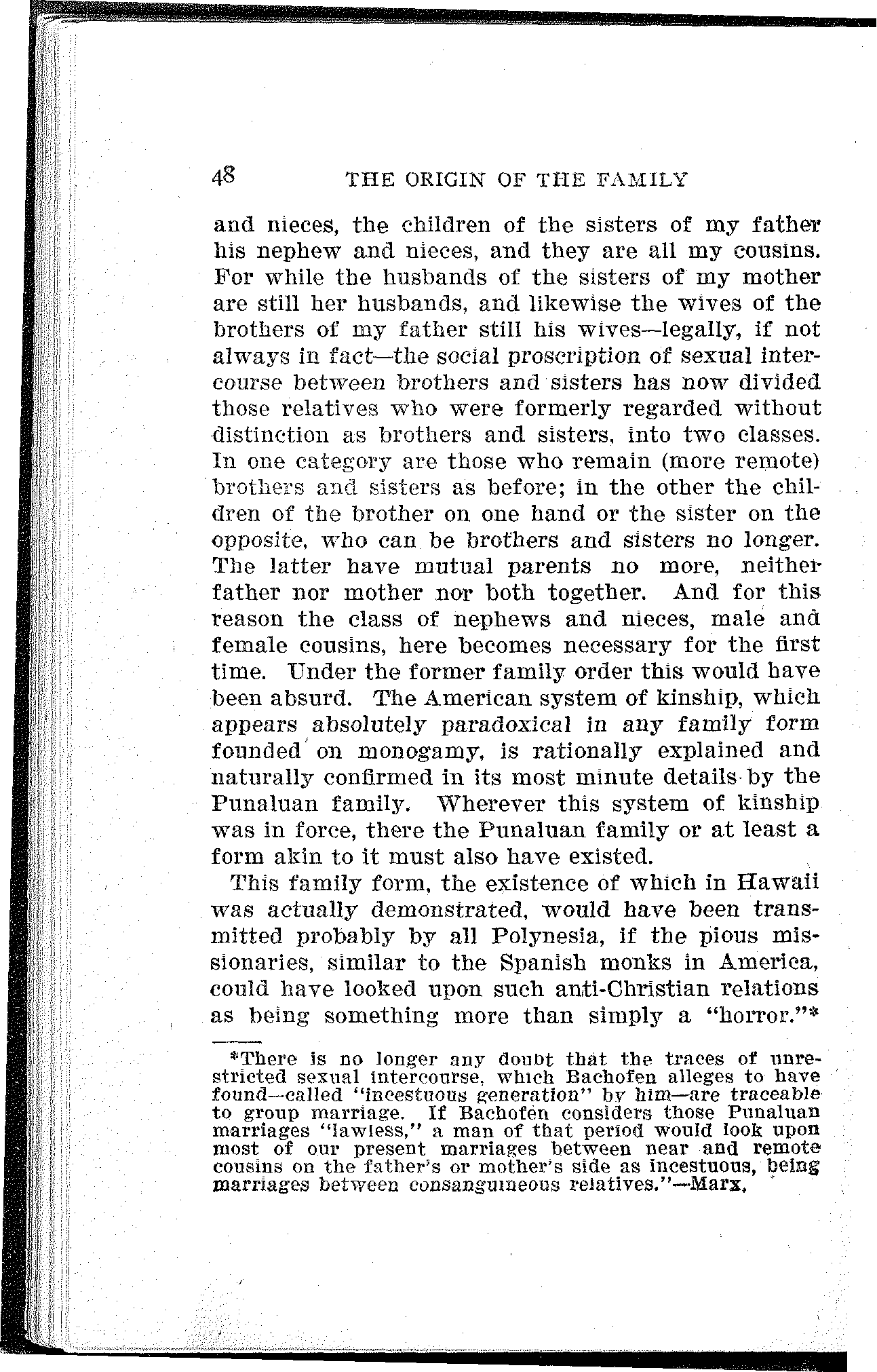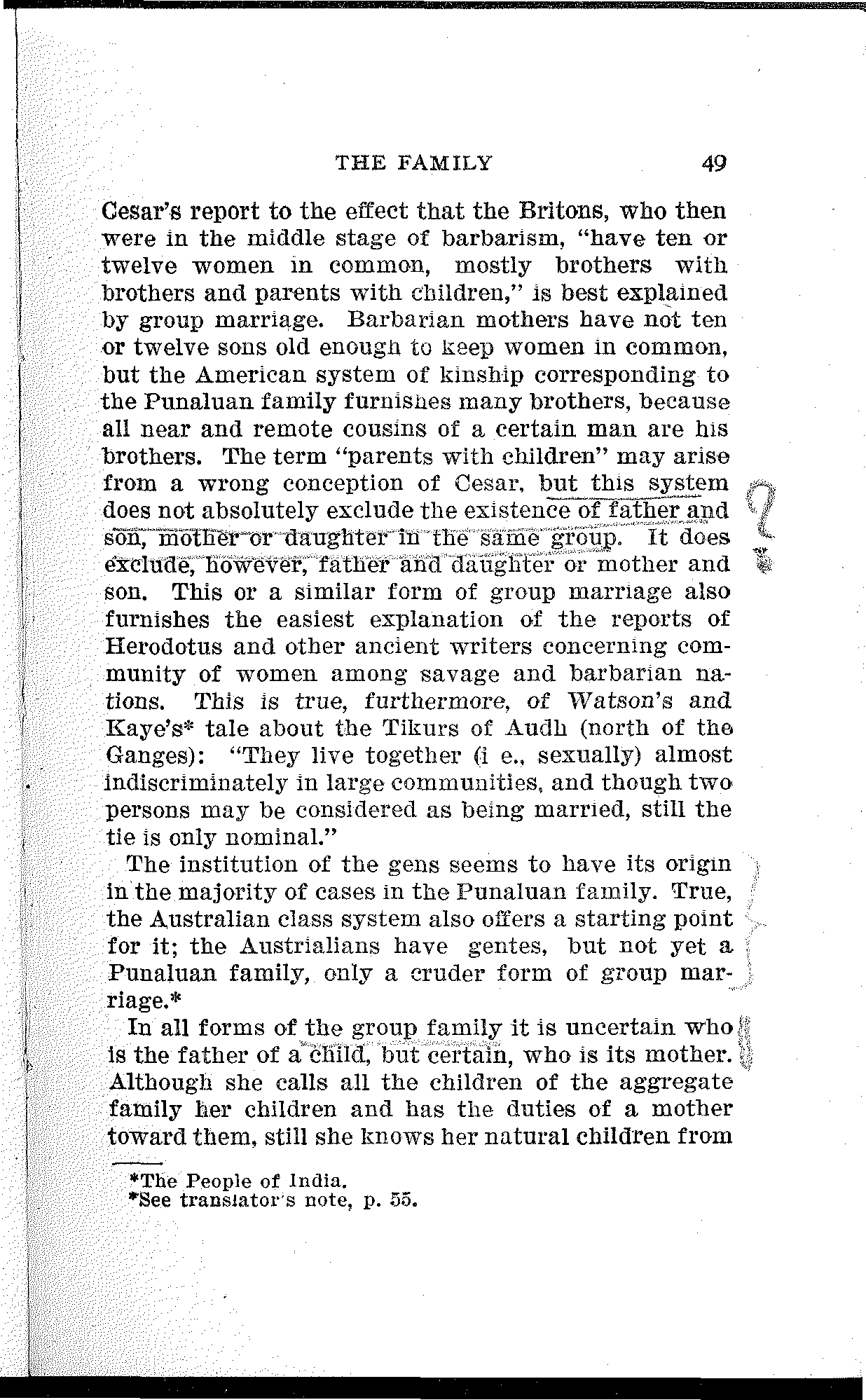 Immediately after him, in 1871, Morgan appeared with fresh and, in many respects, conclusive material. He had convinced himself that the peculiar system of kinship in vogue among the Iroquois was common to all the aborigines of the United States, and practised all over the continent, although it was in direct contradiction with all the degrees of relation arising from the connubial system in practice there. He prevailed on the federal government to collect information on the systems of kinship of other nations by the help of question blanks and tables drawn up by himself. The answers brought the following results: