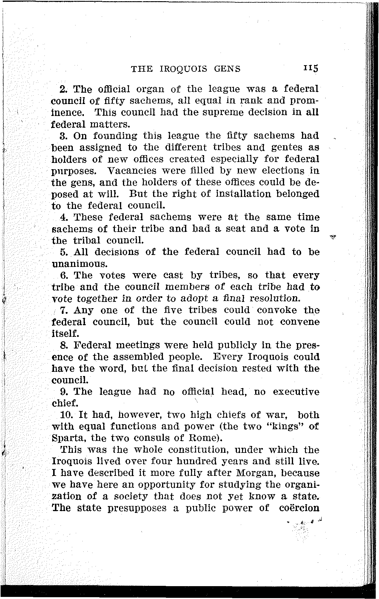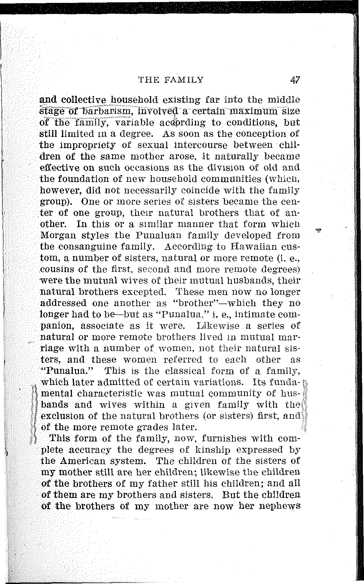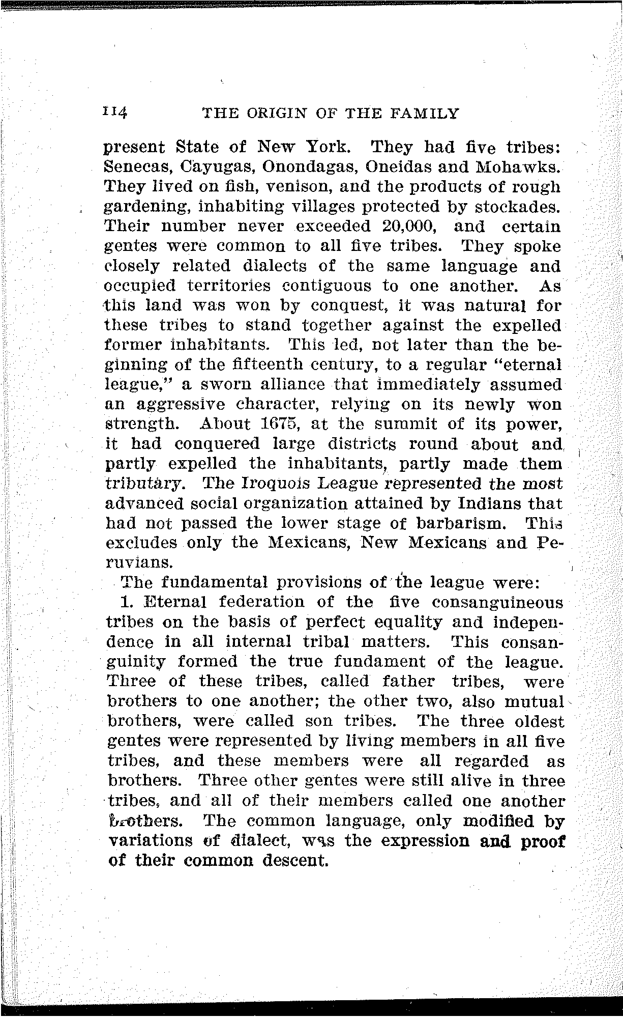 Immediately after him, in 1871, Morgan appeared with fresh and, in many respects, conclusive material. He had convinced himself that the peculiar system of kinship in vogue among the Iroquois was common to all the aborigines of the United States, and practised all over the continent, although it was in direct contradiction with all the degrees of relation arising from the connubial system in practice there. He prevailed on the federal government to collect information on the systems of kinship of other nations by the help of question blanks and tables drawn up by himself. The answers brought the following results: