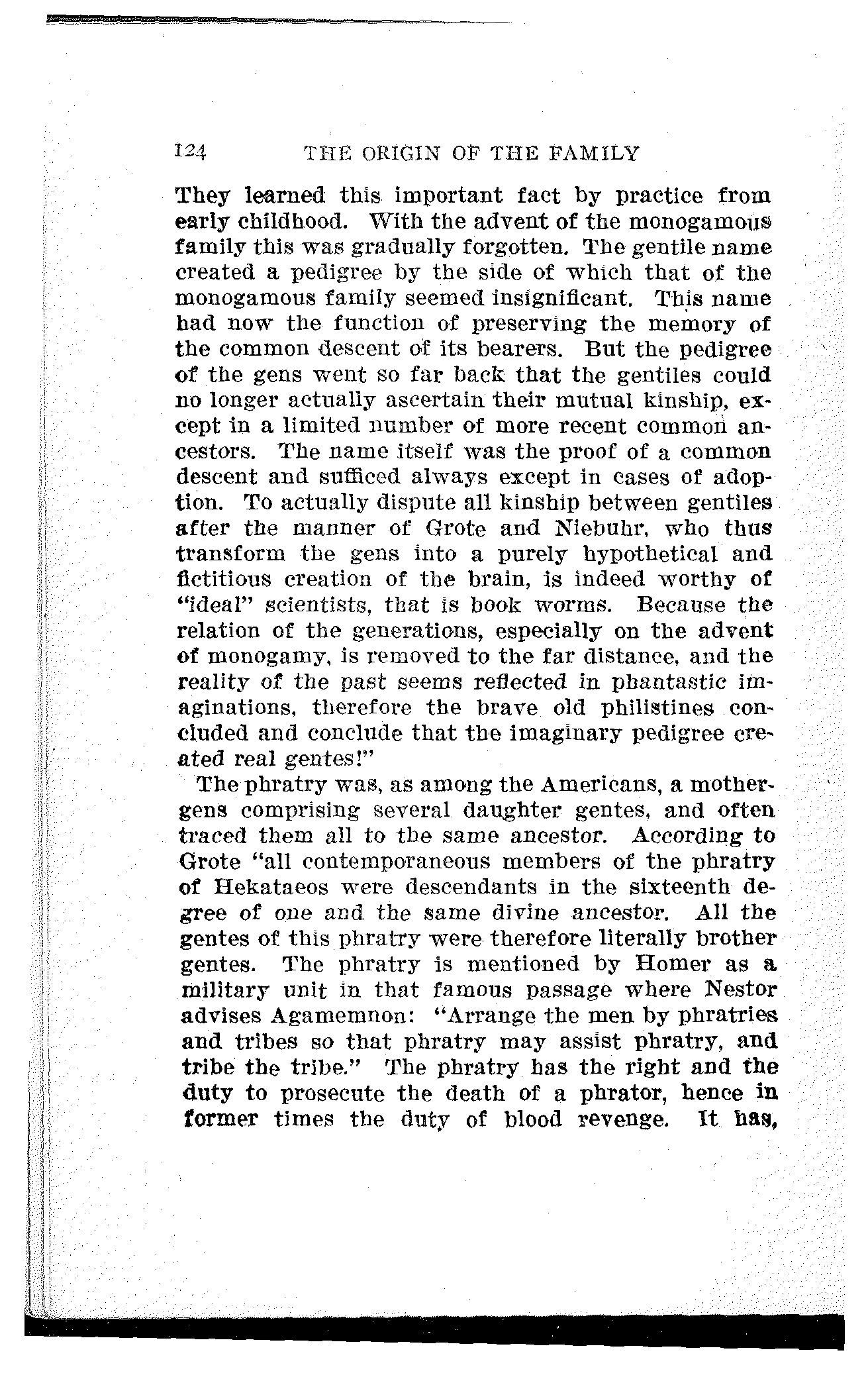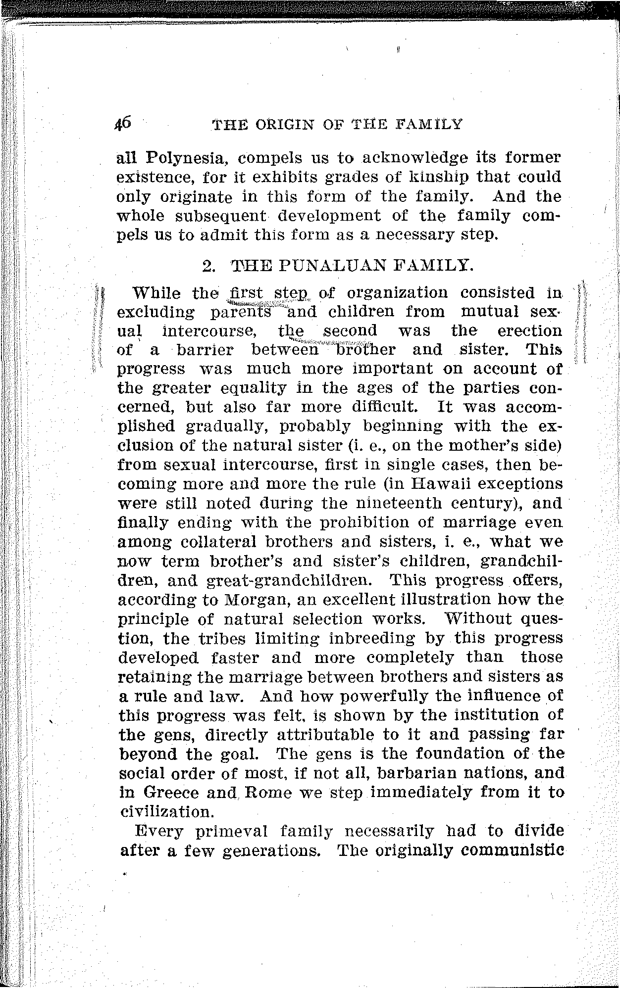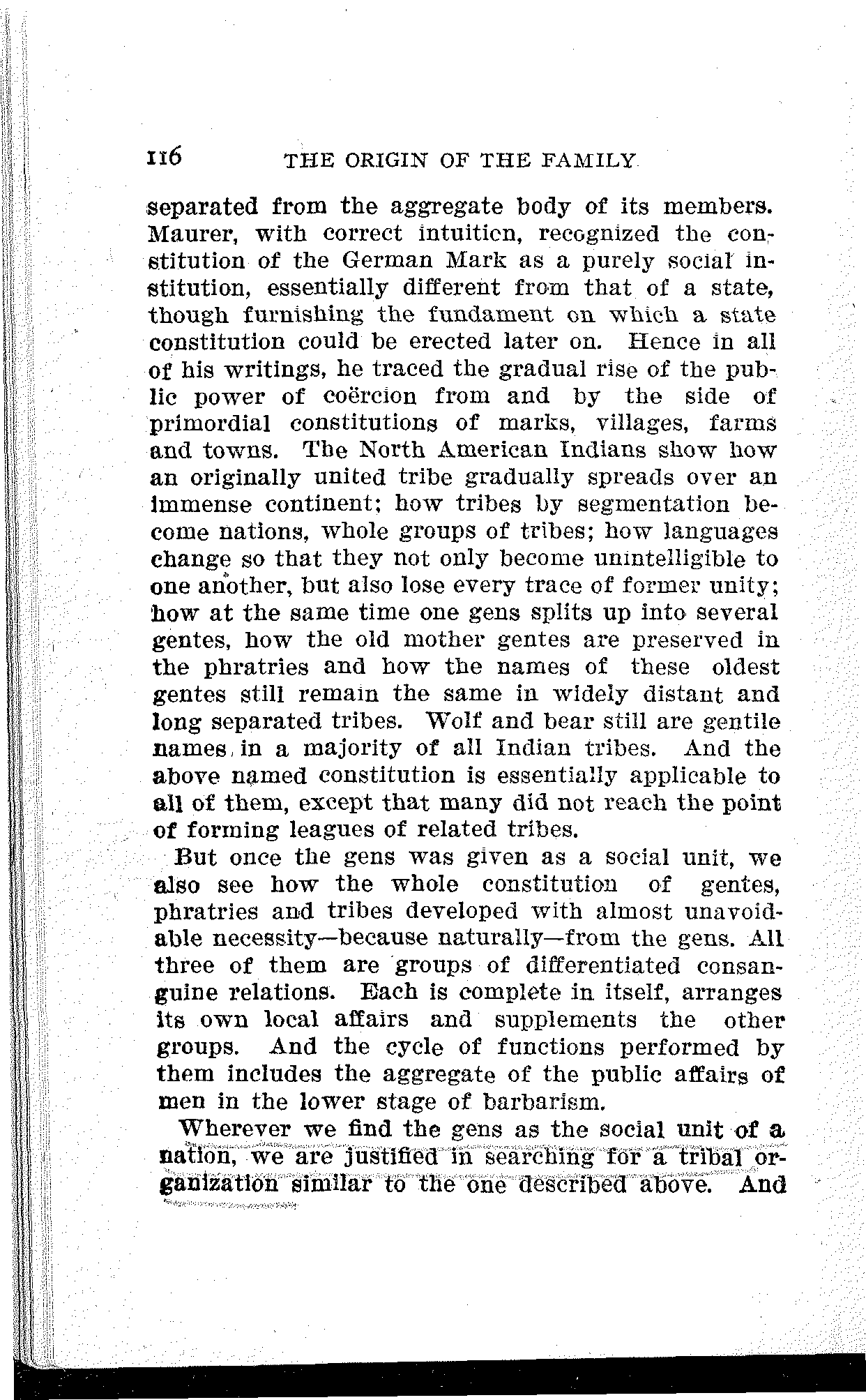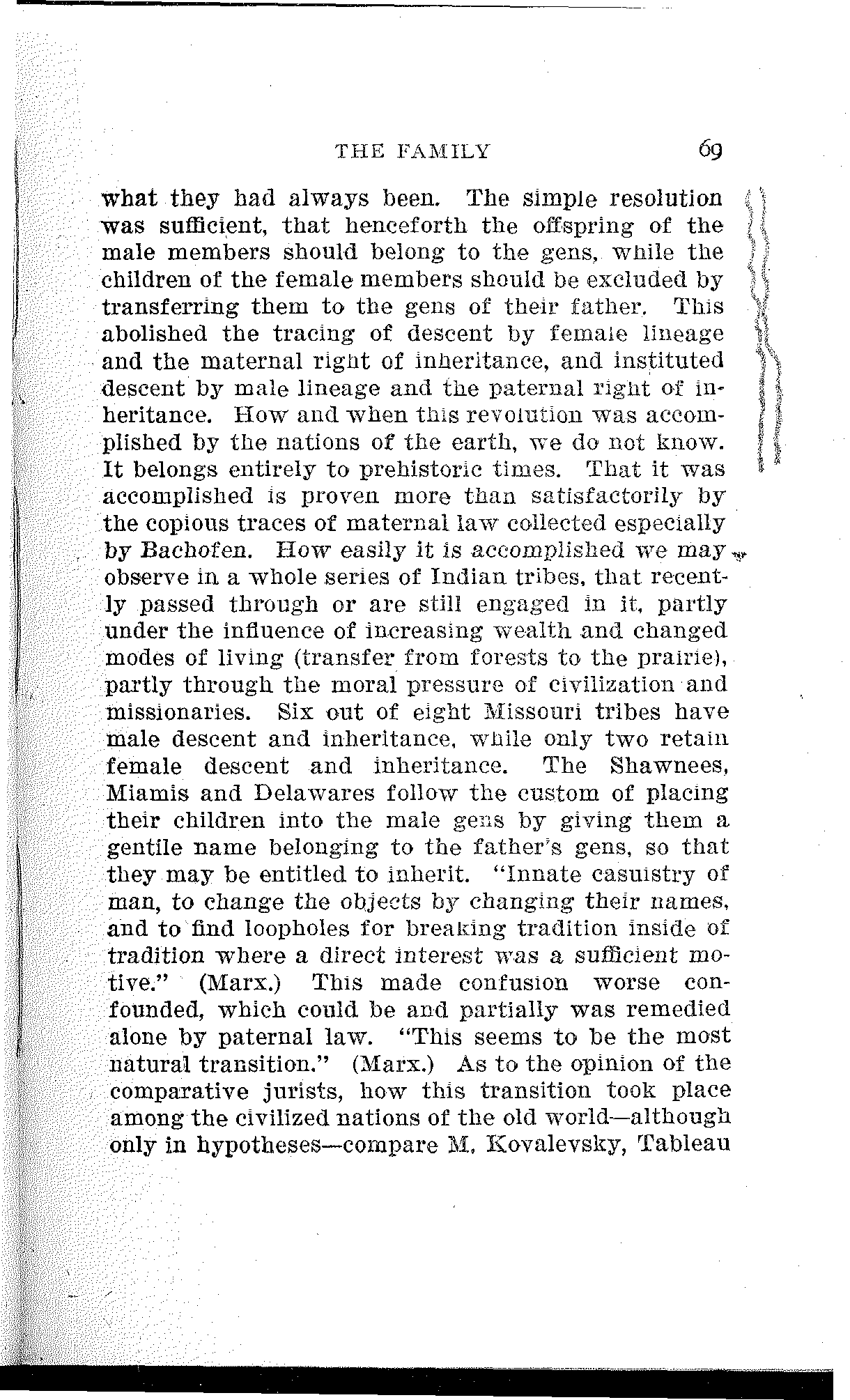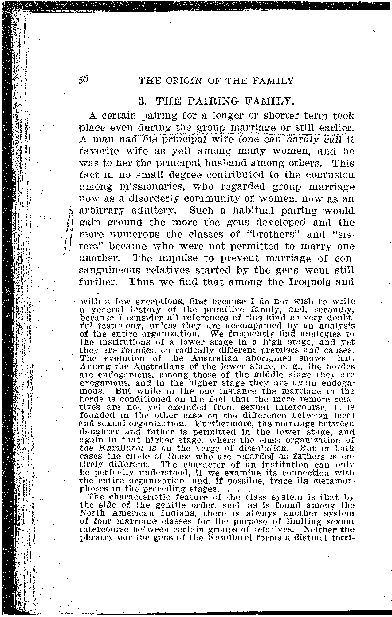 Morgan was the first to make an attempt at introducing a logical order into the history of primeval society. Until considerably more material is obtained, no further changes will be necessary and his arrangement will surely remain in force.