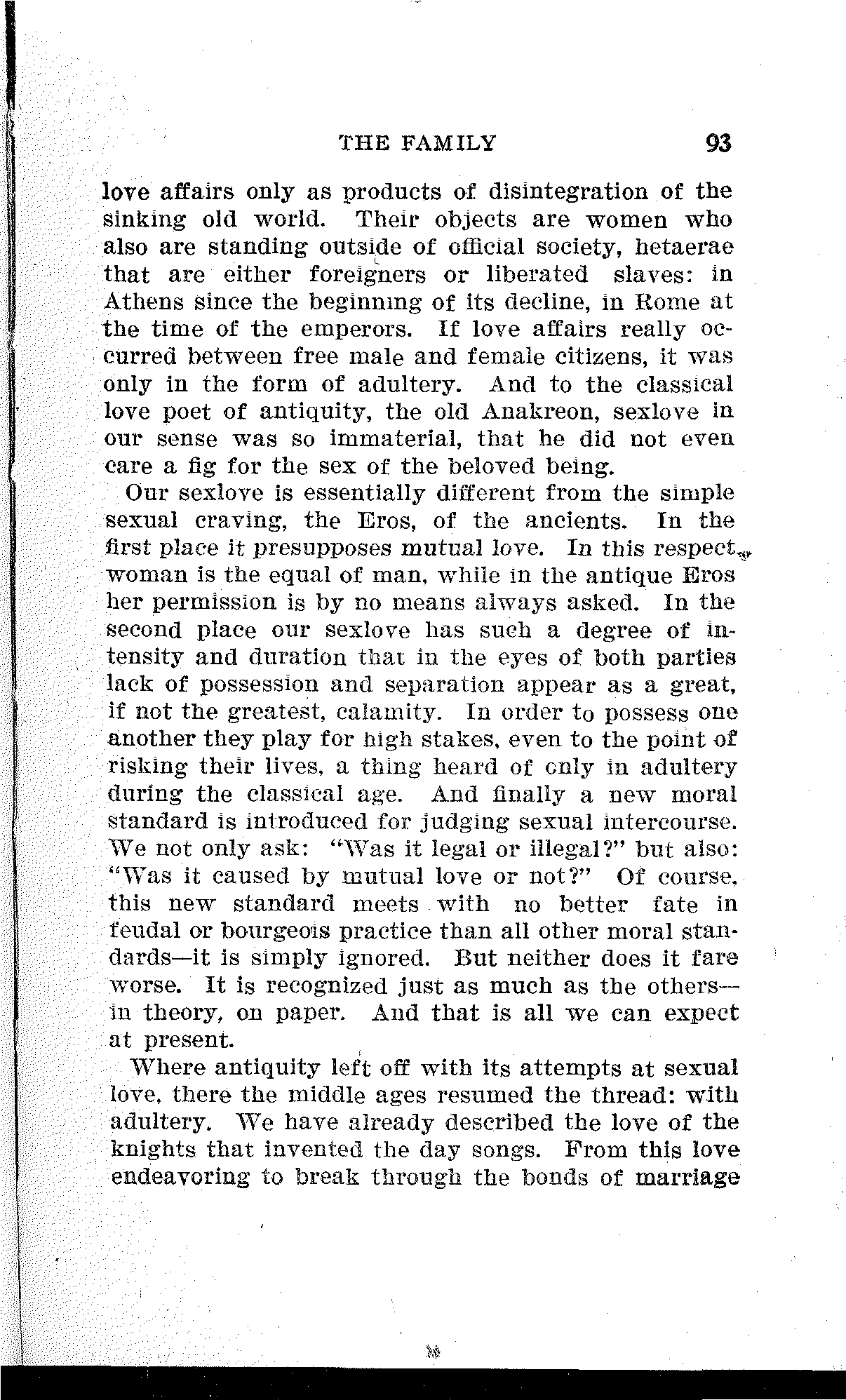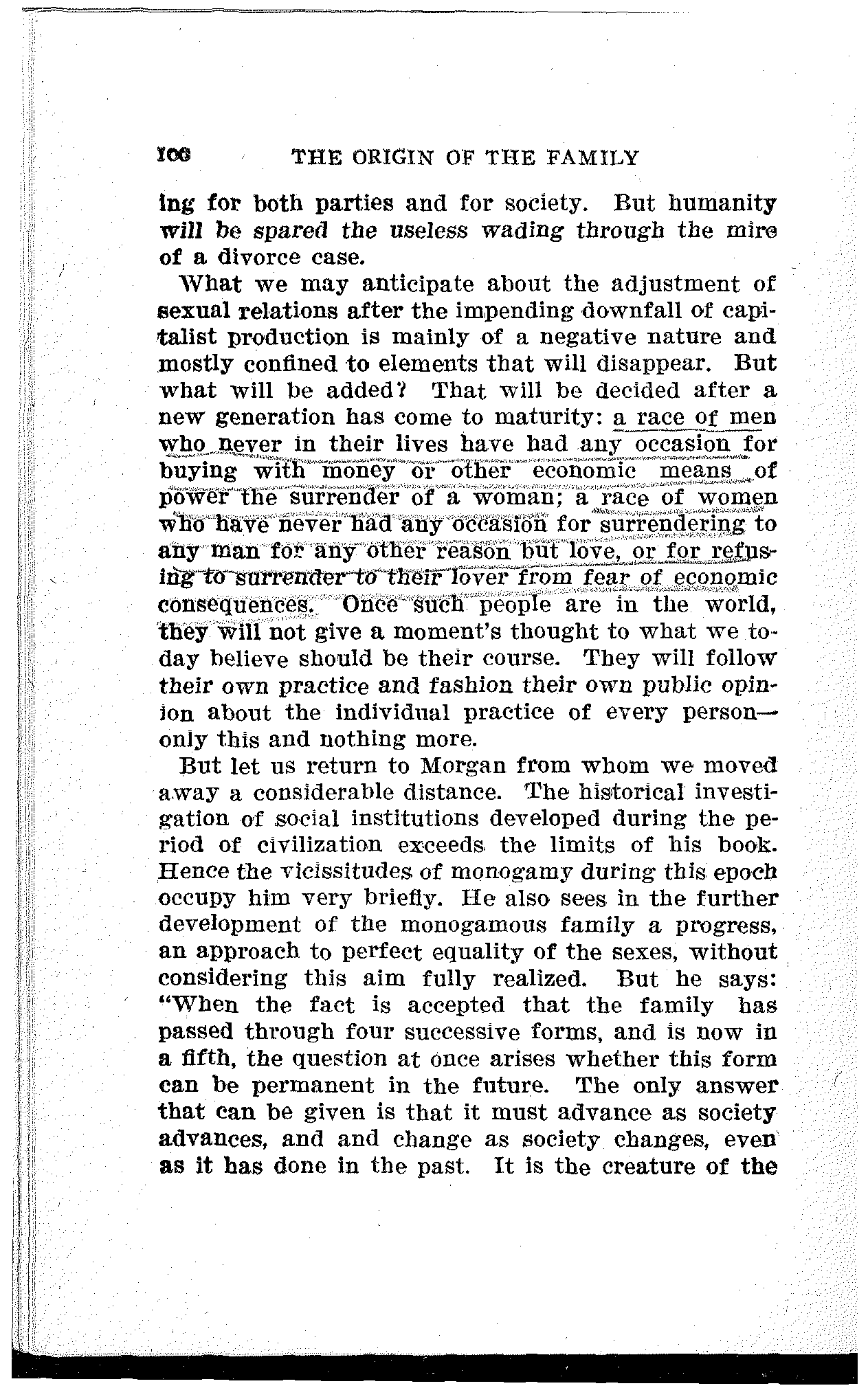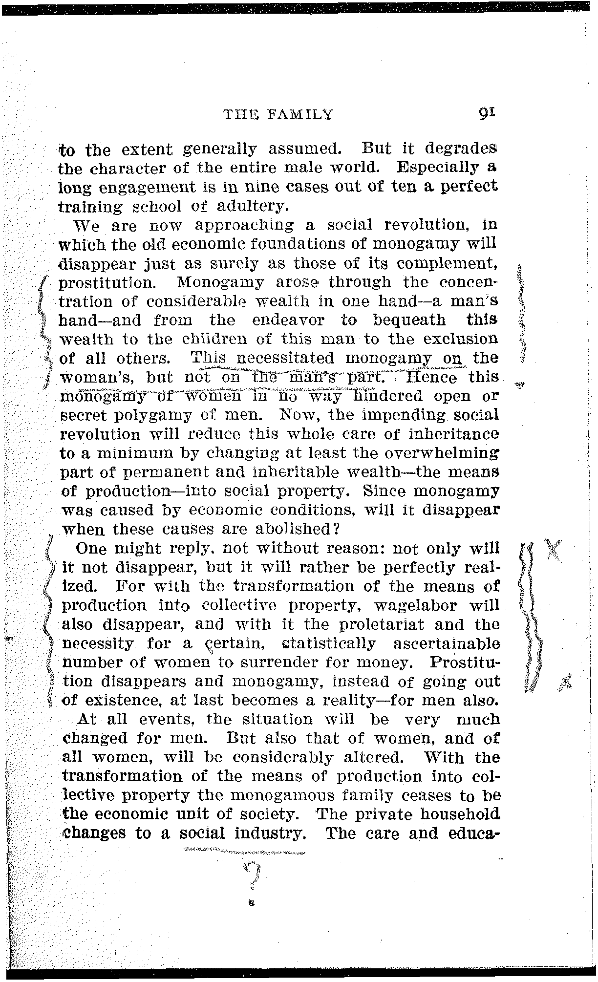 None of these men could discuss the matter from the proletarian point of view. For in order to do this, it is necessary to descend from the hills of class assumption into the valley of proletarian class-consciousness. This consciousness and the socialist mind are born together. The key to the philosophy of capitalism is the philosophy of socialism. With the rays of this searchlight, Engels exposed the pious "deceivers," property and the state, and their "lofty" ideal, covetousness. And the monogamic family, so far from being a divinely instituted "union of souls," is seen to be the product of a series of material and, in the last analysis, of the most sordid motives. But the ethics of property are worthy of a system of production that, in its final stage, shuts the overwhelming mass of longing humanity out from the happiness of home and family life, from all evolution to a higher individuality, and even drives progress back and forces millions of human beings into irrevocable degeneration.
