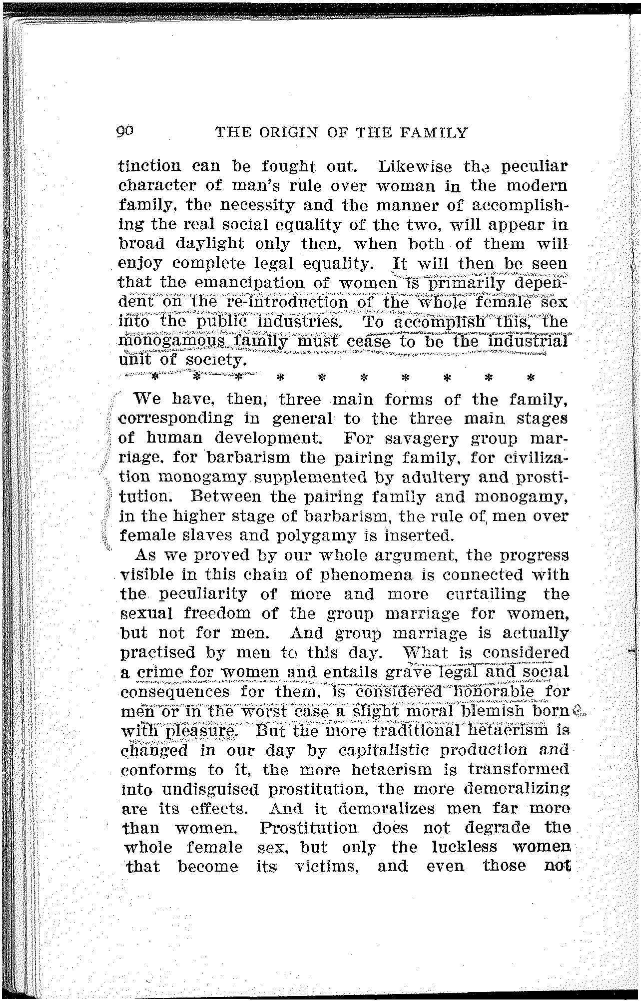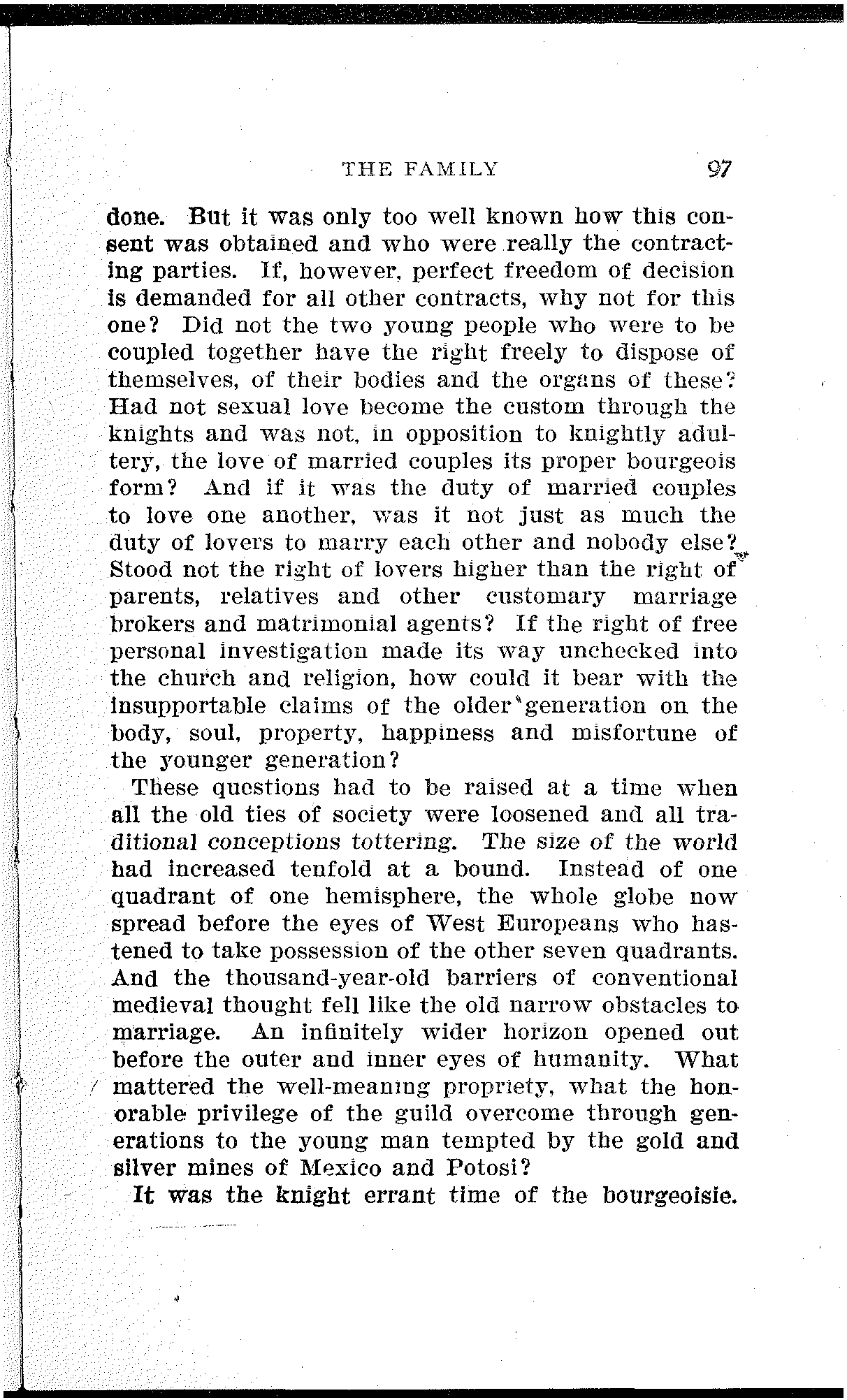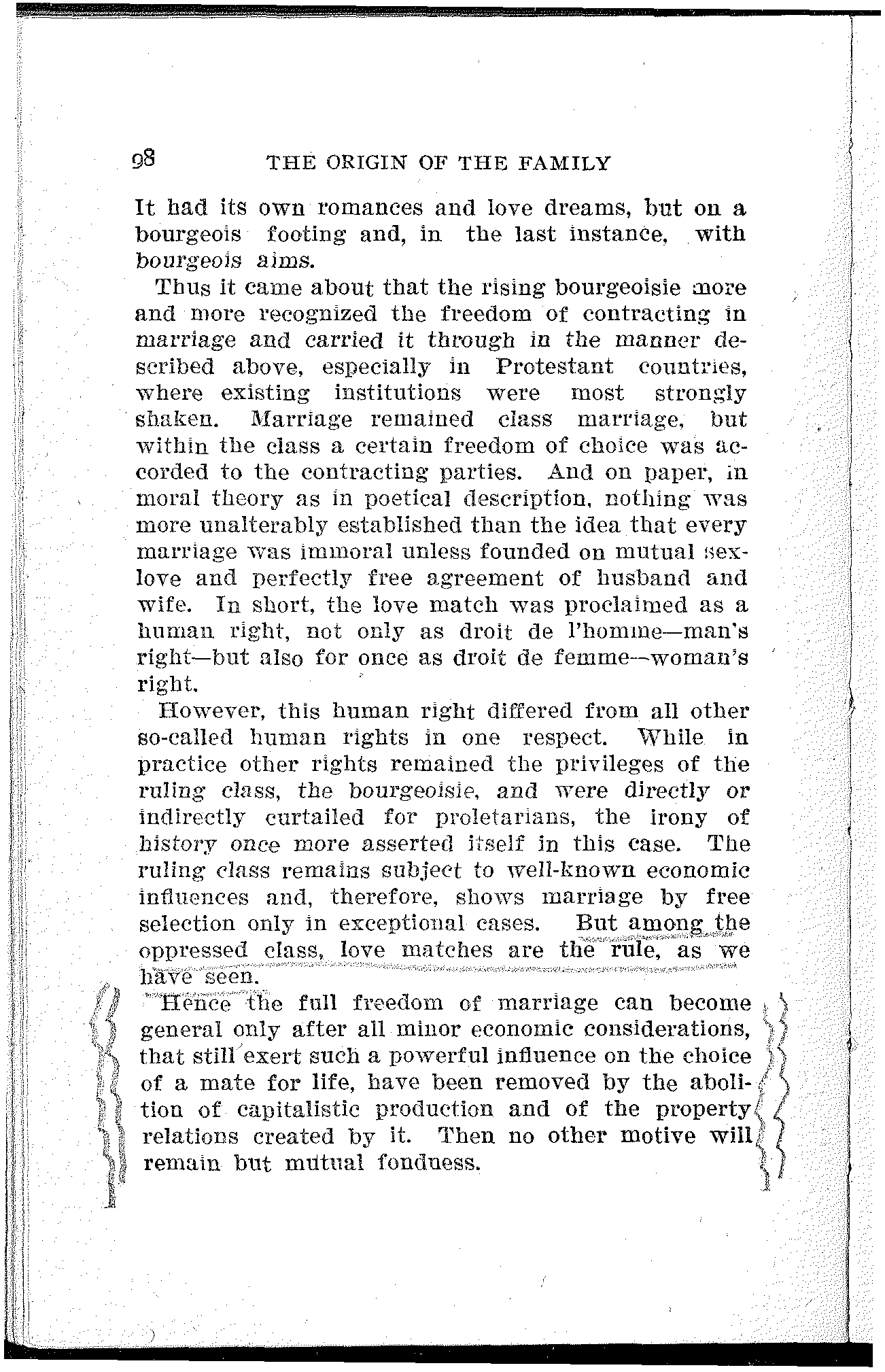 None of these men could discuss the matter from the proletarian point of view. For in order to do this, it is necessary to descend from the hills of class assumption into the valley of proletarian class-consciousness. This consciousness and the socialist mind are born together. The key to the philosophy of capitalism is the philosophy of socialism. With the rays of this searchlight, Engels exposed the pious "deceivers," property and the state, and their "lofty" ideal, covetousness. And the monogamic family, so far from being a divinely instituted "union of souls," is seen to be the product of a series of material and, in the last analysis, of the most sordid motives. But the ethics of property are worthy of a system of production that, in its final stage, shuts the overwhelming mass of longing humanity out from the happiness of home and family life, from all evolution to a higher individuality, and even drives progress back and forces millions of human beings into irrevocable degeneration.