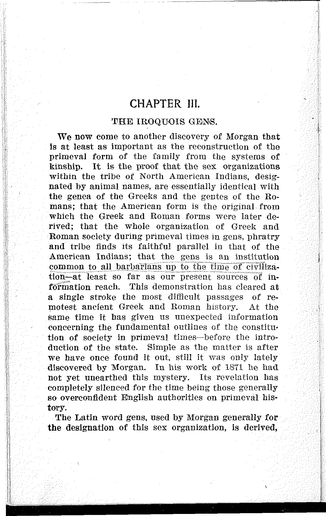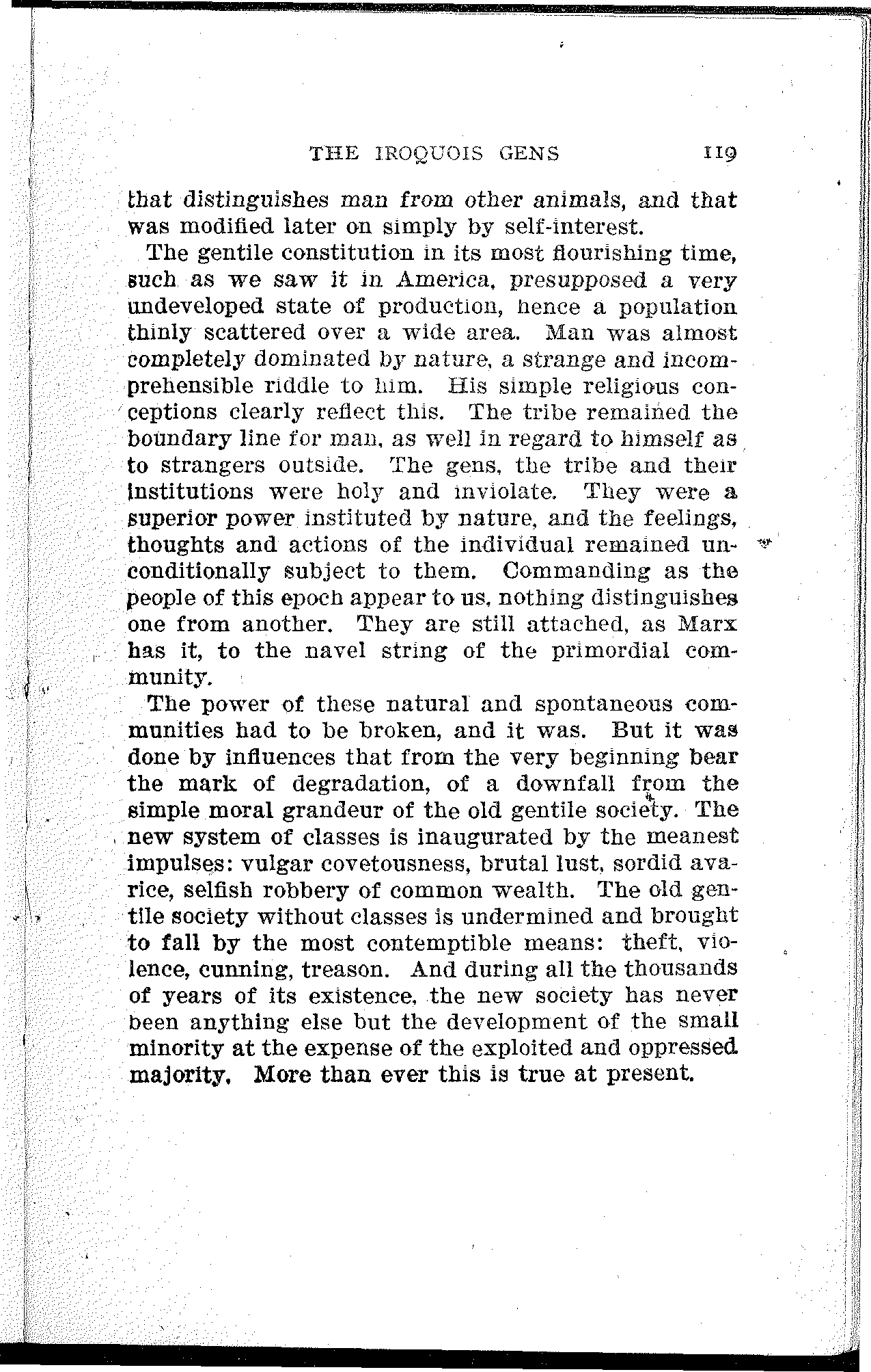 But the forces, which have brought about the [6]present social order, continue their work regardless of the wishes of a few exploiters. A comprehensive work summarizing our present knowledge of the development of social institutions is, therefore, a timely contribution to socialist propaganda. In order to meet the requirements of socialists, such a summary must be written by a socialist. All the scientists who devoted themselves to the study of primeval society belonged to the privileged classes, and even the most radical of them, Lewis Morgan, was prevented by his environment from pointing out the one fact, the recognition of which distinguishes the socialist position from all others—THE EXISTENCE OF A CLASS STRUGGLE.