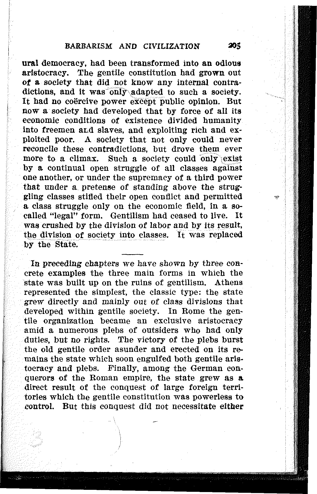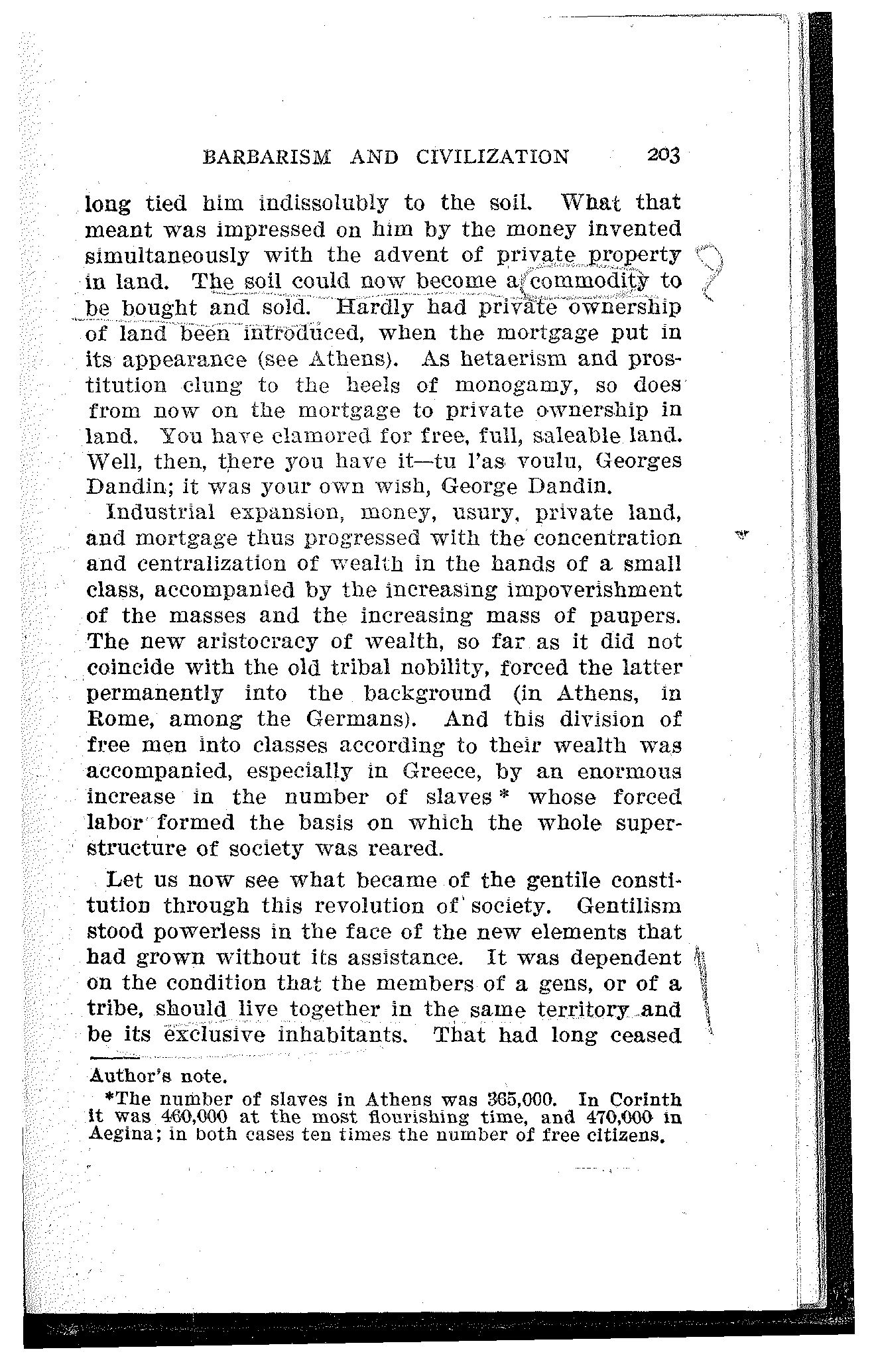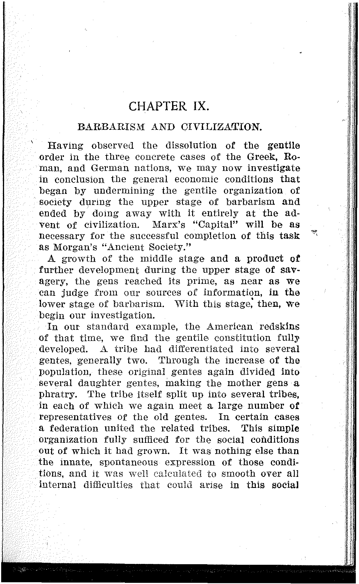 Having observed the dissolution of the gentile order in the three concrete cases of the Greek, Roman, and German nations, we may now investigate in conclusion the general economic conditions that began by undermining the gentile organization of society during the upper stage of barbarism and ended by doing away with it entirely at the advent of civilization. Marx's "Capital" will be as necessary for the successful completion of this task as Morgan's "Ancient Society."
