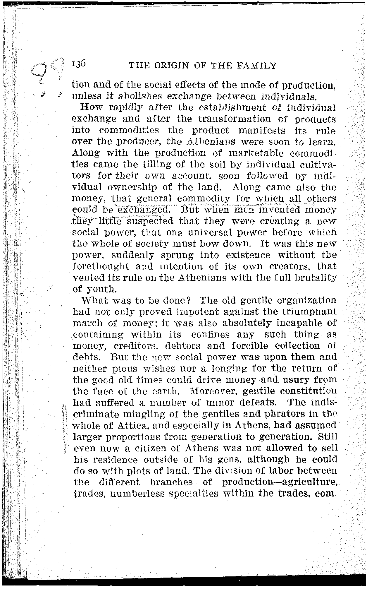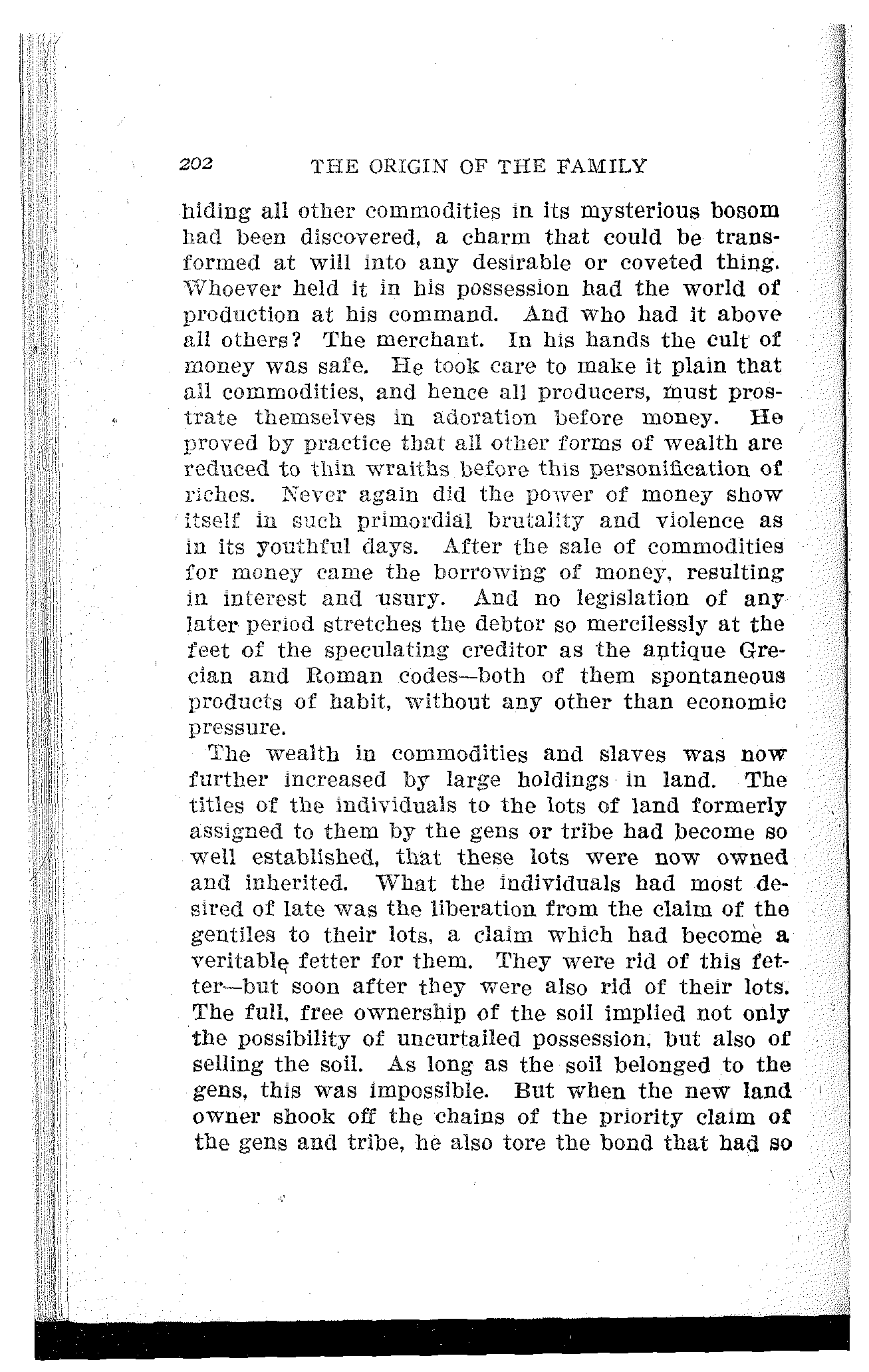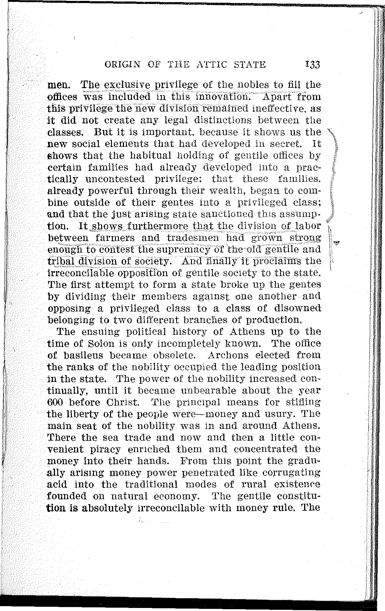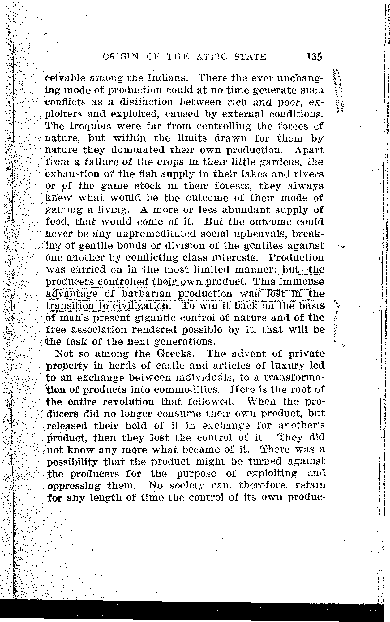Having observed the dissolution of the gentile order in the three concrete cases of the Greek, Roman, and German nations, we may now investigate in conclusion the general economic conditions that began by undermining the gentile organization of society during the upper stage of barbarism and ended by doing away with it entirely at the advent of civilization. Marx's "Capital" will be as necessary for the successful completion of this task as Morgan's "Ancient Society."