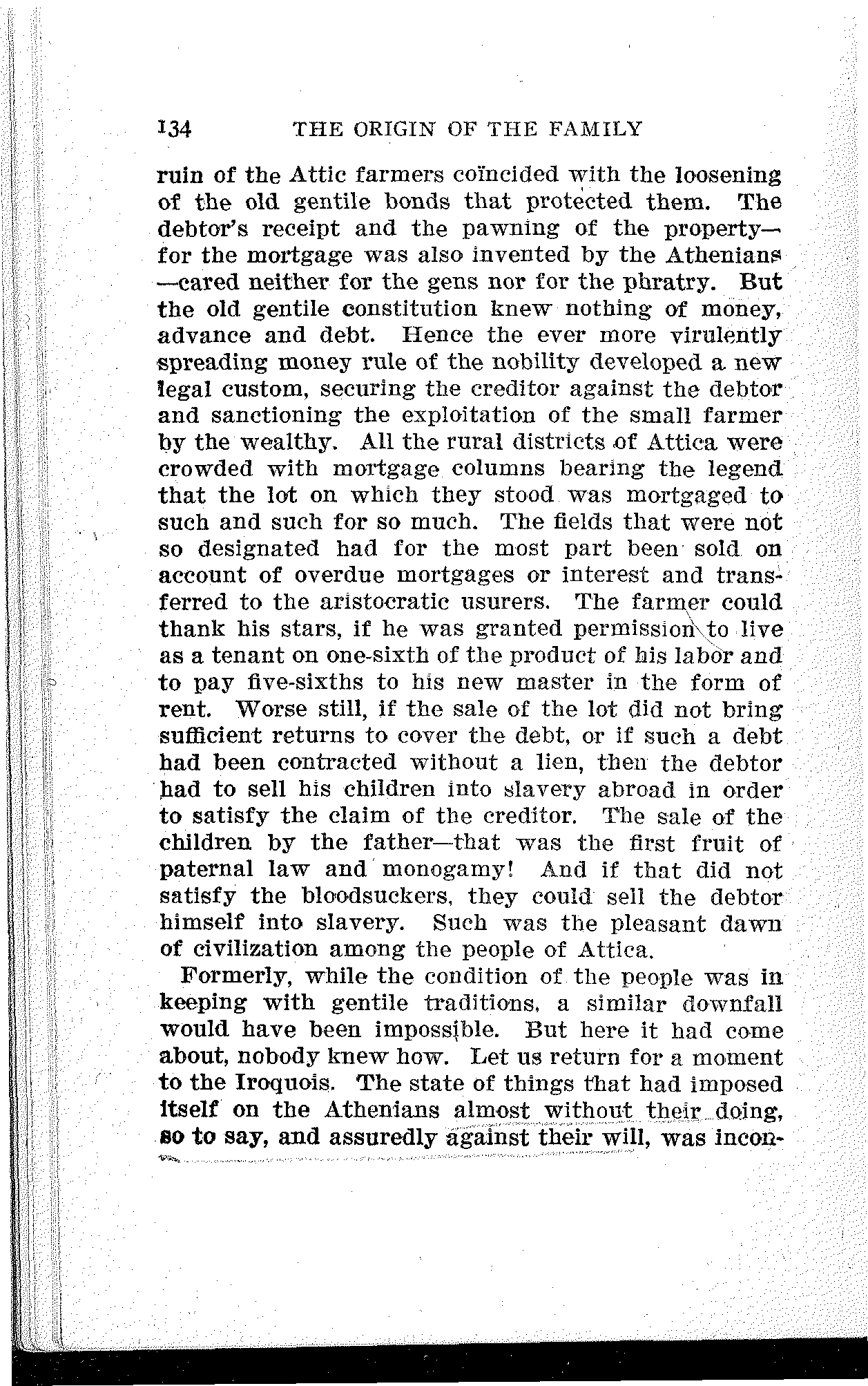 The wealth in commodities and slaves was now further increased by large holdings in land. The titles of the individuals to the lots of land formerly assigned to them by the gens or tribe had become so well established, that these lots were now owned and inherited. What the individuals had most desired of late was the liberation from the claim of the gentiles to their lots, a claim which had become a veritable fetter for them. They were rid of this fetter—but soon after they were also rid of their lots. The full, free ownership of the soil implied not only the possibility of uncurtailed possession, but also of selling the soil. As long as the soil belonged to the gens, this was impossible. But when the new land owner shook off the chains of the priority claim of the gens and tribe, he also tore the bond that had so[203] long tied him indissolubly to the soil. What that meant was impressed on him by the money invented simultaneously with the advent of private property in land. The soil could now become a commodity to be bought and sold. Hardly had private ownership of land been introduced, when the mortgage put in its appearance (see Athens). As hetaerism and prostitution clung to the heels of monogamy, so does from now on the mortgage to private ownership in land. You have clamored for free, full, saleable land. Well, then, there you have it—tu l'as voulu, Georges Dandin; it was your own wish, George Dandin.