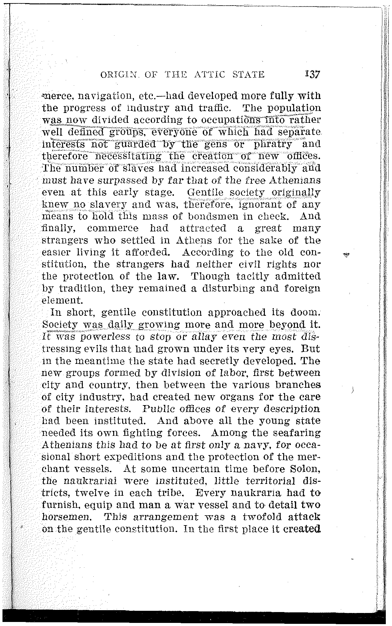 Let us now see what became of the gentile constitution through this revolution of society. Gentilism stood powerless in the face of the new elements that had grown without its assistance. It was dependent on the condition that the members of a gens, or of a tribe, should live together in the same territory and be its exclusive inhabitants. That had long ceased[204] to be the case. Gentes and tribes were everywhere hopelessly intermingled, slaves, clients, and foreigners lived among citizens. The capacity for settling down permanently which had only been acquired near the end of the middle stage of barbarism, was time and again sidetracked by the necessity of changing the abode according to the dictates of commerce, different occupations and the transfer of land. The members of the gentile organizations could no longer meet for the purpose of taking care of their common interests. Only matters of little importance, such as religious festivals, were still observed in an indifferent way. Beside the wants and interests for the care of which the gentile organs were appointed and fitted, new wants and interests had arisen from the revolution of the conditions of existence and the resulting change in social classification. These new wants and interests were not only alien to the old gentile order, but thwarted it in every way. The interests of the craftsmen created by division of labor, and the special necessities of a town differing from those of the country, required new organs. But every one of these groups was composed of people from different gentes, phratries, and tribes; they included even strangers. Hence the new organs necessarily had to form outside of the gentile constitution. But by the side of it meant against it. And again, in every gentile organization the conflict of interests made itself felt and reached its climax by combining rich and poor, usurers and debtors, in the same gens and tribe. There was furthermore the mass of inhabitants who were strangers to the gentiles. These strangers could become very powerful, as in Rome, and they were too numerous to be gradually absorbed by the gentes and tribes. The gentiles confronted these masses as a compact body of privileged individuals. What had once been a [205]natural democracy, had been transformed into an odious aristocracy. The gentile constitution had grown out of a society that did not know any internal contradictions, and it was only adapted to such a society. It had no coërcive power except public opinion. But now a society had developed that by force of all its economic conditions of existence divided humanity into freemen and slaves, and exploiting rich and exploited poor. A society that not only could never reconcile these contradictions, but drove them ever more to a climax. Such a society could only exist by a continual open struggle of all classes against one another, or under the supremacy of a third power that under a pretense of standing above the struggling classes stifled their open conflict and permitted a class struggle only on the economic field, in a so-called "legal" form. Gentilism had ceased to live. It was crushed by the division of labor and by its result, the division of society into classes. It was replaced by the State.