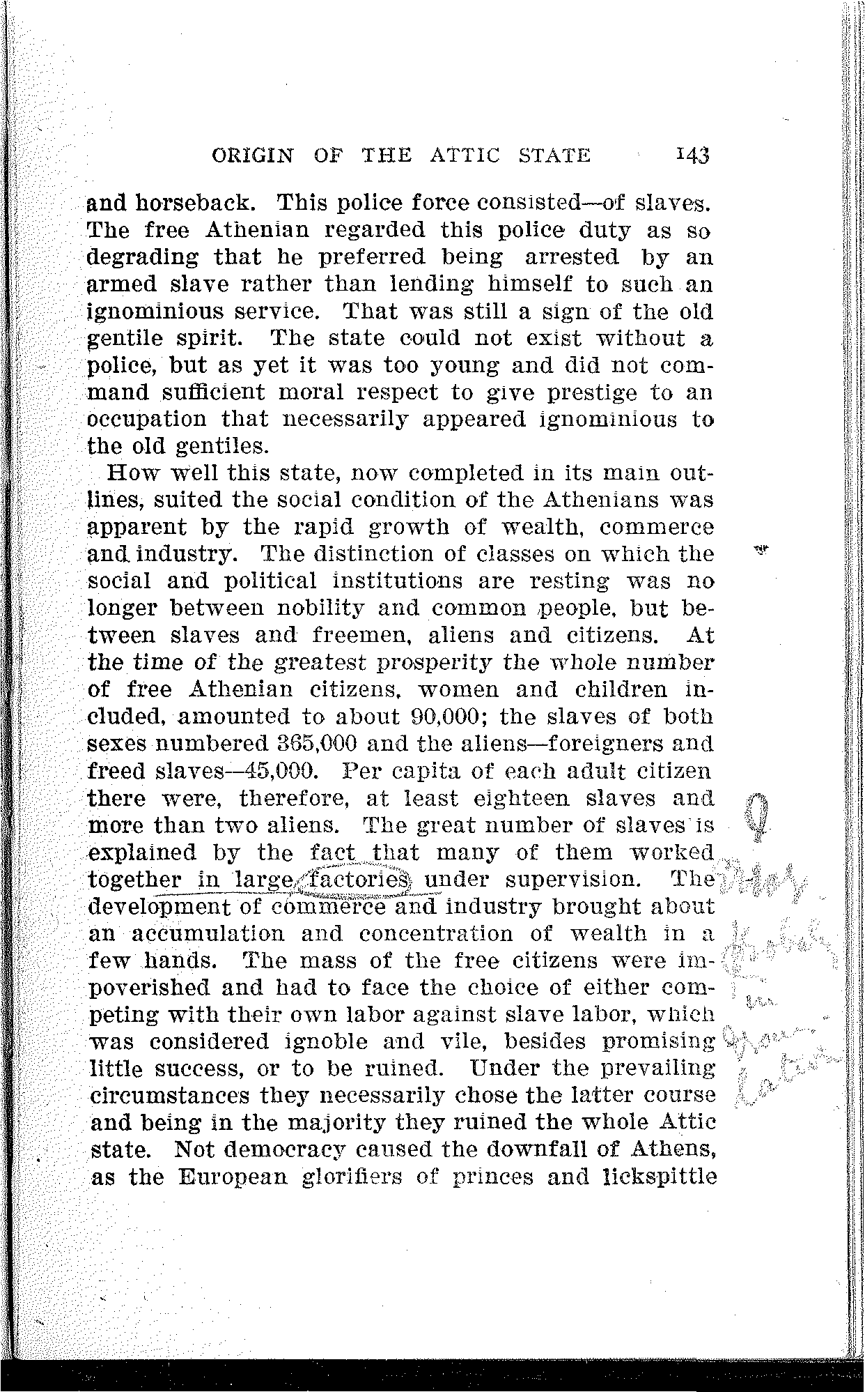 The number of slaves in Athens was 365,000. In Corinth it was 460,000 at the most flourishing time, and 470,000 in Aegina; in both cases ten times the number of free citizens.