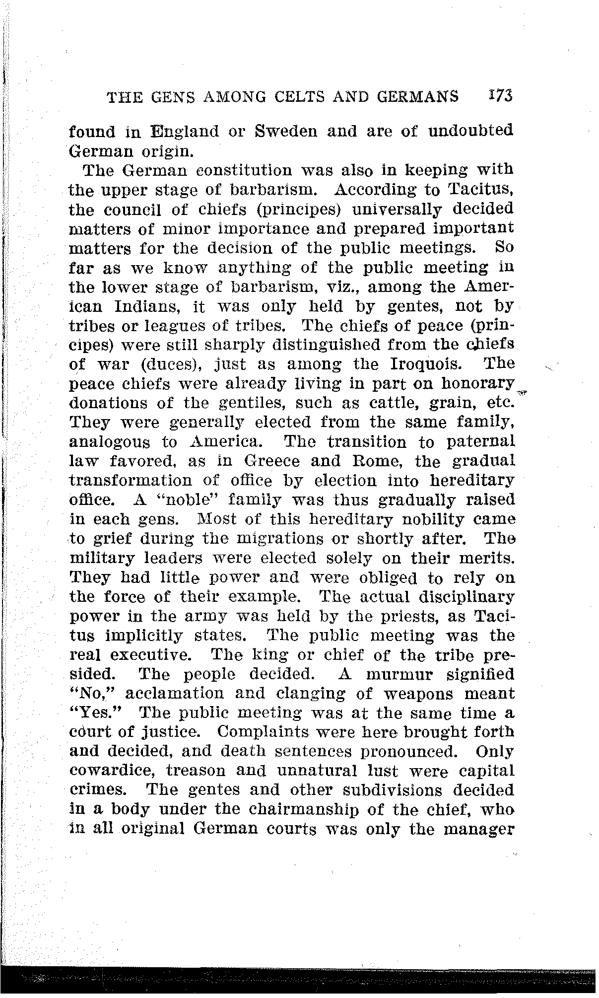 In the following demonstrations, the reader will, on the whole, easily distinguish what originated with Morgan and what was added by myself. In the historical sections on Greece and Rome, I have not limited myself to Morgan's material, but have added as much as I could supply. The sections on Celts and Germans essentially belong to me. Morgan had only sources of minor quality at his disposal, and for German conditions—aside from Tacitus—only the worthless, unbridled falsifications of Freeman. The economic deductions, sufficient for Morgan's purpose, but wholly inadequate for mine, were treated anew by myself. And lastly I am, of course, responsible for all final conclusions, unless Morgan is expressly quoted.