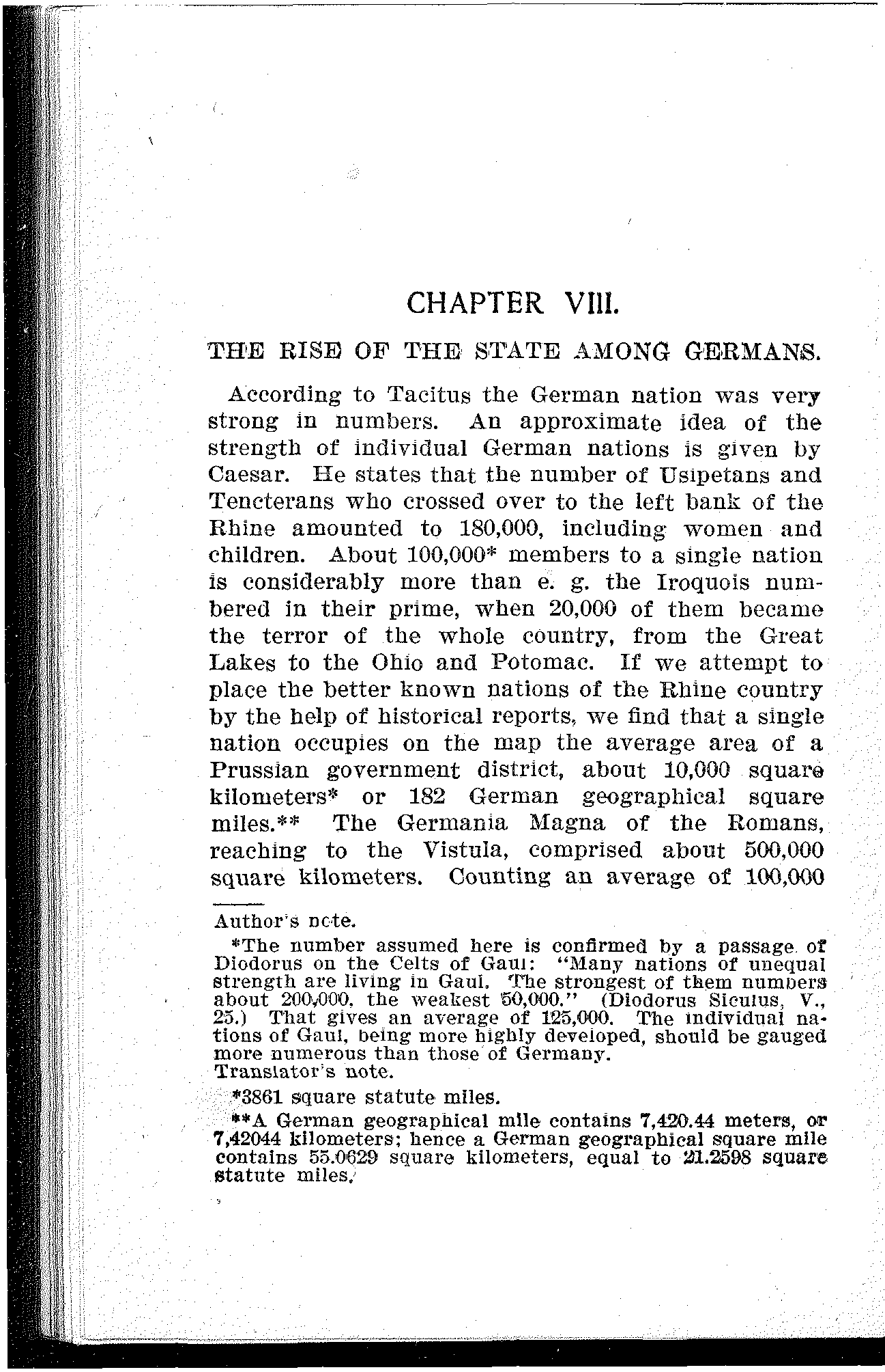 According to Tacitus the German nation was very strong in numbers. An approximate idea of the strength of individual German nations is given by Caesar. He states that the number of Usipetans and Tencterans who crossed over to the left bank of the Rhine amounted to 180,000, including women and children. About 100,000[30] members to a single nation is considerably more than e. g. the Iroquois numbered in their prime, when 20,000 of them became the terror of the whole country, from the Great Lakes to the Ohio and Potomac. If we attempt to place the better known nations of the Rhine country by the help of historical reports, we find that a single nation occupies on the map the average area of a Prussian government district, about 10,000 square kilometers[31] or 182 German geographical square miles.[32] The Germania Magna of the Romans, reaching to the Vistula, comprised about 500,000 square kilometers. Counting an average of 100,000[177] for any single nation, the total population of Germania Magna would have amounted to five millions. This is a rather high figure for a barbarian group of nations, although 10 inhabitants to the square kilometer or 550 to the geographical square mile is very little when compared to present conditions. But this does not include the whole number of Germans then living. We know that German nations of the Gothic race, Bastarnians, Peukinians and others, lived all along the Carpathian mountains away down to the mouth of the Danube. They were so numerous that Pliny designated them as the fifth main division of the Germans. As much as 180 years B. C. they were mercenaries of the Macedonian King Perseus, and during the first years of Augustus they were still pushing their way as far as the vicinity of Adrianople. Assuming them to have been one million strong we find that at least six millions was the probable population of Germany at the beginning of the Christian era.