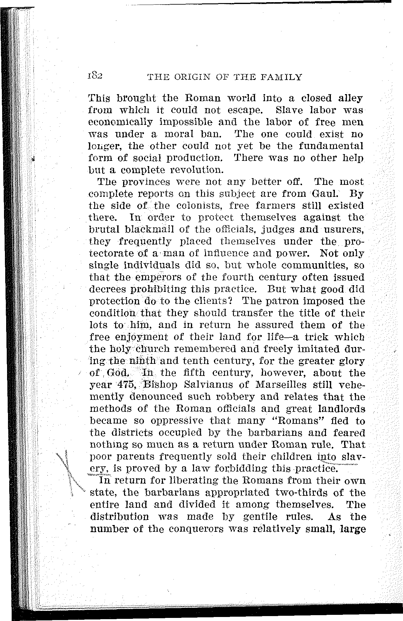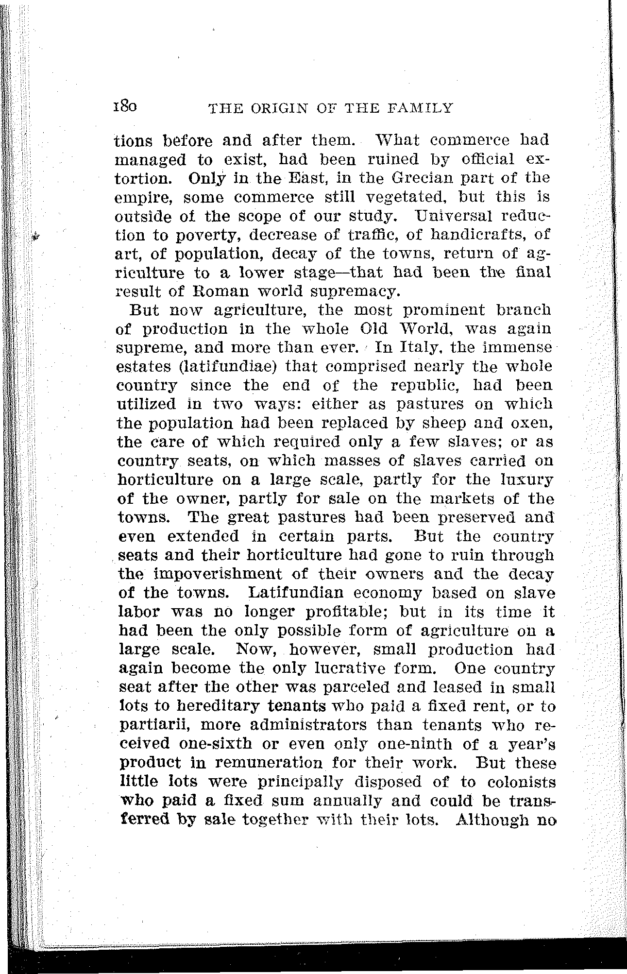 But now agriculture, the most prominent branch of production in the whole Old World, was again supreme, and more than ever. In Italy, the immense estates (latifundiae) that comprised nearly the whole country since the end of the republic, had been utilized in two ways: either as pastures on which the population had been replaced by sheep and oxen, the care of which required only a few slaves; or as country seats, on which masses of slaves carried on horticulture on a large scale, partly for the luxury of the owner, partly for sale on the markets of the towns. The great pastures had been preserved and even extended in certain parts. But the country seats and their horticulture had gone to ruin through the impoverishment of their owners and the decay of the towns. Latifundian economy based on slave labor was no longer profitable; but in its time it had been the only possible form of agriculture on a large scale. Now, however, small production had again become the only lucrative form. One country seat after the other was parceled and leased in small lots to hereditary tenants who paid a fixed rent, or to partiarii, more administrators than tenants who received one-sixth or even only one-ninth of a year's product in remuneration for their work. But these little lots were principally disposed of to colonists who paid a fixed sum annually and could be transferred by sale together with their lots. Although no[181] slaves, still these colonists were not free; they could not marry free citizens, and marriages with members of their own class were not regarded as valid, but as mere concubinages like those of the slaves. The colonists were the prototypes of the medieval serfs.