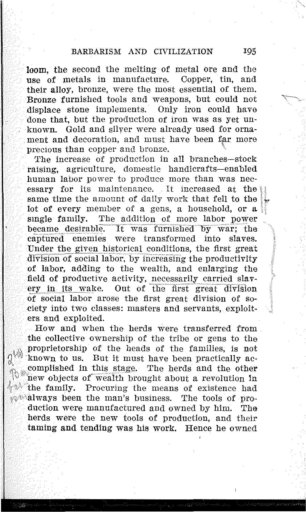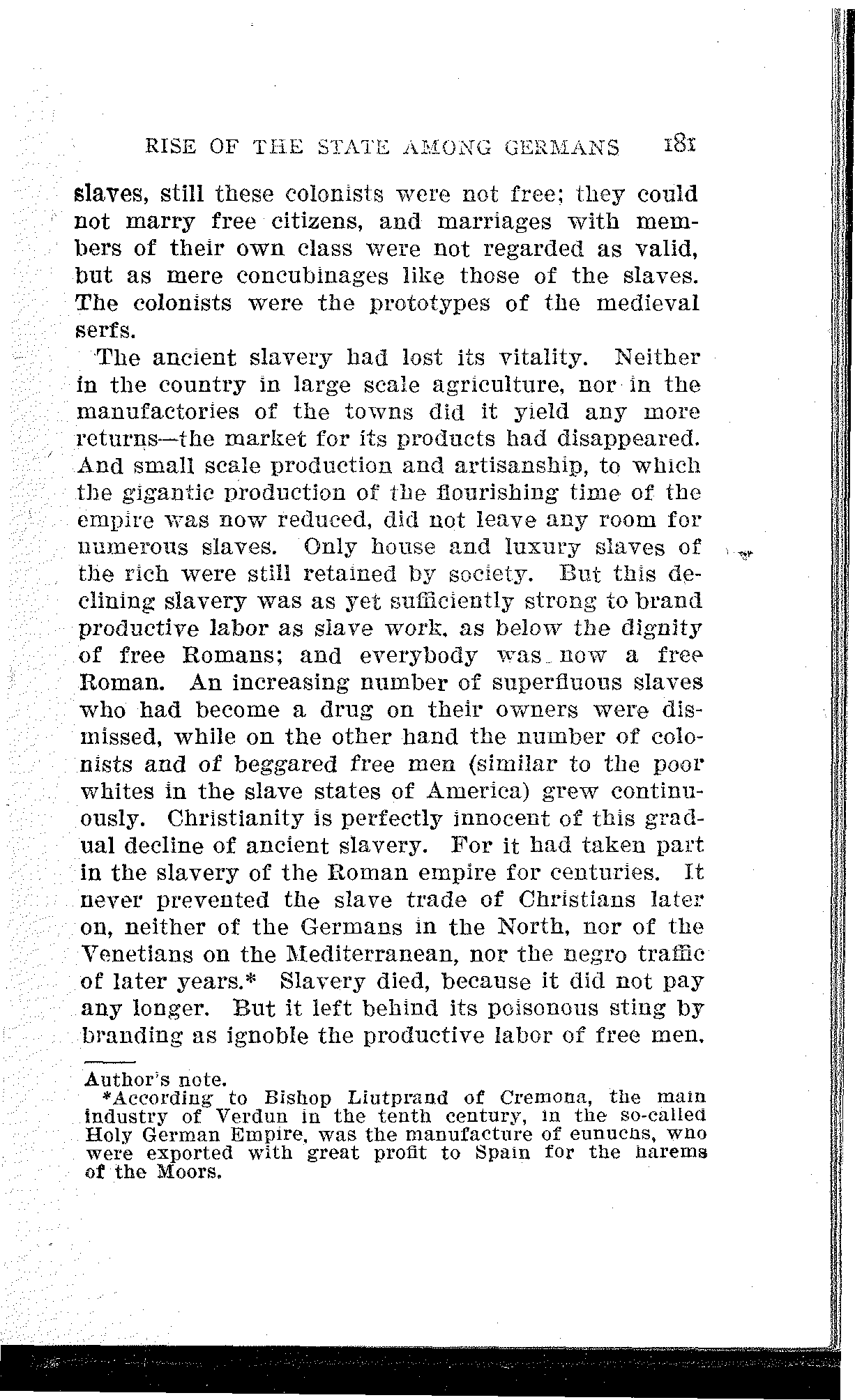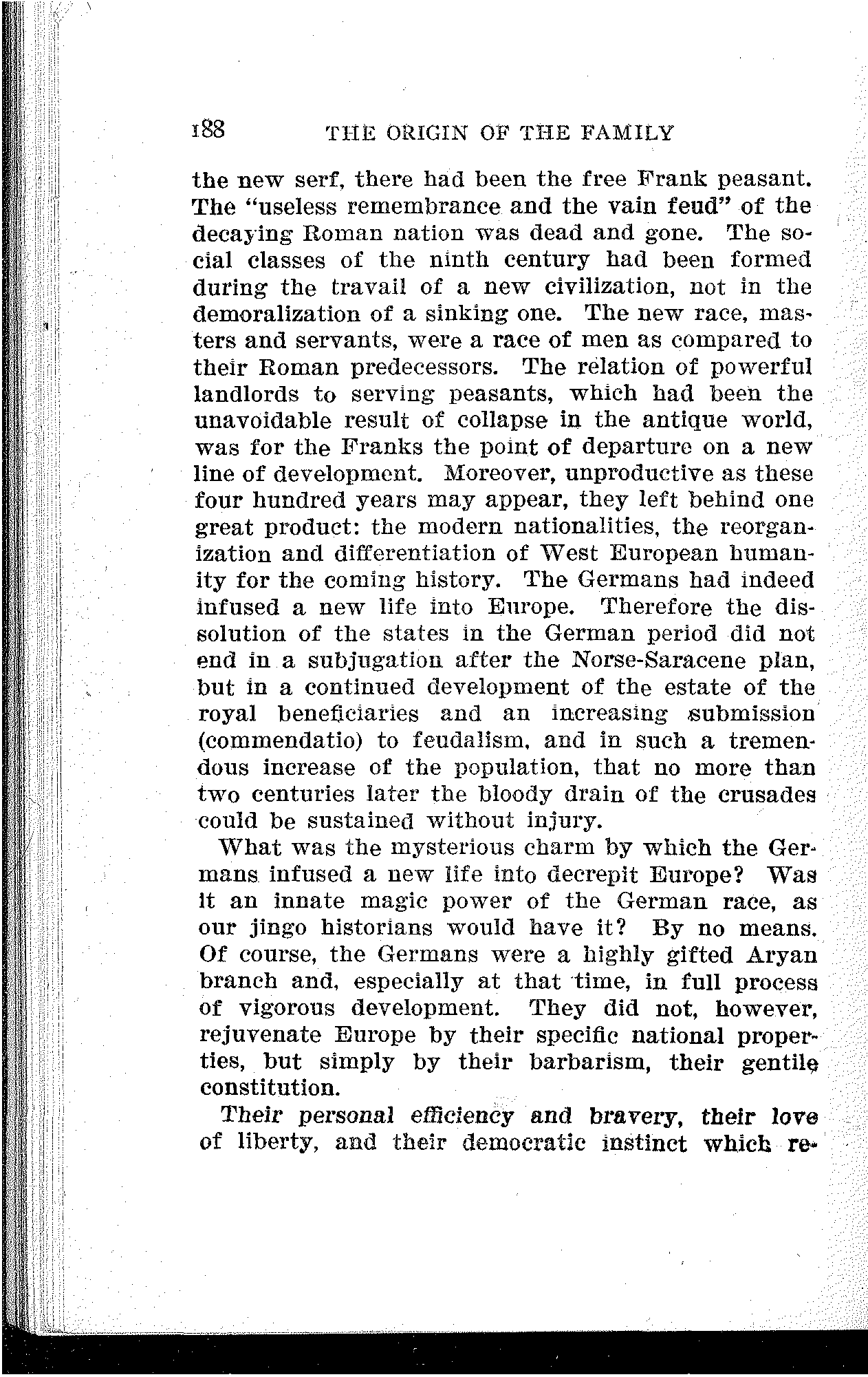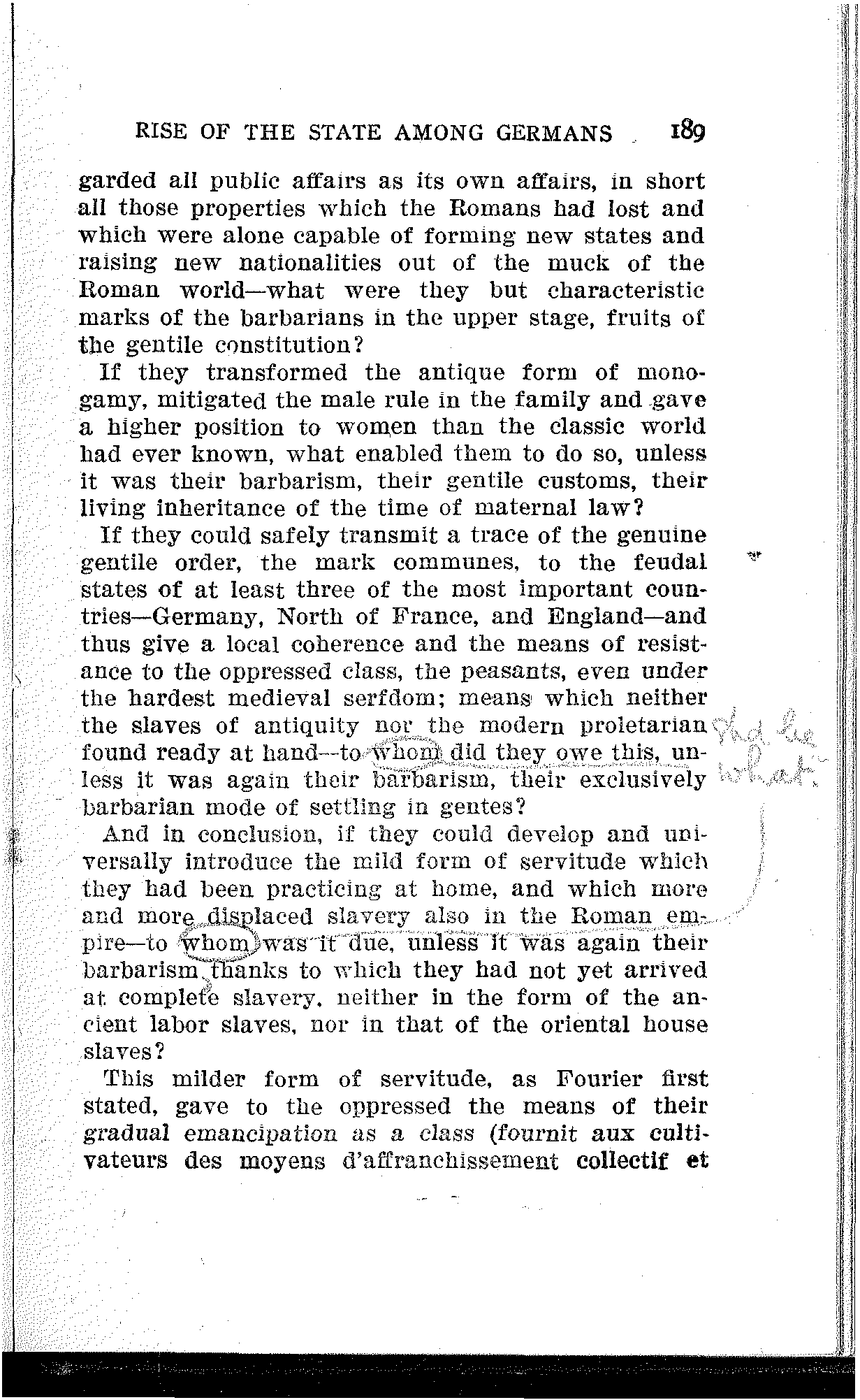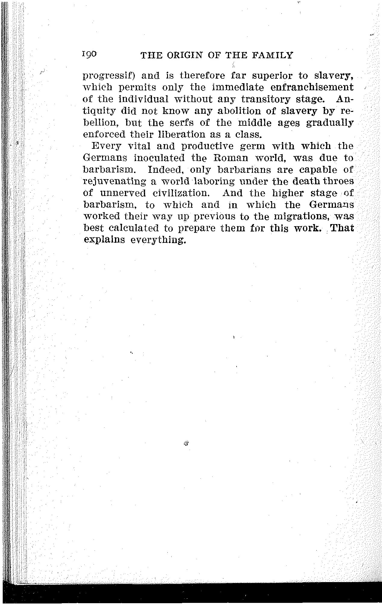 And in conclusion, if they could develop and universally introduce the mild form of servitude which they had been practicing at home, and which more and more displaced slavery also in the Roman empire—to whom was it due, unless it was again their barbarism, thanks to which they had not yet arrived at complete slavery, neither in the form of the ancient labor slaves, nor in that of the oriental house slaves?