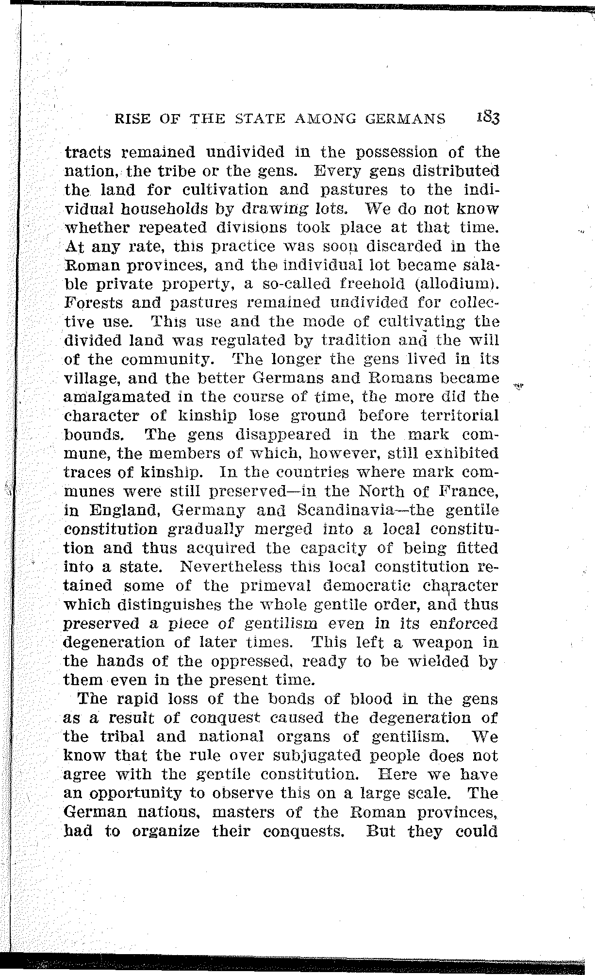 In return for liberating the Romans from their own state, the barbarians appropriated two-thirds of the entire land and divided it among themselves. The distribution was made by gentile rules. As the number of the conquerors was relatively small, large[183] tracts remained undivided in the possession of the nation, the tribe or the gens. Every gens distributed the land for cultivation and pastures to the individual households by drawing lots. We do not know whether repeated divisions took place at that time. At any rate, this practice was soon discarded in the Roman provinces, and the individual lot became salable private property, a so-called freehold (allodium). Forests and pastures remained undivided for collective use. This use and the mode of cultivating the divided land was regulated by tradition and the will of the community. The longer the gens lived in its village, and the better Germans and Romans became amalgamated in the course of time, the more did the character of kinship lose ground before territorial bounds. The gens disappeared in the mark commune, the members of which, however, still exhibited traces of kinship. In the countries where mark communes were still preserved—in the North of France, in England, Germany and Scandinavia—the gentile constitution gradually merged into a local constitution and thus acquired the capacity of being fitted into a state. Nevertheless this local constitution retained some of the primeval democratic character which distinguishes the whole gentile order, and thus preserved a piece of gentilism even in its enforced degeneration of later times. This left a weapon in the hands of the oppressed, ready to be wielded by them even in the present time.