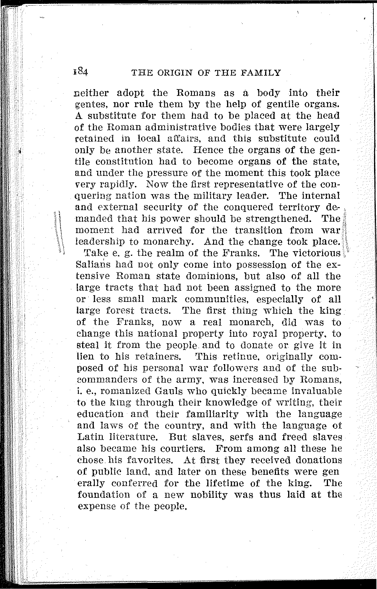 Take e. g. the realm of the Franks. The victorious Salians had not only come into possession of the extensive Roman state dominions, but also of all the large tracts that had not been assigned to the more or less small mark communities, especially of all large forest tracts. The first thing which the king of the Franks, now a real monarch, did was to change this national property into royal property, to steal it from the people and to donate or give it in lien to his retainers. This retinue, originally composed of his personal war followers and of the subcommanders of the army, was increased by Romans, i. e., romanized Gauls who quickly became invaluable to the king through their knowledge of writing, their education and their familiarity with the language and laws of the country, and with the language of Latin literature. But slaves, serfs and freed slaves also became his courtiers. From among all these he chose his favorites. At first they received donations of public land, and later on these benefits were generally conferred for the lifetime of the king. The foundation of a new nobility was thus laid at the expense of the people.