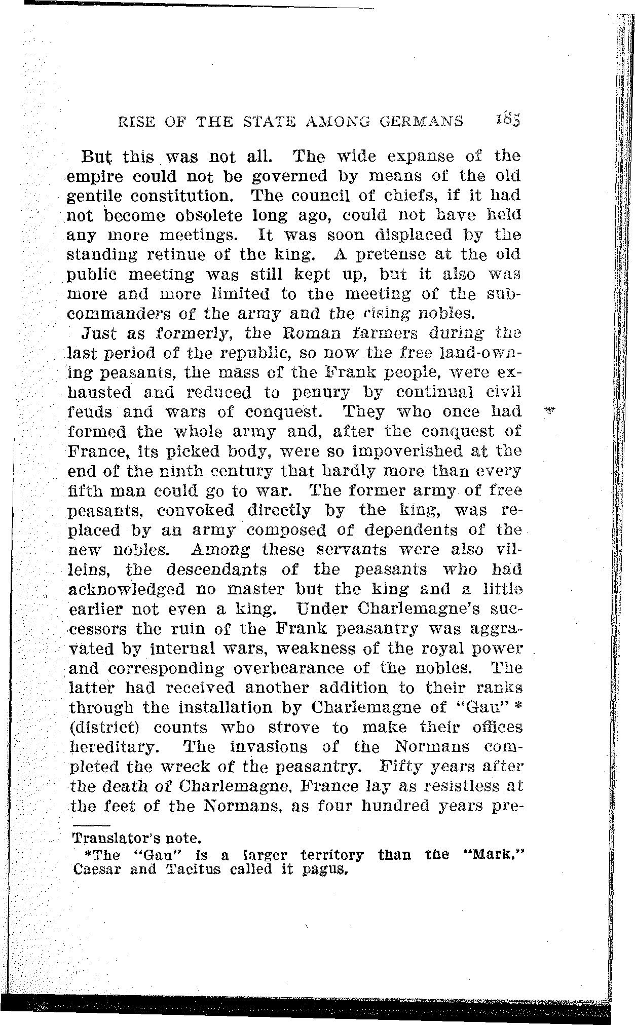 Just as formerly, the Roman farmers during the last period of the republic, so now the free land-owning peasants, the mass of the Frank people, were exhausted and reduced to penury by continual civil feuds and wars of conquest. They who once had formed the whole army and, after the conquest of France, its picked body, were so impoverished at the end of the ninth century that hardly more than every fifth man could go to war. The former army of free peasants, convoked directly by the king, was replaced by an army composed of dependents of the new nobles. Among these servants were also villeins, the descendants of the peasants who had acknowledged no master but the king and a little earlier not even a king. Under Charlemagne's successors the ruin of the Frank peasantry was aggravated by internal wars, weakness of the royal power and corresponding overbearance of the nobles. The latter had received another addition to their ranks through the installation by Charlemagne of "Gau"[35] (district) counts who strove to make their offices hereditary. The invasions of the Normans completed the wreck of the peasantry. Fifty years after the death of Charlemagne, France lay as resistless at the feet of the Normans, as four hundred years [186]previous the Roman empire had lain at the feet of the Franks.