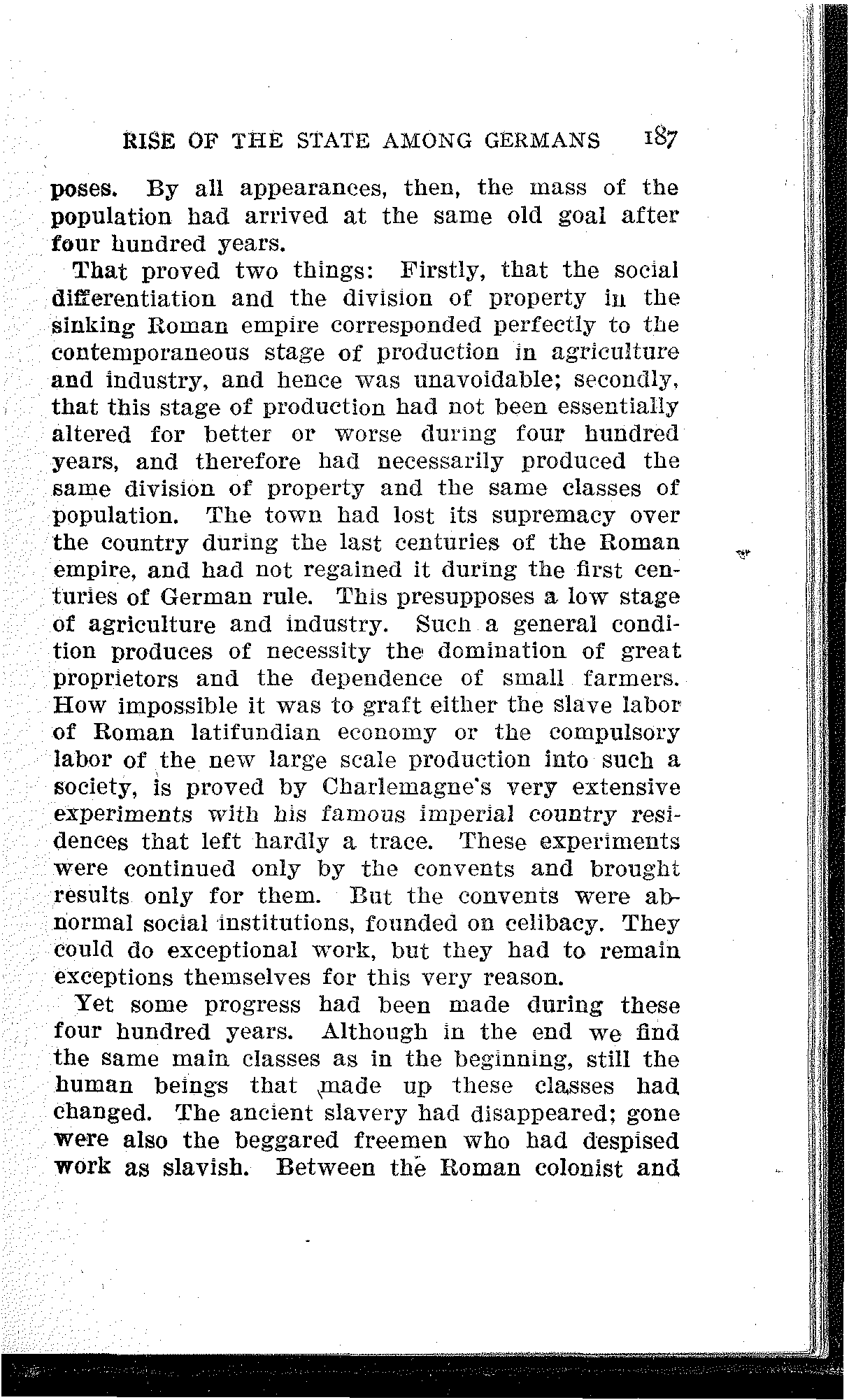 That proved two things: Firstly, that the social differentiation and the division of property in the sinking Roman empire corresponded perfectly to the contemporaneous stage of production in agriculture and industry, and hence was unavoidable; secondly, that this stage of production had not been essentially altered for better or worse during four hundred years, and therefore had necessarily produced the same division of property and the same classes of population. The town had lost its supremacy over the country during the last centuries of the Roman empire, and had not regained it during the first centuries of German rule. This presupposes a low stage of agriculture and industry. Such a general condition produces of necessity the domination of great proprietors and the dependence of small farmers. How impossible it was to graft either the slave labor of Roman latifundian economy or the compulsory labor of the new large scale production into such a society, is proved by Charlemagne's very extensive experiments with his famous imperial country residences that left hardly a trace. These experiments were continued only by the convents and brought results only for them. But the convents were abnormal social institutions, founded on celibacy. They could do exceptional work, but they had to remain exceptions themselves for this very reason.
