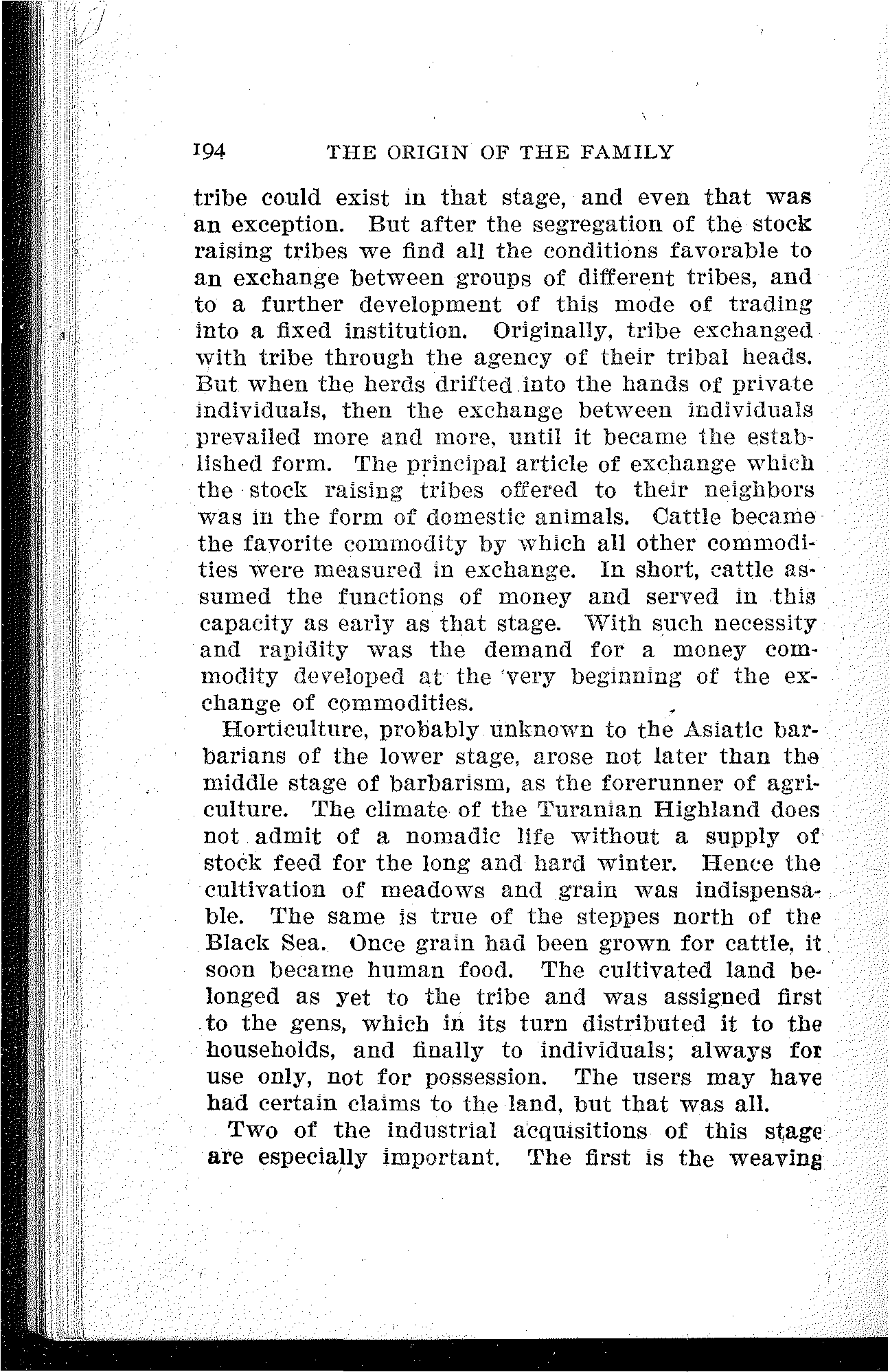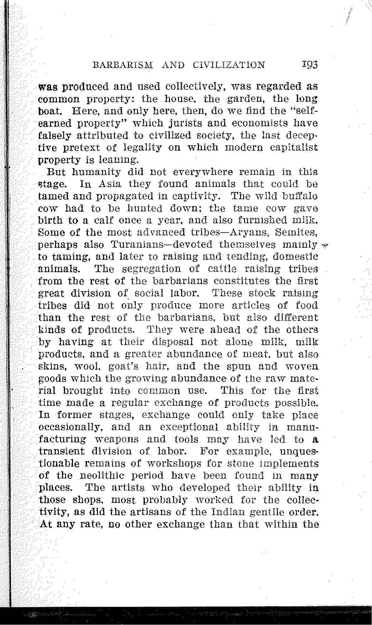 But humanity did not everywhere remain in this stage. In Asia they found animals that could be tamed and propagated in captivity. The wild buffalo cow had to be hunted down; the tame cow gave birth to a calf once a year, and also furnished milk. Some of the most advanced tribes—Aryans, Semites, perhaps also Turanians—devoted themselves mainly to taming, and later to raising and tending, domestic animals. The segregation of cattle raising tribes from the rest of the barbarians constitutes the first great division of social labor. These stock raising tribes did not only produce more articles of food than the rest of the barbarians, but also different kinds of products. They were ahead of the others by having at their disposal not alone milk, milk products, and a greater abundance of meat, but also skins, wool, goat's hair, and the spun and woven goods which the growing abundance of the raw material brought into common use. This for the first time made a regular exchange of products possible. In former stages, exchange could only take place occasionally, and an exceptional ability in manufacturing weapons and tools may have led to a transient division of labor. For example, unquestionable remains of workshops for stone implements of the neolithic period have been found in many places. The artists who developed their ability in those shops, most probably worked for the collectivity, as did the artisans of the Indian gentile order. At any rate, no other exchange than that within the[194] tribe could exist in that stage, and even that was an exception. But after the segregation of the stock raising tribes we find all the conditions favorable to an exchange between groups of different tribes, and to a further development of this mode of trading into a fixed institution. Originally, tribe exchanged with tribe through the agency of their tribal heads. But when the herds drifted into the hands of private individuals, then the exchange between individuals prevailed more and more, until it became the established form. The principal article of exchange which the stock raising tribes offered to their neighbors was in the form of domestic animals. Cattle became the favorite commodity by which all other commodities were measured in exchange. In short, cattle assumed the functions of money and served in this capacity as early as that stage. With such necessity and rapidity was the demand for a money commodity developed at the very beginning of the exchange of commodities.