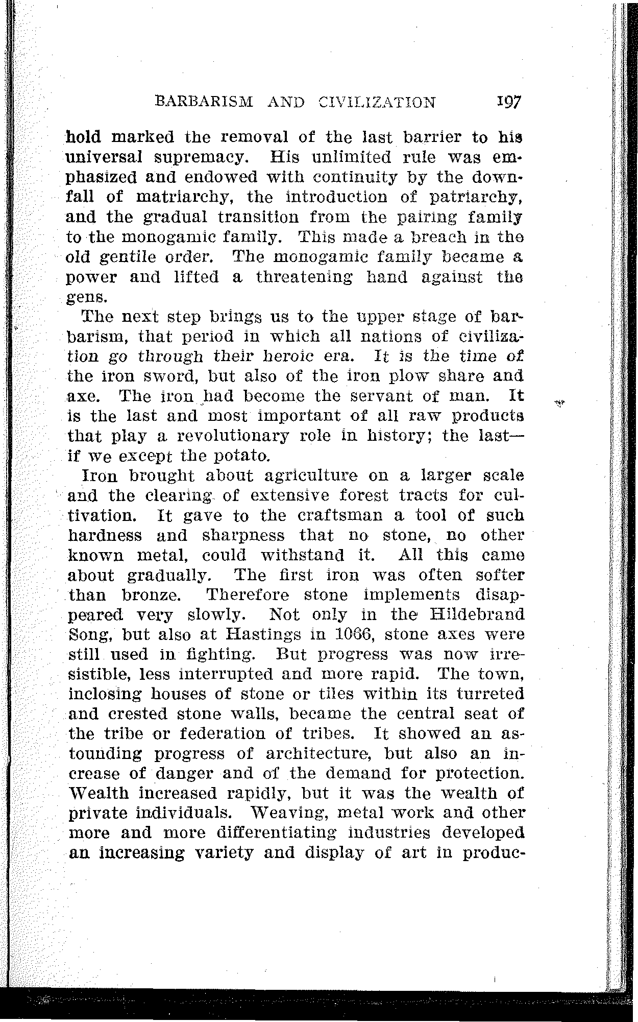 The next step brings us to the upper stage of barbarism, that period in which all nations of civilization go through their heroic era. It is the time of the iron sword, but also of the iron plow share and axe. The iron had become the servant of man. It is the last and most important of all raw products that play a revolutionary role in history; the last—if we except the potato.