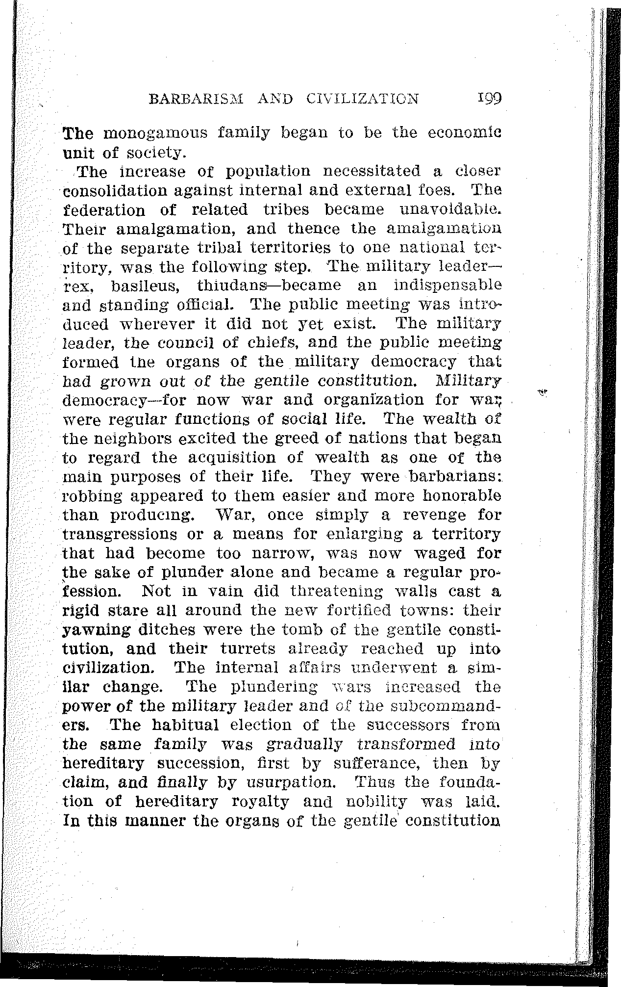 The increase of population necessitated a closer consolidation against internal and external foes. The federation of related tribes became unavoidable. Their amalgamation, and thence the amalgamation of the separate tribal territories to one national territory, was the following step. The military leader—rex, basileus, thiudans—became an indispensable and standing official. The public meeting was introduced wherever it did not yet exist. The military leader, the council of chiefs, and the public meeting formed the organs of the military democracy that had grown out of the gentile constitution. Military democracy—for now war and organization for war were regular functions of social life. The wealth of the neighbors excited the greed of nations that began to regard the acquisition of wealth as one of the main purposes of their life. They were barbarians: robbing appeared to them easier and more honorable than producing. War, once simply a revenge for transgressions or a means for enlarging a territory that had become too narrow, was now waged for the sake of plunder alone and became a regular profession. Not in vain did threatening walls cast a rigid stare all around the new fortified towns: their yawning ditches were the tomb of the gentile constitution, and their turrets already reached up into civilization. The internal affairs underwent a similar change. The plundering wars increased the power of the military leader and of the subcommanders. The habitual election of the successors from the same family was gradually transformed into hereditary succession, first by sufferance, then by claim, and finally by usurpation. Thus the foundation of hereditary royalty and nobility was laid. In this manner the organs of the gentile constitution[200] were gradually torn away from their roots in the nation, tribe, phratry and gens, and the whole gentile order reversed into its antithesis. The organization of tribes for the purpose of the free administration of affairs was turned into an organization for plundering and oppressing their neighbors. The organs of gentilism changed from servants of the public will to independent organs of rule oppressing their own people. This could not have happened, if the greed for wealth had not divided the gentiles into rich and poor; if the "difference of property in a gens had not changed the community of interest into antagonism of the gentiles" (Karl Marx); and if the extension of slavery had not begun by branding work for a living as slavish and more ignominious than plundering.