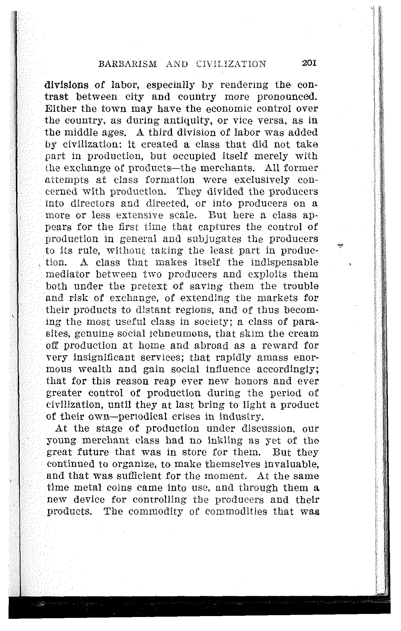 We have now reached the threshold of civilization. This stage is inaugurated by a new progress in the division of labor. In the lower stage of barbarism production was carried on for use only; any acts of exchange were confined to single cases when a surplus was accidentally realized. In the middle stage of barbarism we find that the possession of cattle gave a regular surplus to the nomadic nations with sufficiently large herds. At the same time there was a division of labor between nomadic nations and backward nations without herds. The existence of two different stages of production side by side furnished the conditions necessary for a regular exchange. The upper stage of barbarism introduced a new division of labor between agriculture and handicrafts, resulting in the production of a continually increasing amount of commodities for the special purpose of exchange, so that exchange between individuals became a vital function of society. Civilization strengthened and intensified all the established[201] divisions of labor, especially by rendering the contrast between city and country more pronounced. Either the town may have the economic control over the country, as during antiquity, or vice versa, as in the middle ages. A third division of labor was added by civilization: it created a class that did not take part in production, but occupied itself merely with the exchange of products—the merchants. All former attempts at class formation were exclusively concerned with production. They divided the producers into directors and directed, or into producers on a more or less extensive scale. But here a class appears for the first time that captures the control of production in general and subjugates the producers to its rule, without taking the least part in production. A class that makes itself the indispensable mediator between two producers and exploits them both under the pretext of saving them the trouble and risk of exchange, of extending the markets for their products to distant regions, and of thus becoming the most useful class in society; a class of parasites, genuine social ichneumons, that skim the cream off production at home and abroad as a reward for very insignificant services; that rapidly amass enormous wealth and gain social influence accordingly; that for this reason reap ever new honors and ever greater control of production during the period of civilization, until they at last bring to light a product of their own—periodical crises in industry.