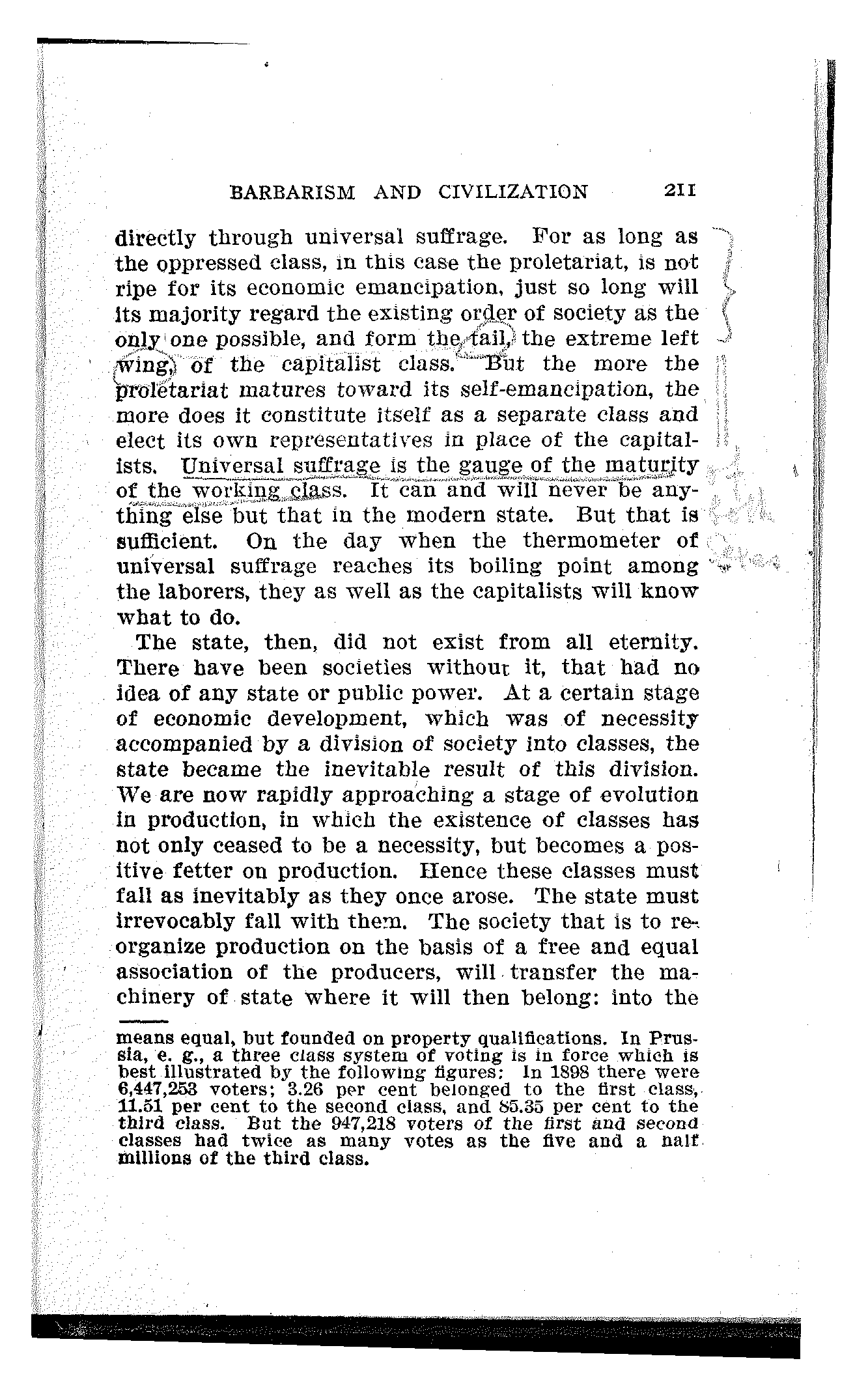 In most of the historical states, the rights of the citizens are differentiated according to their wealth. This is a direct confirmation of the fact that the state is organized for the protection of the possessing against the non-possessing classes. The Athenian and Roman classification by incomes shows this. It is also seen in the medieval state of feudalism in which the political power depended on the quantity of real estate. It is again seen in the electoral qualifications of the modern representative state. The political recognition of the differences in wealth is by no means essential. On the contrary, it marks a low stage of state development. The highest form of the state, the democratic republic, knows officially [210]nothing of property distinctions.[42] It is that form of the state which under modern conditions of society becomes more and more an unavoidable necessity. The last decisive struggle between proletariat and bourgeoisie can only be fought out under this state form.[43] In such a state, wealth exerts its power indirectly, but all the more safely. This is done partly in the form of direct corruption of officials, after the classical type of the United States, or in the form of an alliance between government and bankers which is established all the more easily when the public debt increases and when corporations concentrate in their hands not only the means of transportation, but also production itself, using the stock exchange as a center. The United States and the latest French republic are striking examples, and good old Switzerland has contributed its share to illustrate this point. That a democratic republic is not necessary for this fraternal bond between stock exchange and government is proved by England and last, not least, Germany, where it is doubtful whether Bismarck or Bleichroeder was more favored by the introduction of universal suffrage.[44] The possessing class rules[211] directly through universal suffrage. For as long as the oppressed class, in this case the proletariat, is not ripe for its economic emancipation, just so long will its majority regard the existing order of society as the only one possible, and form the tail, the extreme left wing, of the capitalist class. But the more the proletariat matures toward its self-emancipation, the more does it constitute itself as a separate class and elect its own representatives in place of the capitalists. Universal suffrage is the gauge of the maturity of the working class. It can and will never be anything else but that in the modern state. But that is sufficient. On the day when the thermometer of universal suffrage reaches its boiling point among the laborers, they as well as the capitalists will know what to do.