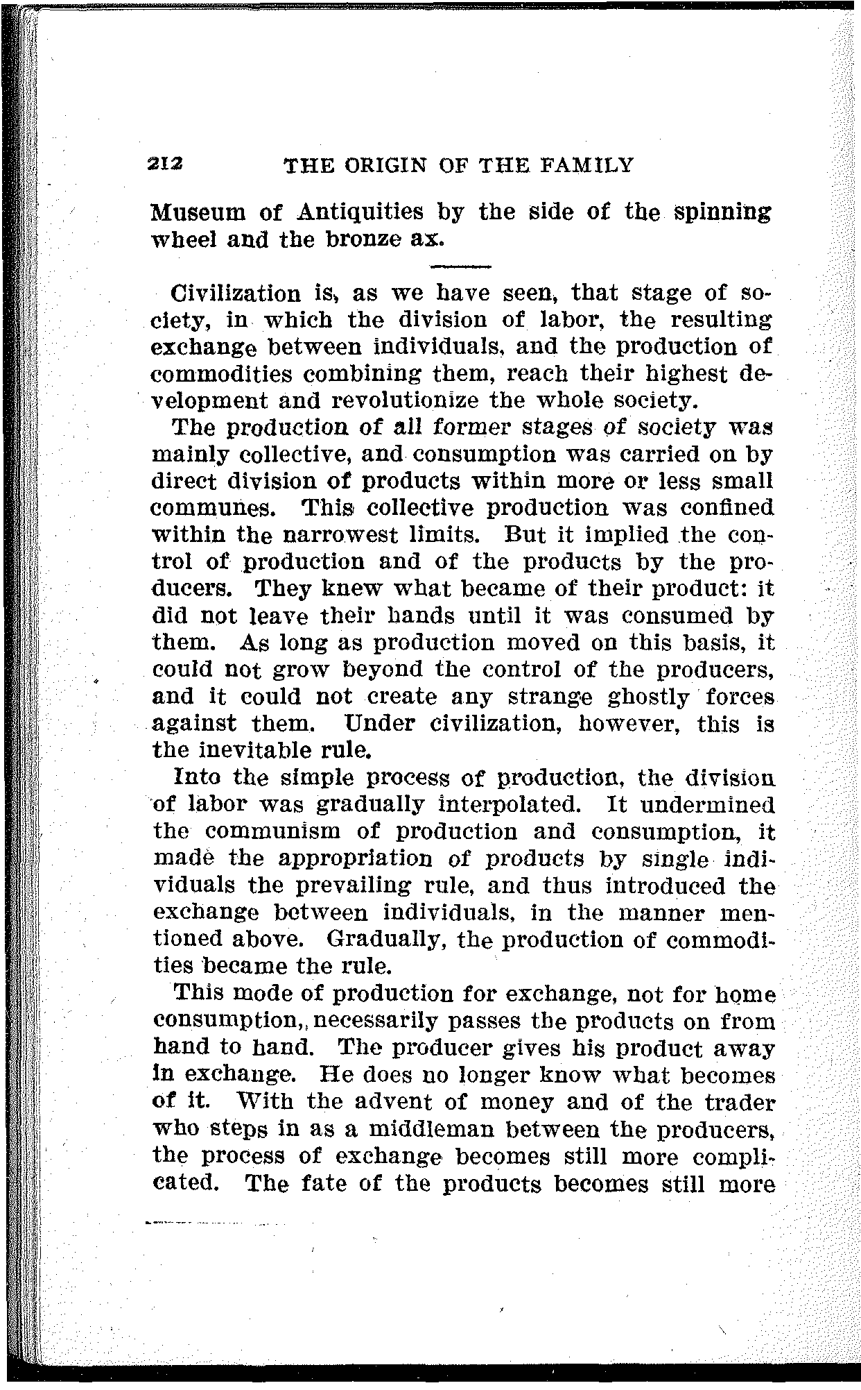 The production of all former stages of society was mainly collective, and consumption was carried on by direct division of products within more or less small communes. This collective production was confined within the narrowest limits. But it implied the control of production and of the products by the producers. They knew what became of their product: it did not leave their hands until it was consumed by them. As long as production moved on this basis, it could not grow beyond the control of the producers, and it could not create any strange ghostly forces against them. Under civilization, however, this is the inevitable rule.