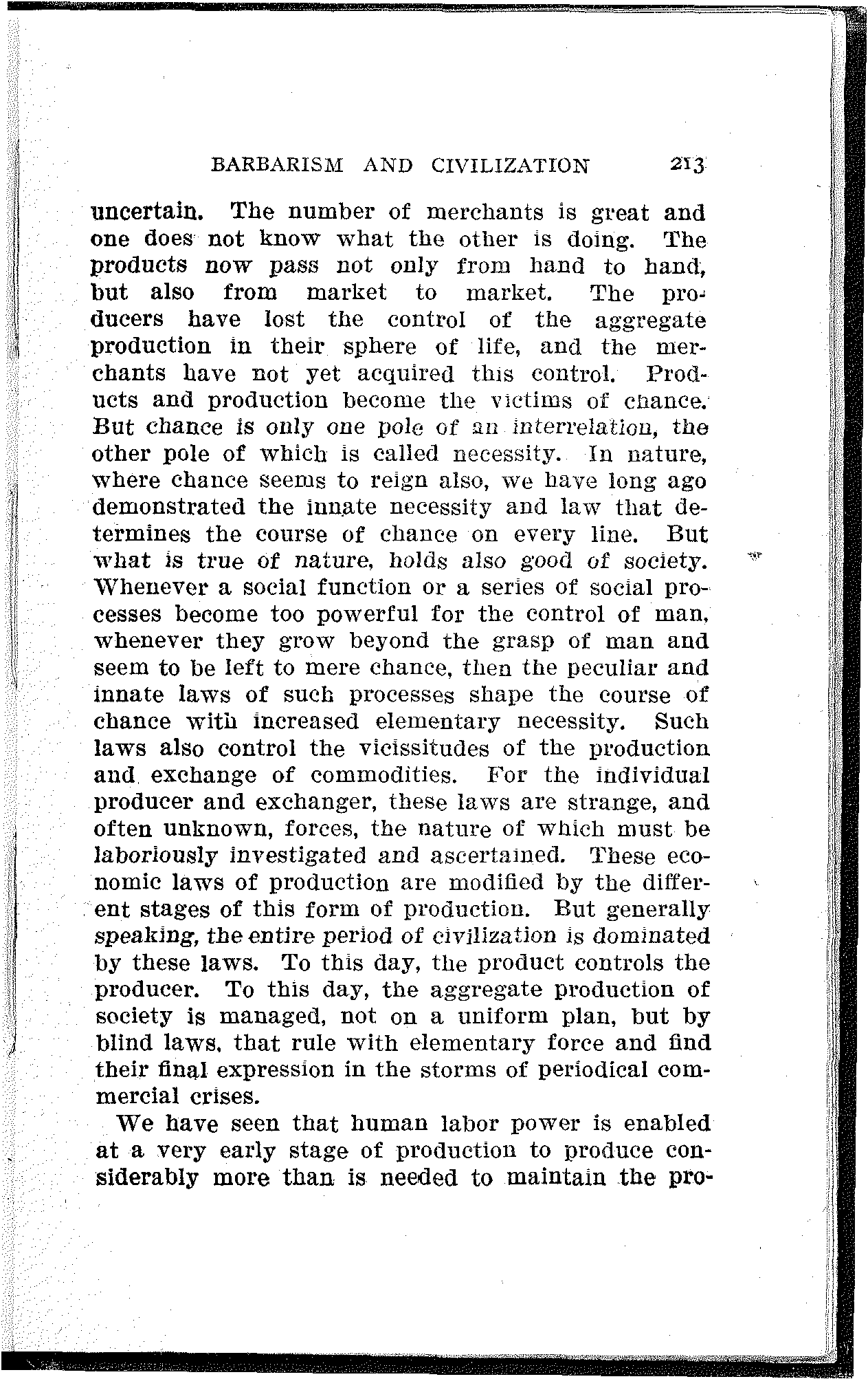 This mode of production for exchange, not for home consumption, necessarily passes the products on from hand to hand. The producer gives his product away in exchange. He does no longer know what becomes of it. With the advent of money and of the trader who steps in as a middleman between the producers, the process of exchange becomes still more complicated. The fate of the products becomes still more[213] uncertain. The number of merchants is great and one does not know what the other is doing. The products now pass not only from hand to hand, but also from market to market. The producers have lost the control of the aggregate production in their sphere of life, and the merchants have not yet acquired this control. Products and production become the victims of chance. But chance is only one pole of an interrelation, the other pole of which is called necessity. In nature, where chance seems to reign also, we have long ago demonstrated the innate necessity and law that determines the course of chance on every line. But what is true of nature, holds also good of society. Whenever a social function or a series of social processes become too powerful for the control of man, whenever they grow beyond the grasp of man and seem to be left to mere chance, then the peculiar and innate laws of such processes shape the course of chance with increased elementary necessity. Such laws also control the vicissitudes of the production and exchange of commodities. For the individual producer and exchanger, these laws are strange, and often unknown, forces, the nature of which must be laboriously investigated and ascertained. These economic laws of production are modified by the different stages of this form of production. But generally speaking, the entire period of civilization is dominated by these laws. To this day, the product controls the producer. To this day, the aggregate production of society is managed, not on a uniform plan, but by blind laws, that rule with elementary force and find their final expression in the storms of periodical commercial crises.