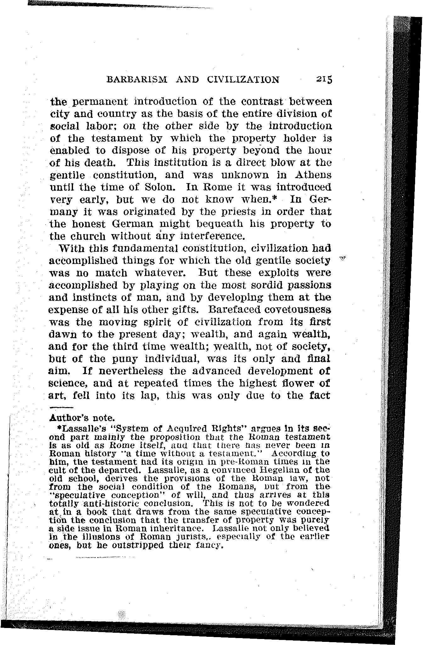 Lassalle's "System of Acquired Rights" argues in its second part mainly the proposition that the Roman testament is as old as Rome itself, and that there has never been in Roman history "a time without a testament." According to him, the testament had its origin in pre-Roman times in the cult of the departed. Lassalle, as a convinced Hegelian of the old school, derives the provisions of the Roman law, not from the social condition of the Romans, but from the "speculative conception" of will, and thus arrives at this totally anti-historic conclusion. This is not to be wondered at in a book that draws from the same speculative conception the conclusion that the transfer of property was purely a side issue in Roman inheritance. Lassalle not only believed in the illusions of Roman jurists, especially of the earlier ones, but he outstripped their fancy.