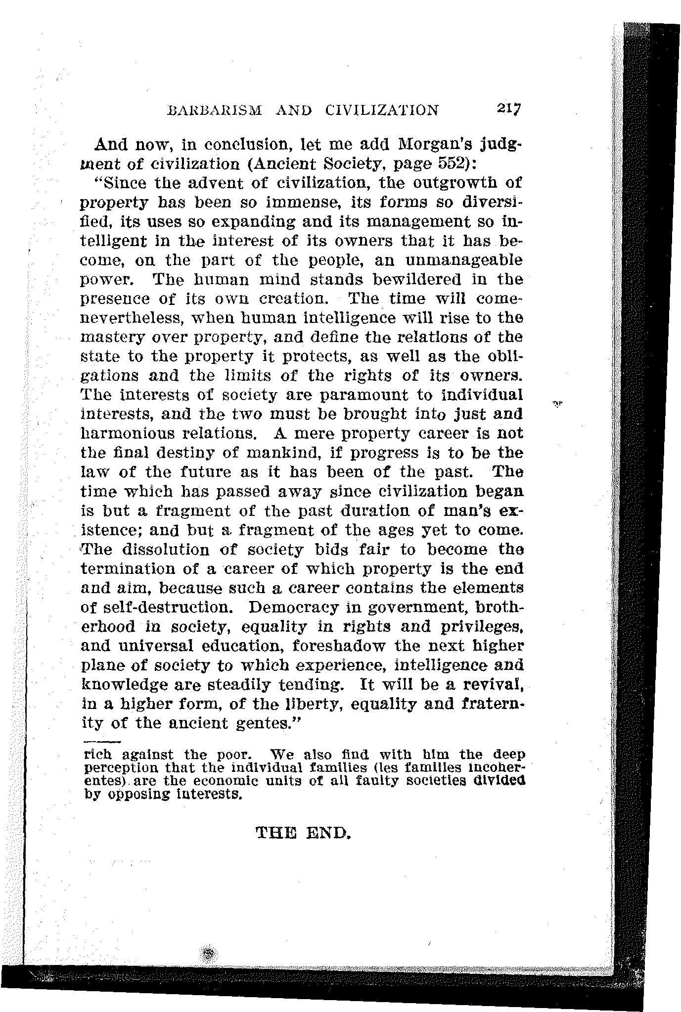And now, in conclusion, let me add Morgan's judgment of civilization (Ancient Society, page 552):