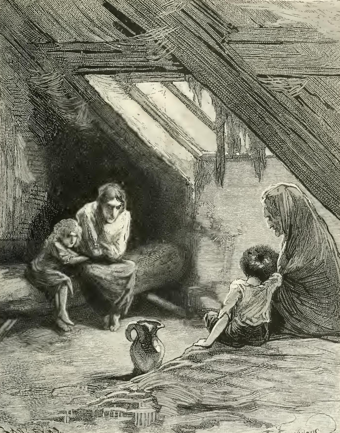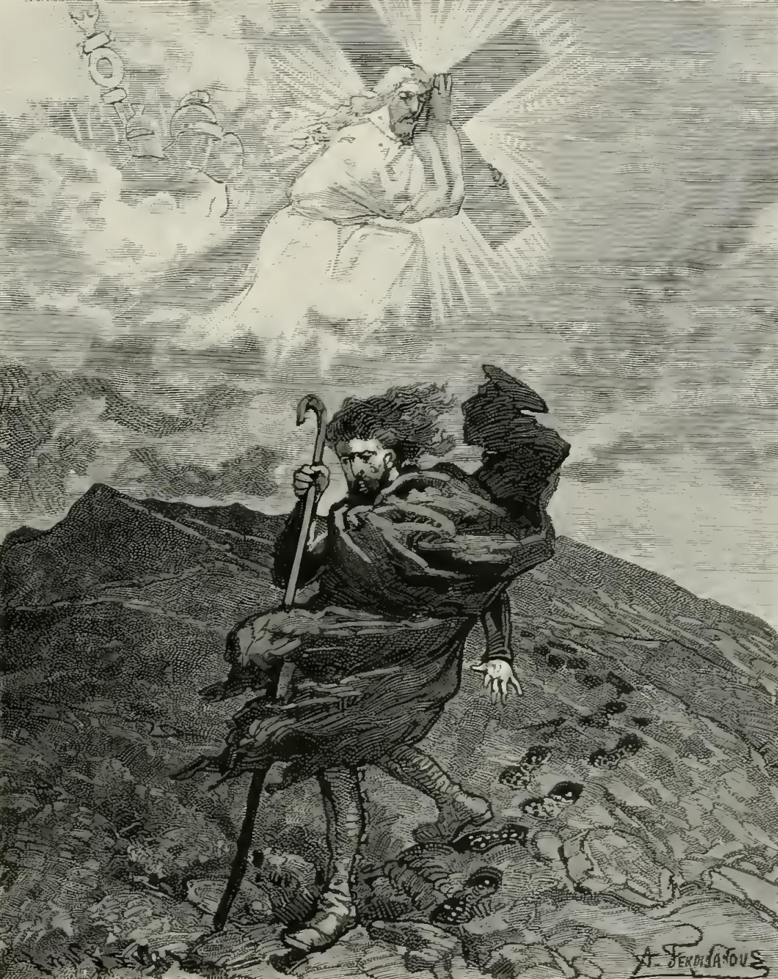 “Courage and hope, my brother! Think how after the expiration cometh pardon, and pardon is followed by a blessing. The Lord punished, in you and your posterity, the artisan rendered wicked by misfortune and injustice. He said to you: ‘Go on! without truce or rest—and your labor shall be vain—and every evening, throwing yourself on the hard ground, you shall be no nearer to the end of your eternal course!’—And so, for centuries, men without pity have said to the artisan: ‘Work! work! work! without truce or rest—and your labor shall be fruitful for all others, but fruitless for yourself—and every evening, throwing yourself on the hard ground, you shall be no nearer to happiness and repose; and your wages shall only suffice to keep you alive in pain, privation, and poverty!’”