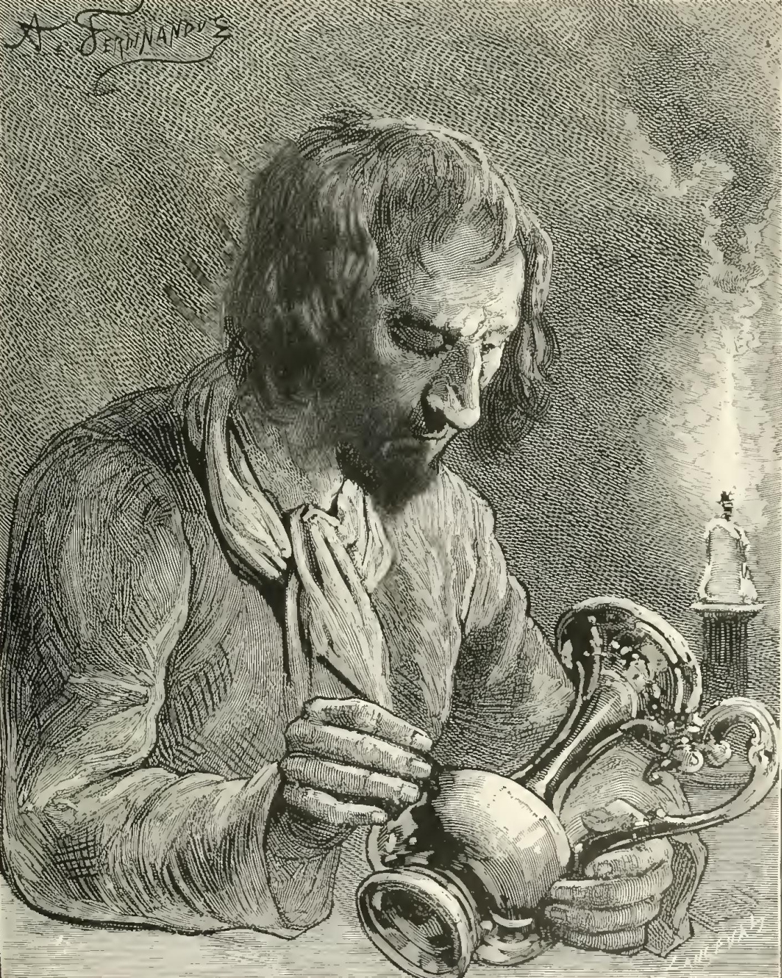 Hardly had he uttered these words, before through the open-work of the iron casket rose a light cloud of smoke, and an odor as of burnt paper spread itself through the room. Rodin understood it instantly. “Fire!” he exclaimed, as he rushed forward to seize the casket. It had been made fast to the heavy marble slab.