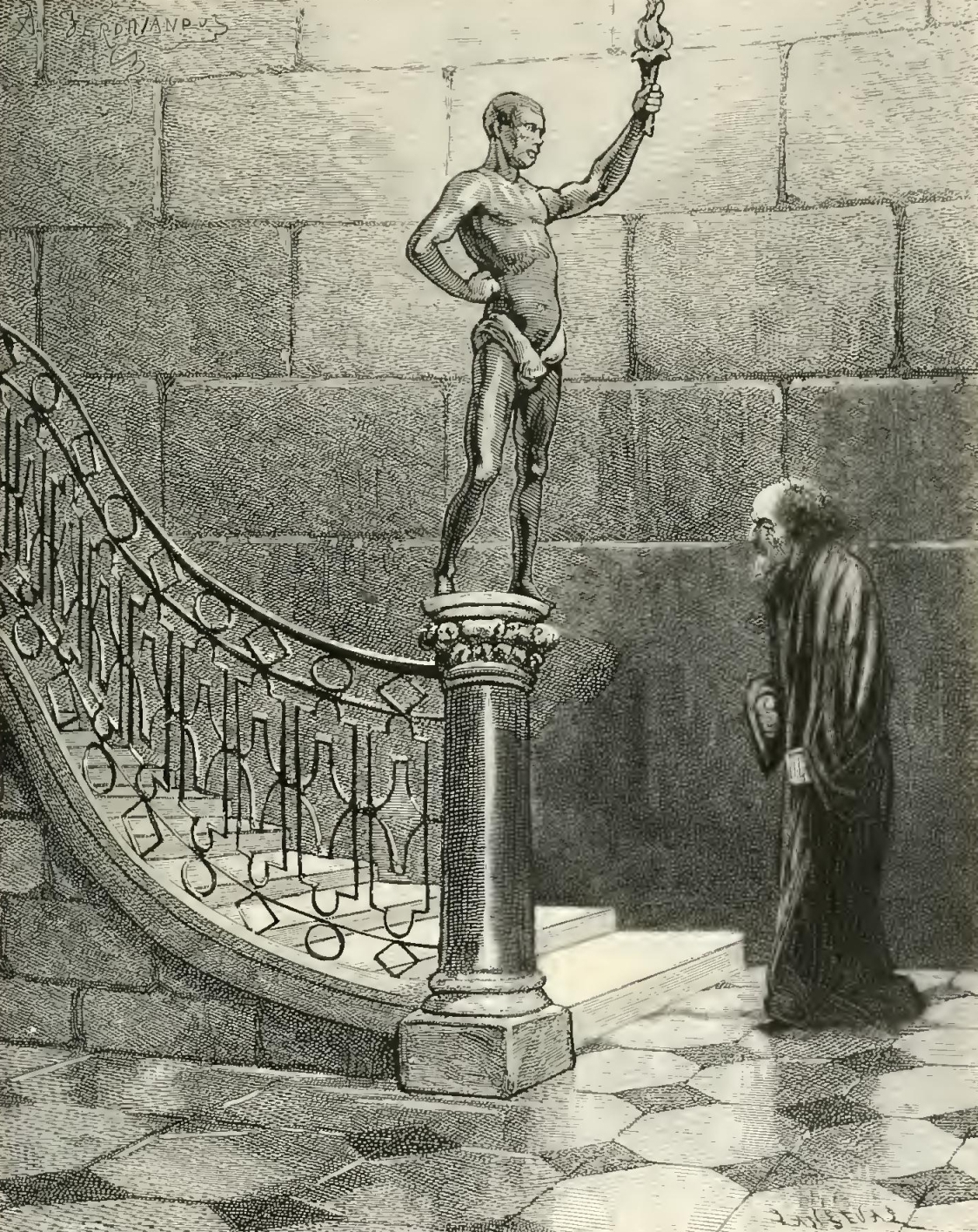 Samuel continued to ascend, and, at a turn of the staircase, the two Jesuits could see by the pale light of the little lamp, the profile of the old Israelite, in the space left between the iron balustrade and the wall, as he climbed on with difficulty above them. Rodin was struck with the expression of Samuel’s countenance. His black eyes, generally so calm, sparkled with ardor. His features, usually impressed with a mixture of sorrow, intelligence, and goodness, seemed to grow harsh and stern, and his thin lips wore a strange smile.