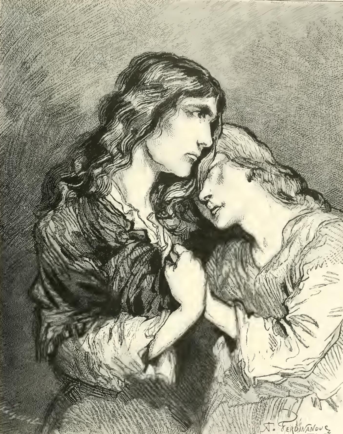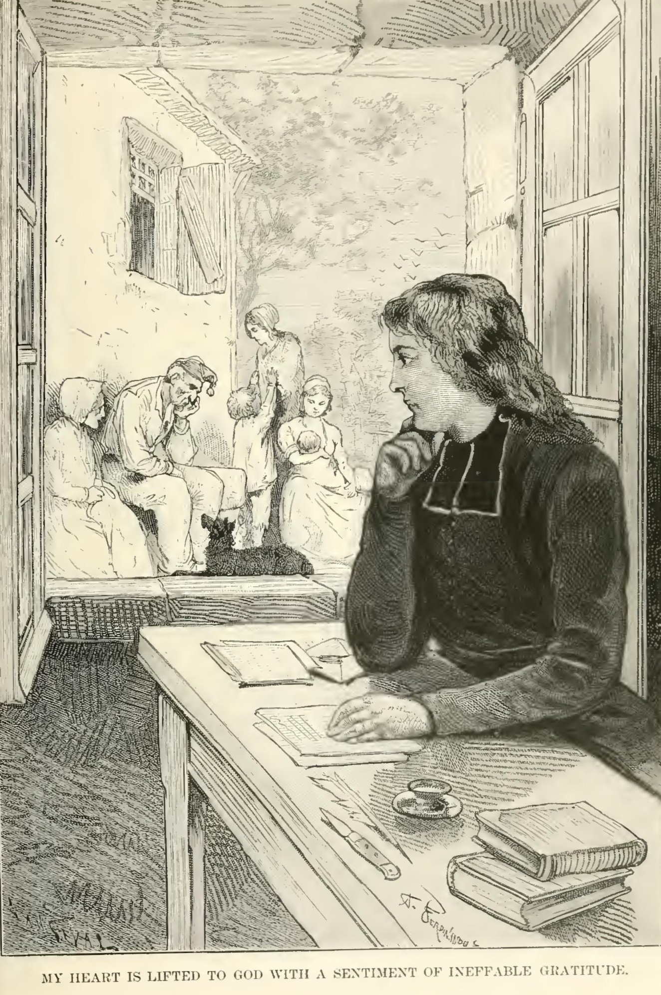 “Intending to write to you yesterday, my bear Joseph, I seated myself at the little old black table, that you will remember well. My window looks, you know, upon the farmyard, and I can see all that takes place there. These are grave preliminaries, my friend, but I am coming to the point. I had just taken my seat at the table, when, looking from the window, this is what I saw. You, my dear Joseph, who can draw so well, should have been there to have sketched the charming scene. The sun was sinking, the sky serene, the air warm and balmy with the breath of the hawthorn, which, flowering by the side of a little rivulet, forms the edge which borders the yard. Under the large pear-tree, close to the wall of the barn, sat upon the stone bench my adopted father, Dagobert, that brave and honest soldier whom you love so much. He appeared thoughtful, his white head was bowed on his bosom; with absent mind, he patted old Spoil-sport, whose intelligent face was resting on his master’s knees. By his side was his wife, my dear adopted mother, occupied with her sewing; and near them, on a stool, sat Angela, the wife of Agricola, nursing her last-born child, while the gentle Magdalen, with the eldest boy in her lap, was occupied in teaching him the letters of the alphabet. Agricola had just returned from the fields, and was beginning to unyoke his cattle, when, struck, like me, no doubt, with this picture, he stood gazing on it for a moment, with his hand still leaning on the yoke, beneath which bent submissive the broad foreheads of his two large black oxen. I cannot express to you, my friend, the enchanting repose of this picture, lighted by the last rays of the sun, here and there broken by the thick foliage. What various and touching types! The venerable face of the soldier—the good, loving countenance of my adopted mother—the fresh beauty of Angela, smiling on her little child—the soft melancholy of the hunchback, now and then pressing her lips to the fair, laughing cheek of Agricola’s eldest son—and then Agricola himself, in his manly beauty, which seems to reflect so well the valor and honesty of his heart! Oh, my Friend! in contemplating this assemblage of good, devoted, noble, and loving beings, so dear to each other, living retired in a little farm of our poor Sologne, my heart rose towards heaven with a feeling of ineffable gratitude. This peace of the family circle—this clear evening, with the perfume of the woods and wild flowers wafted on the breeze—this deep silence, only broken by the murmur of the neighboring rill—all affected me with one of these passing fits of vague and sweet emotion, which one feels but cannot express. You well know it, my friend, who, in your solitary walks, in the midst of your immense plains of flowering heath, surrounded by forests of fir trees, often feel your eyes grow moist, without being able to explain the cause of that sweet melancholy, which I, too, have often felt, during those glorious nights passed in the profound solitudes of America.