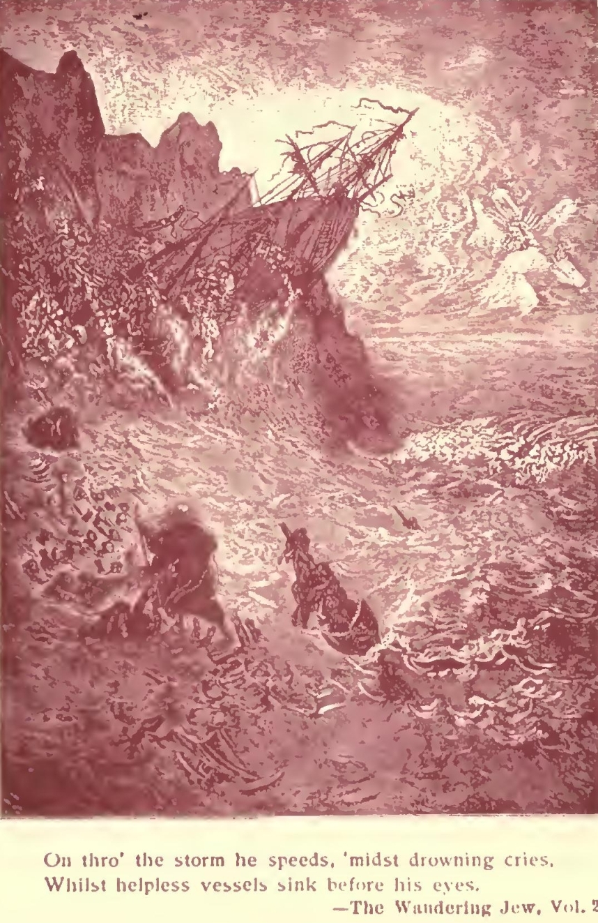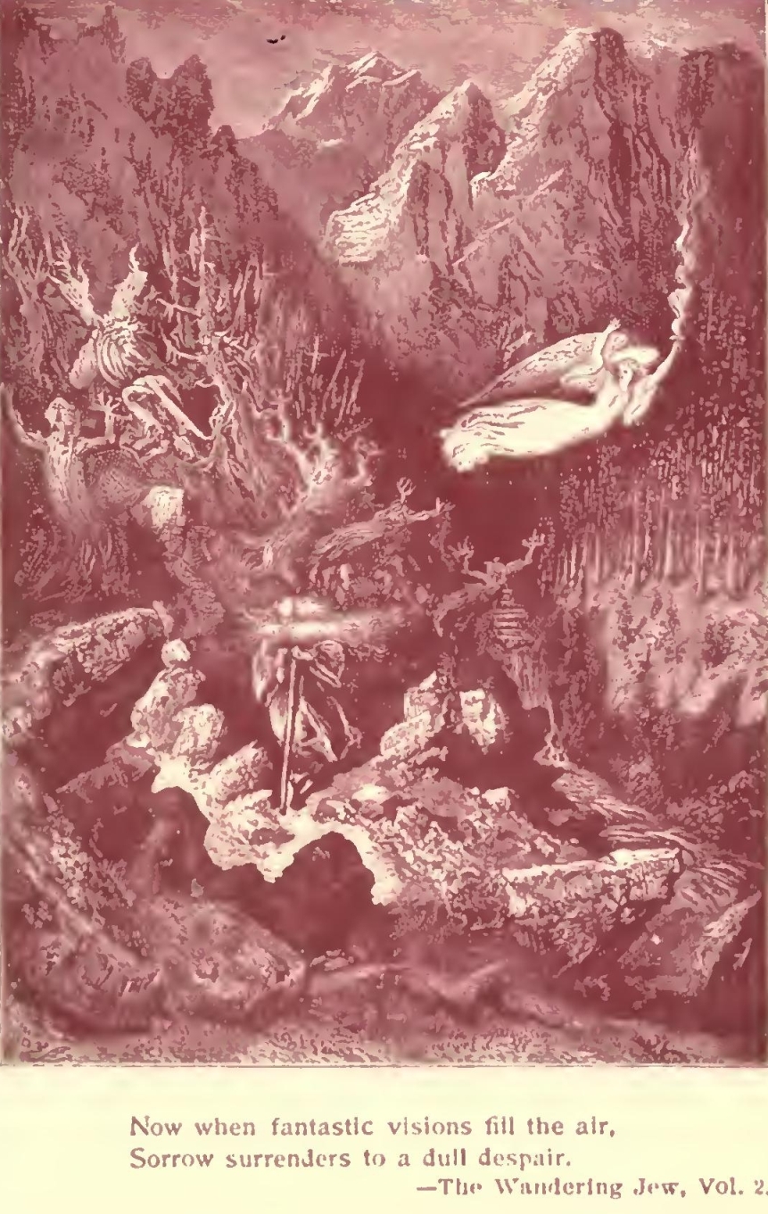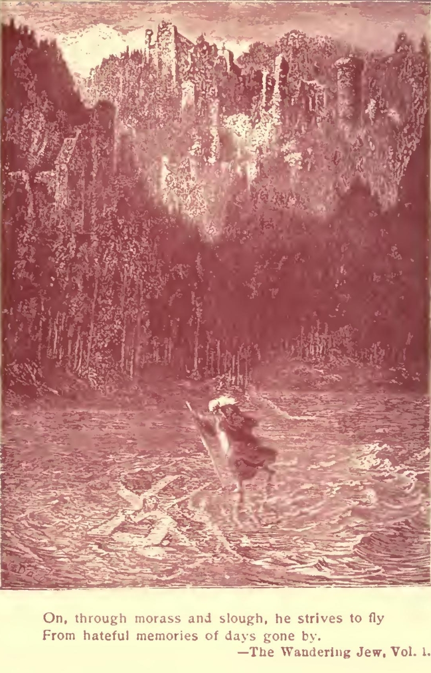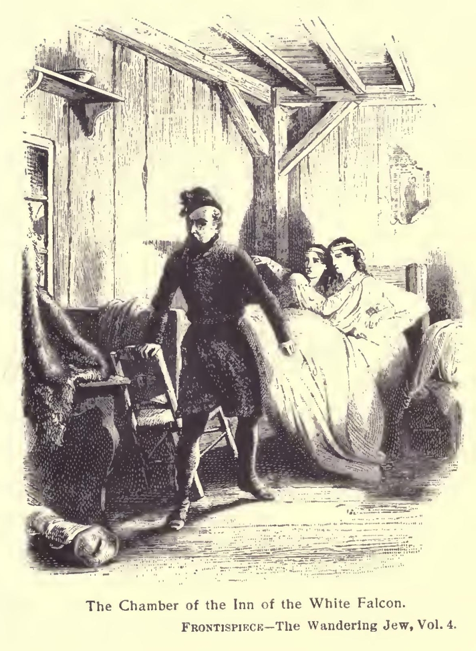 More and more the novel appealed to his imagination and suited his gifts. His themes ranged from the fabulous to the strictly historical, and he became popular as a writer of romance and fictionized fact. His plays, however, were persistent failures. When he published “The Mysteries of Paris”, his national fame was assured, and with the writing of “The Wandering Jew” he achieved world-wide renown. Then, at the height of his literary career, Eugene Sue was driven into exile after Louis Napoleon overthrew the Constitutional Government in a coup d’etat and had himself officially proclaimed Emperor Napoleon III. The author of “The Wandering Jew” died in banishment five years later.