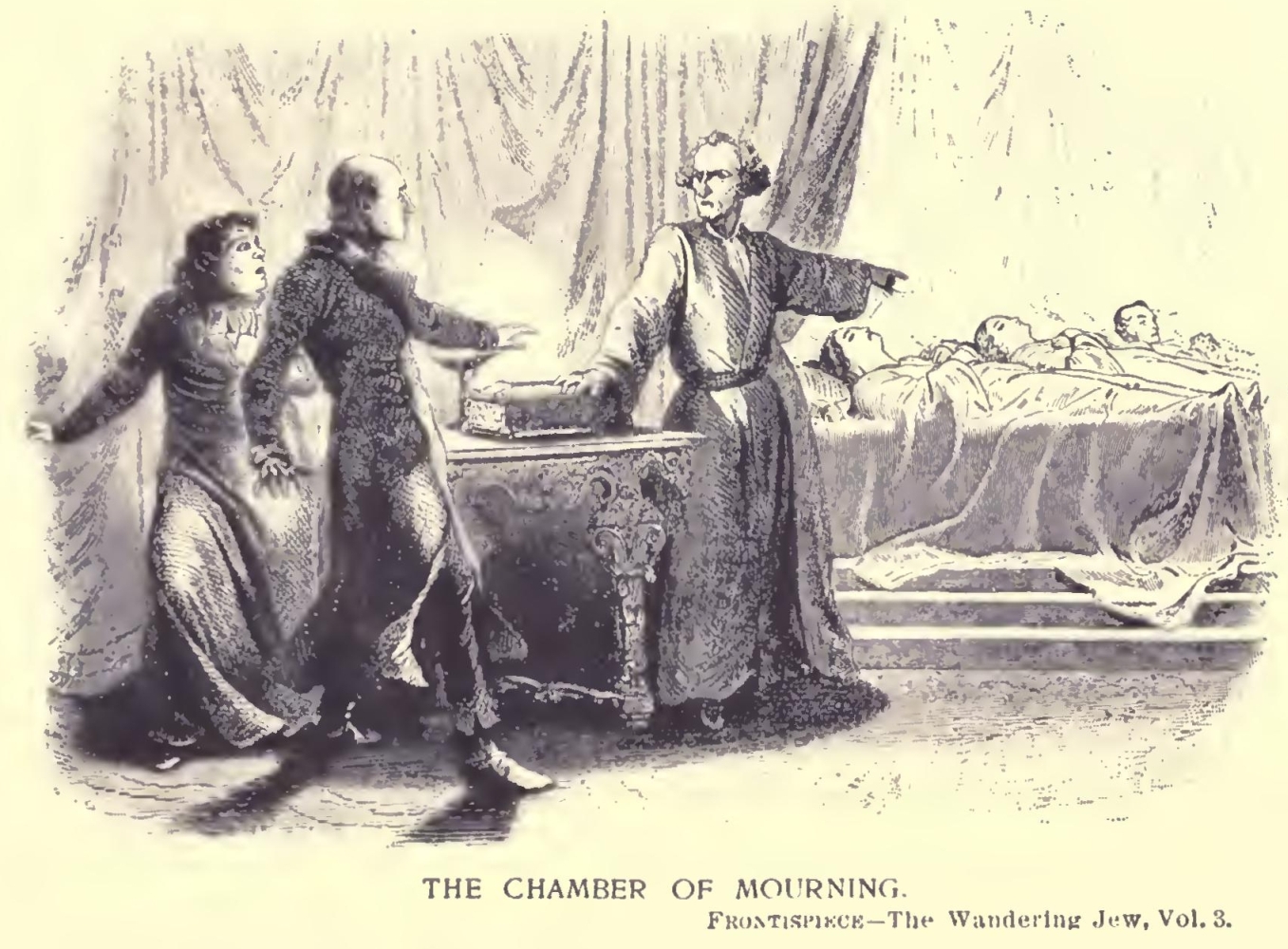 Samuel made no answer. He stamped his foot, and extended his arm slowly towards the extremity of the apartment. Then Rodin and Father Caboccini beheld an awful spectacle. The draperies on the wall were drawn aside, as if by an invisible hand. Round a funeral vault, faintly illumined-by the bluish light of a silver lamp, six dead bodies were ranged upon black biers, dressed in long black robes. They were: Jacques Rennepont—Francois Hardy—Rose and Blanche Simon—Adrienne and Djalma. They appeared to be asleep. Their eyelids were closed, their hands crossed over their breasts. Father Caboccini, trembling in every limb, made the sign of the cross, and retreating to the opposite wall, buried his face in his hands. Rodin on the contrary, with agitated countenance, staring eyes, and hair standing on end, yielding to an invincible attraction, advanced towards those inanimate forms. One would have said that these last of the Renneponts had only just expired. They seemed to be in the first hour of the eternal sleep.(44)