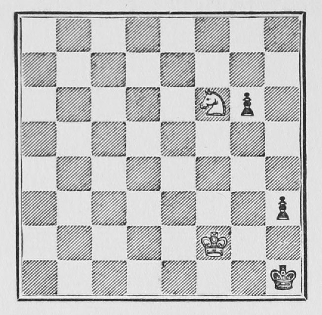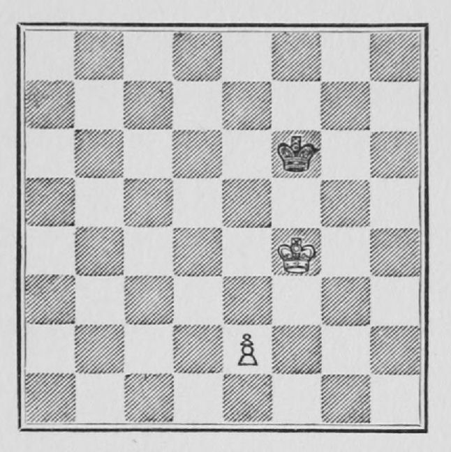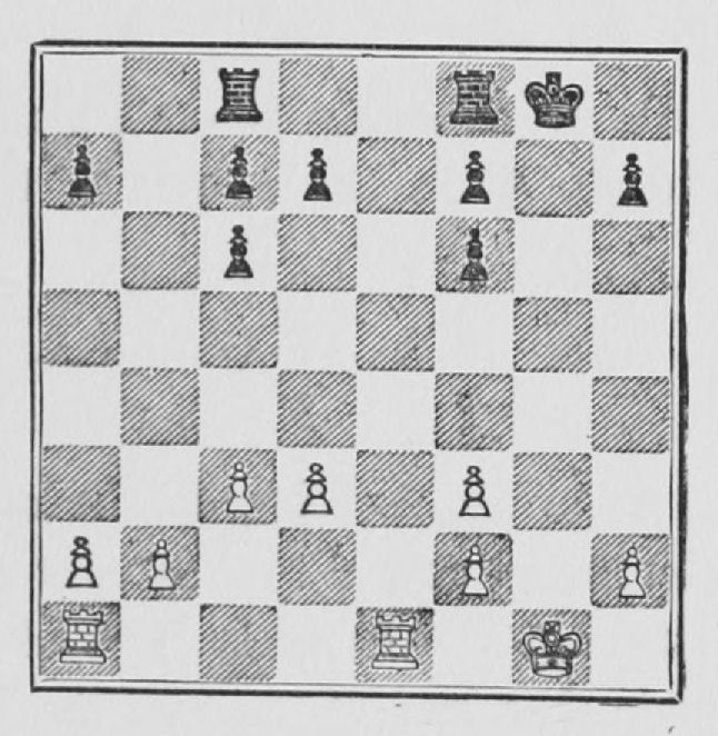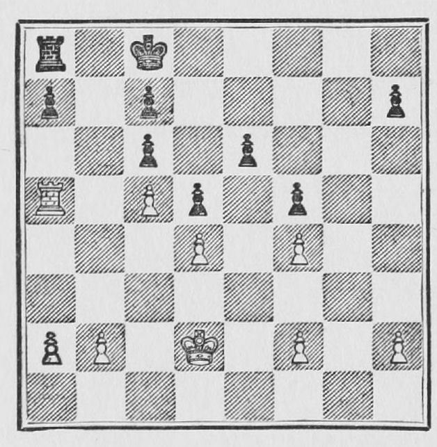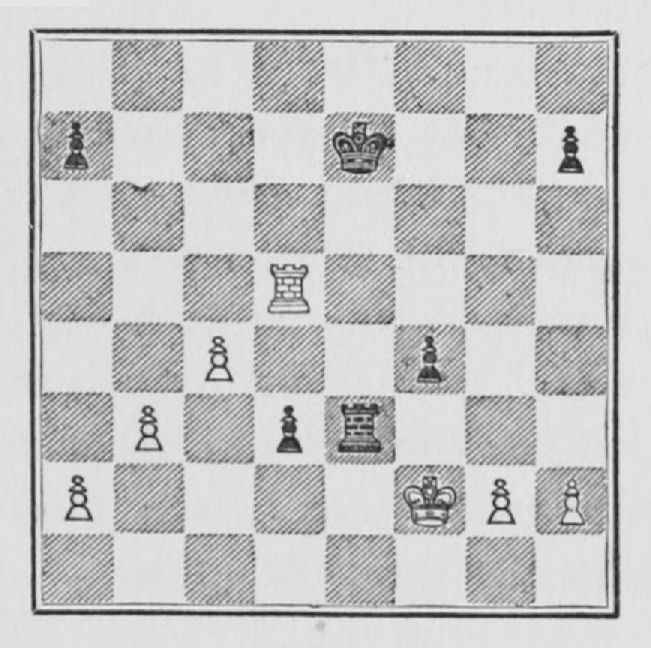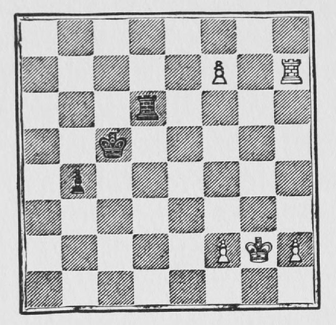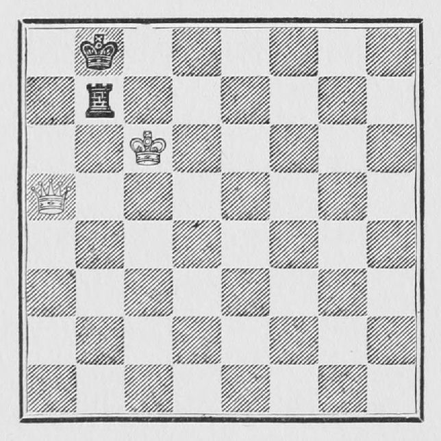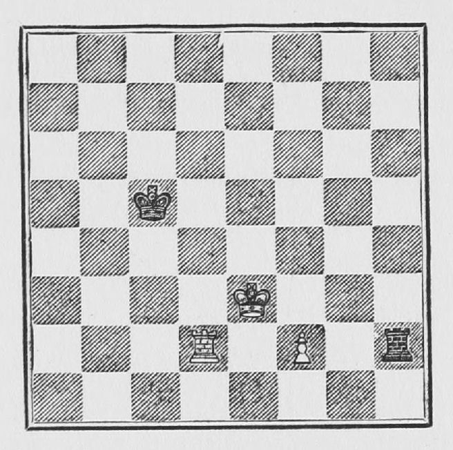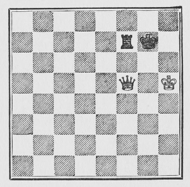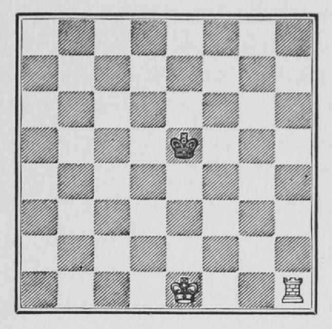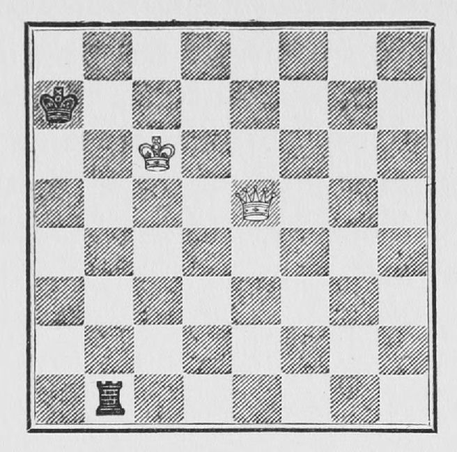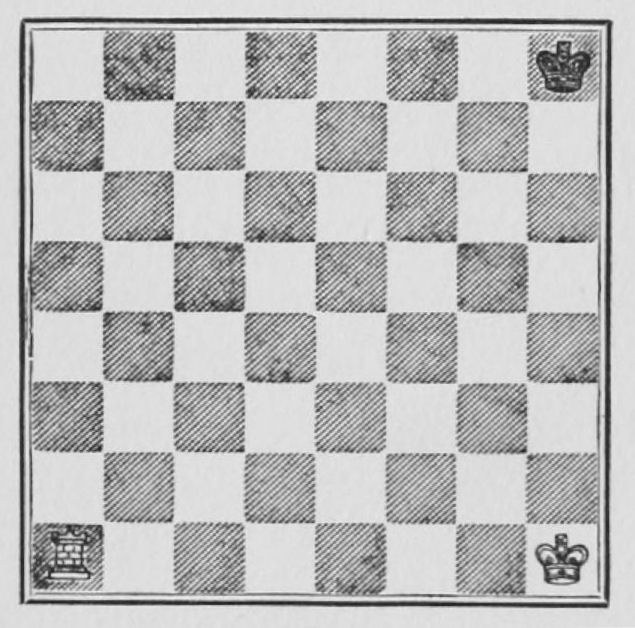 In this position the power of the Rook is demonstrated by the first move, R - R 7, which immediately confines the Black King to the last rank, and the mate is quickly accomplished by: 1 R - R 7, K - Kt 1; 2 K - Kt 2.