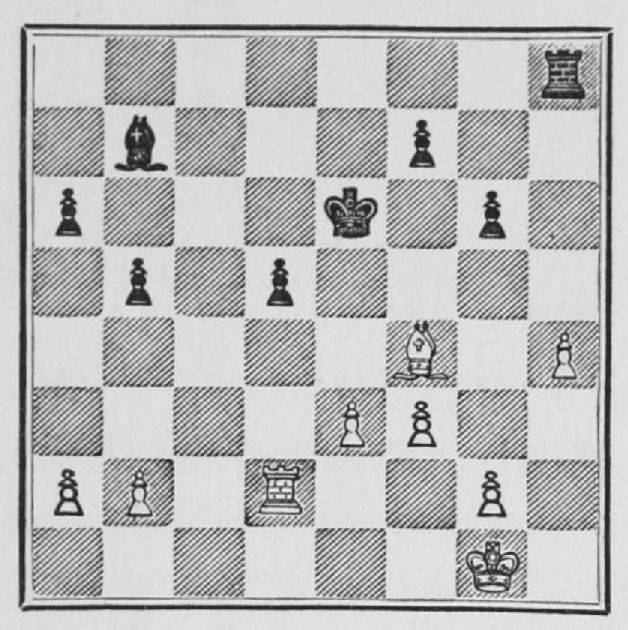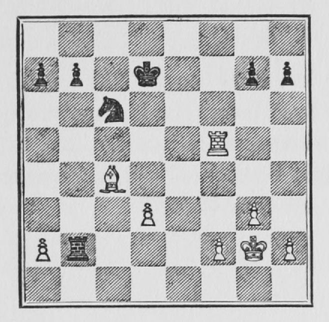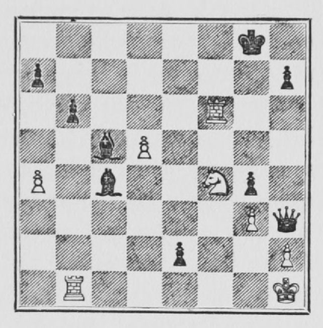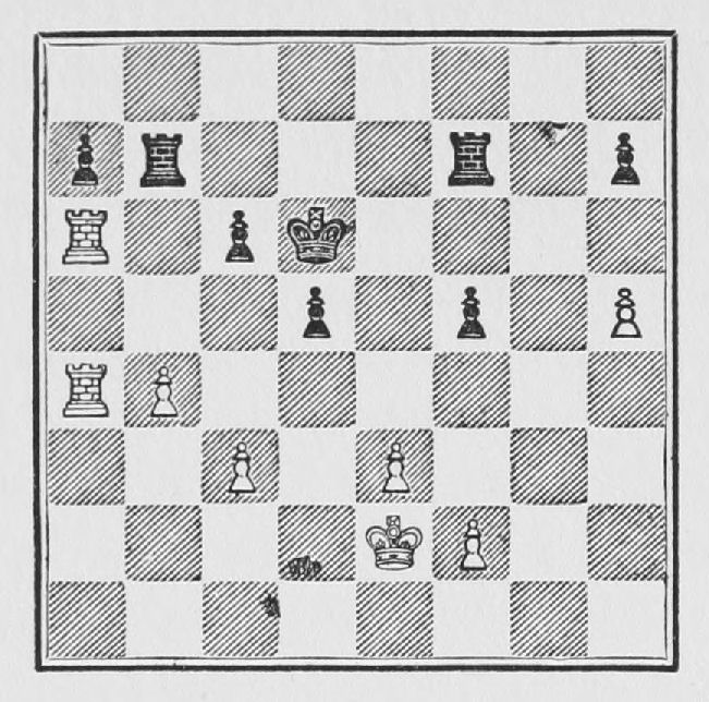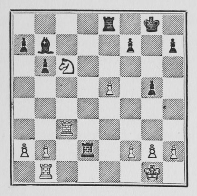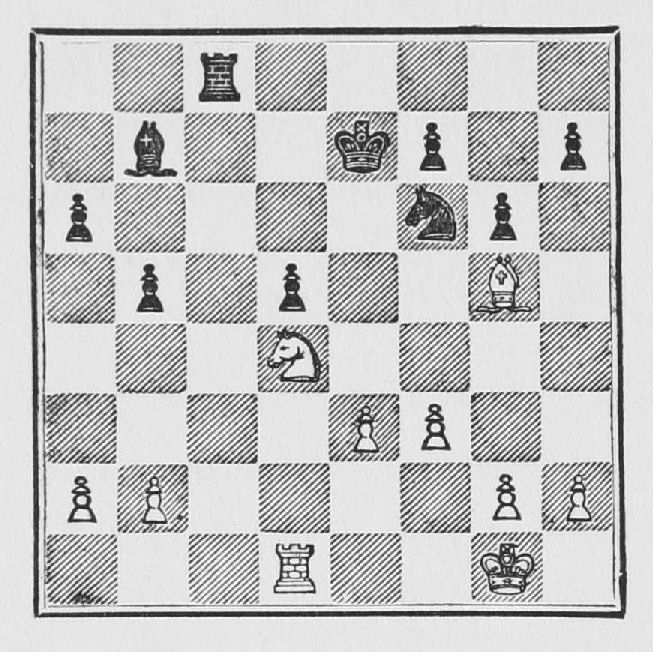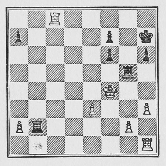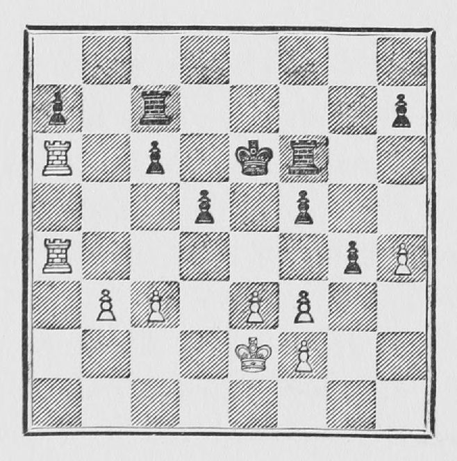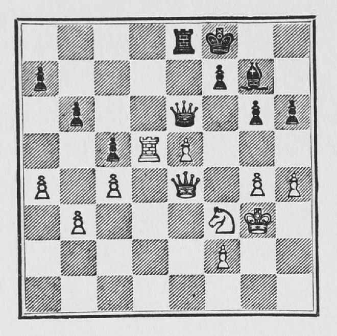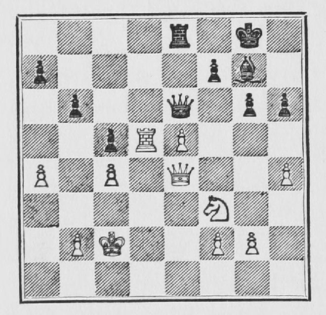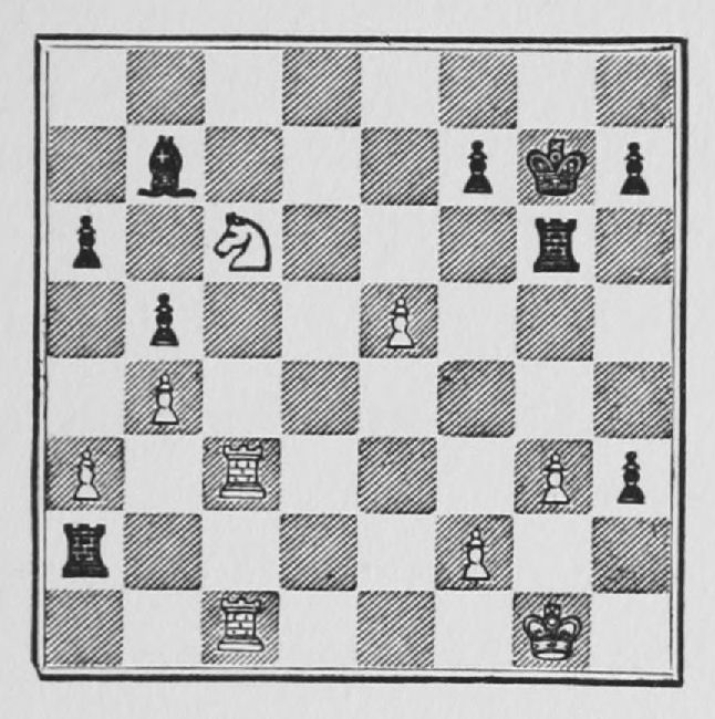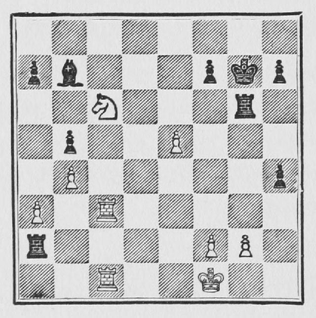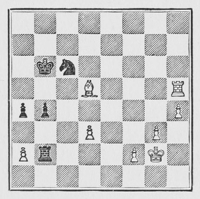 Notice the remarkable position of the pieces. White cannot move anything without incurring some loss. His best chance would have been to play 29 P - K 6, but that would only have prolonged the game, which is lost in any case.